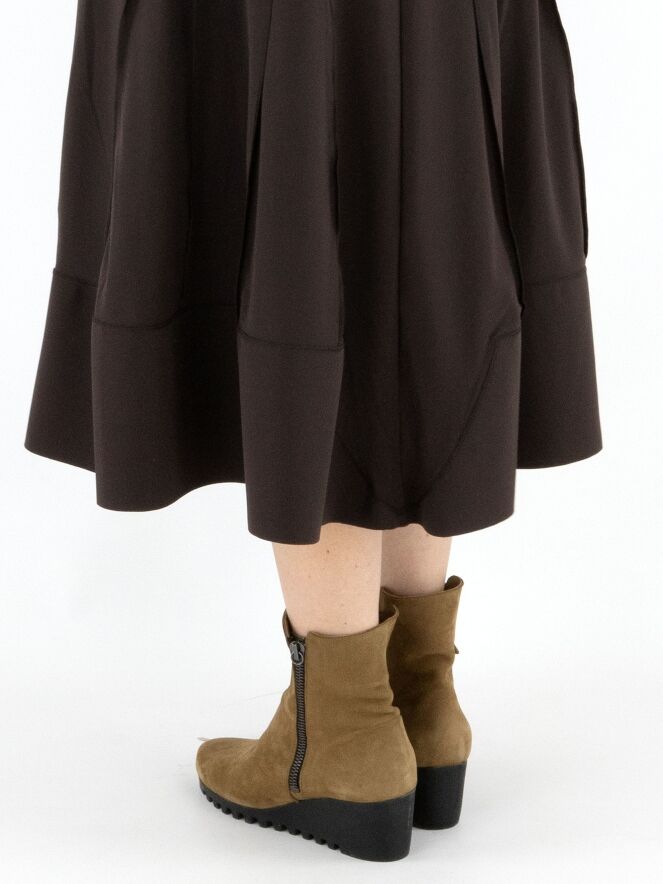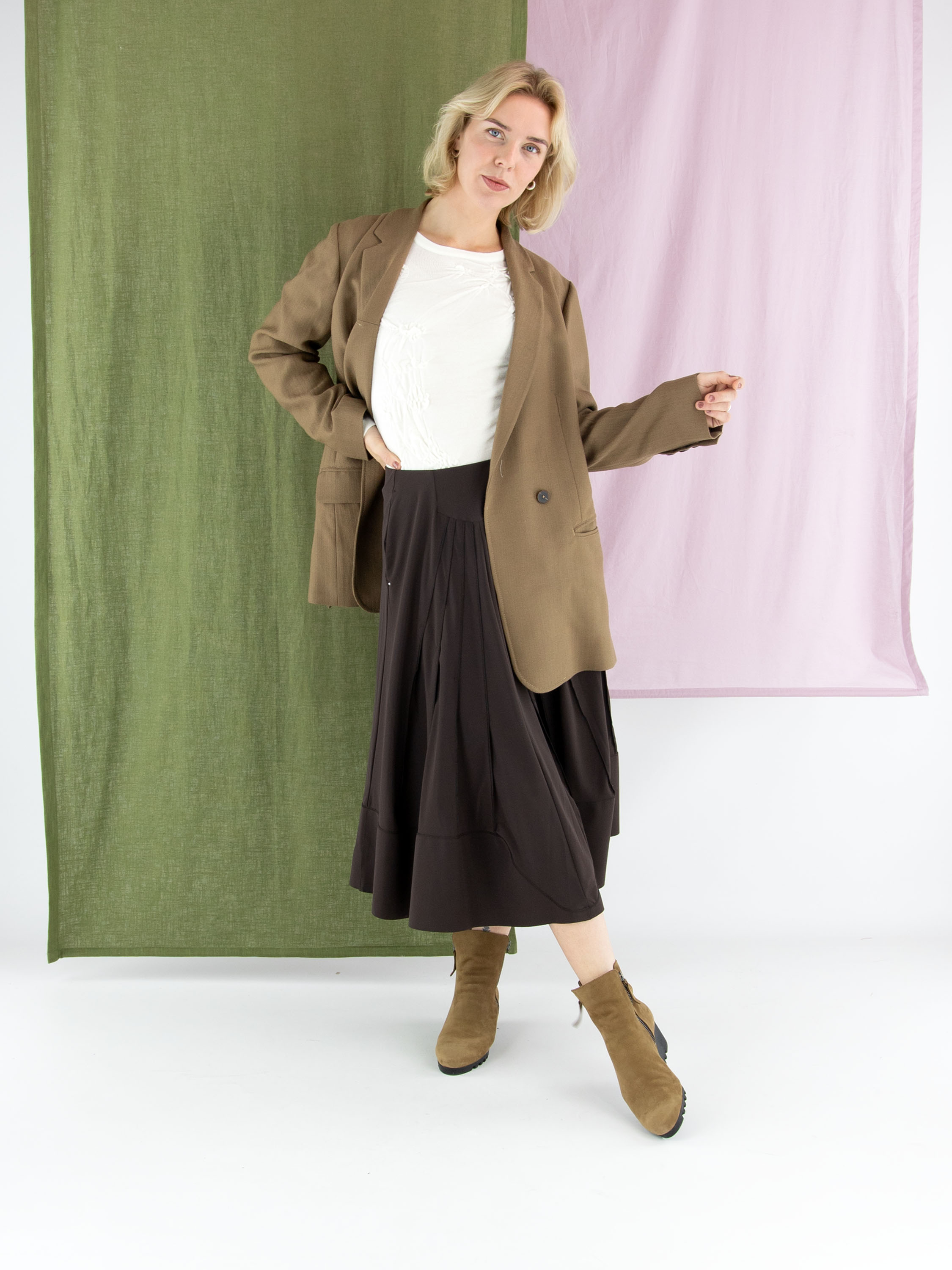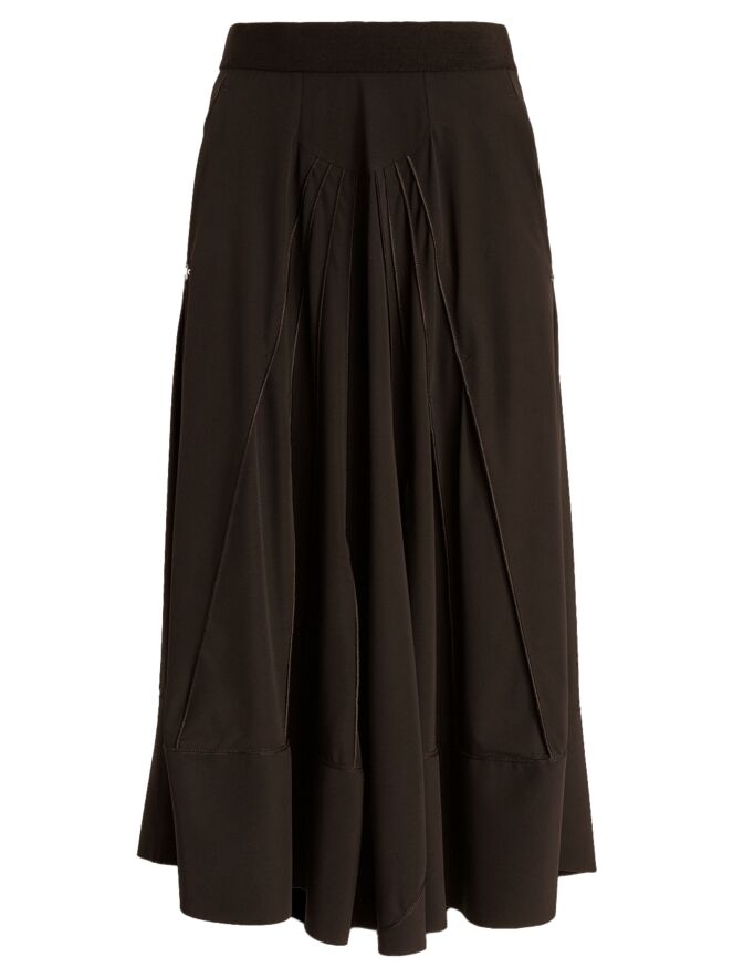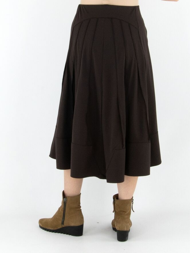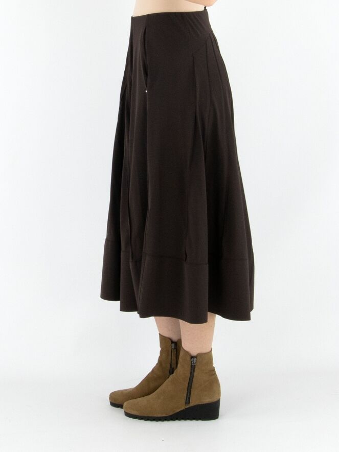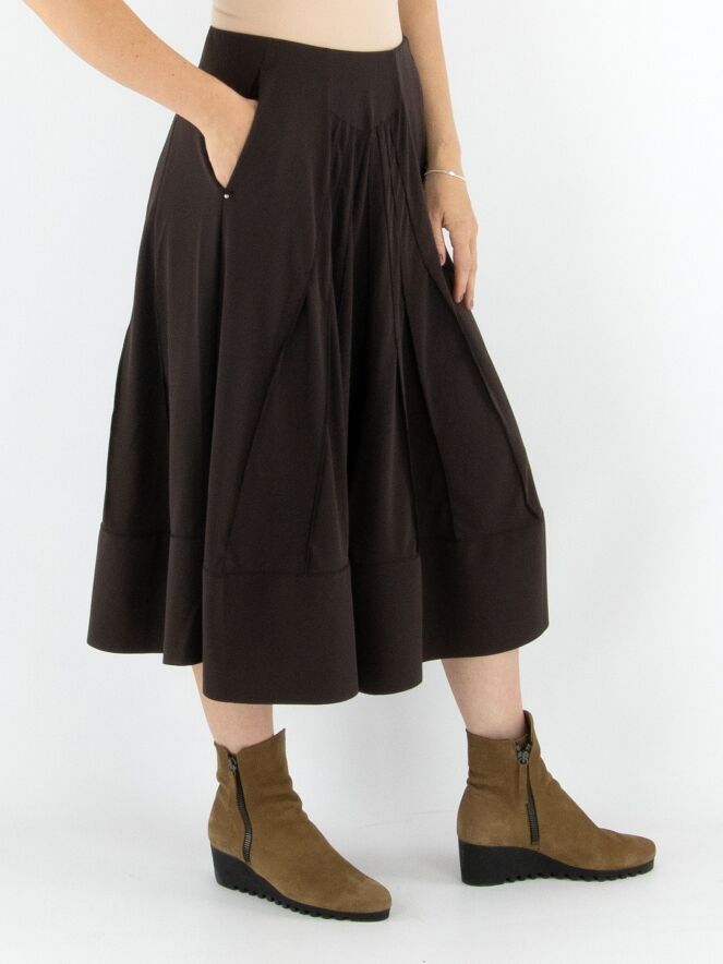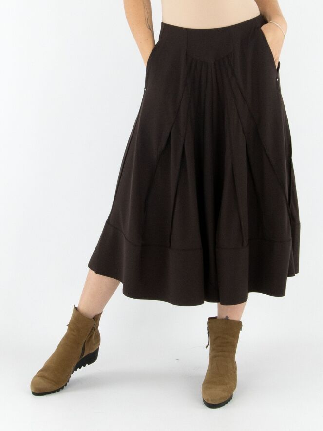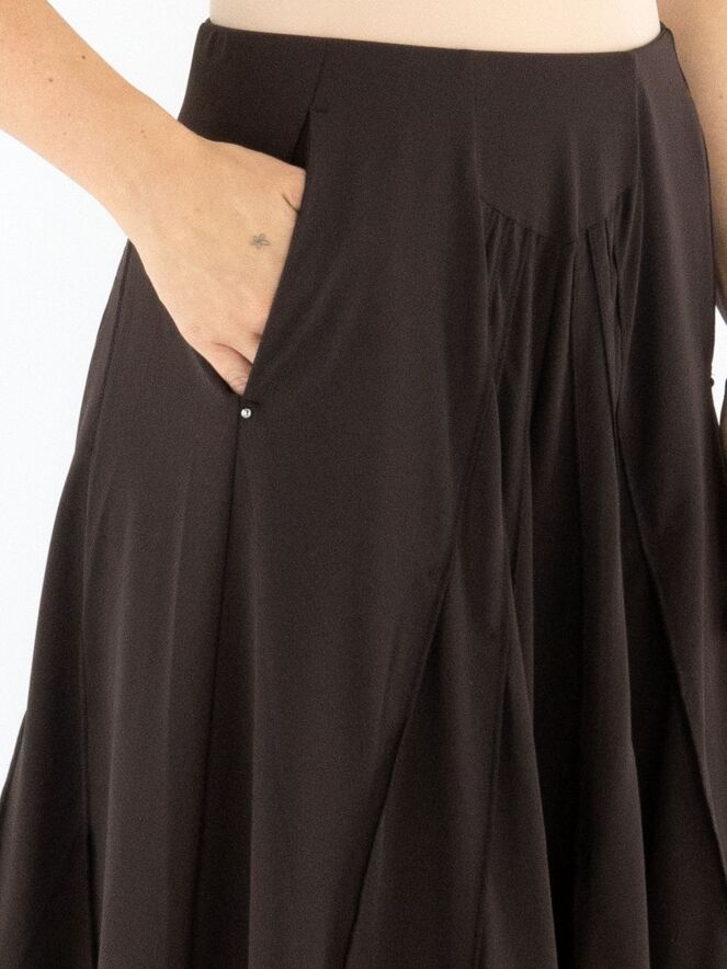 A wide, long skirt from High in a deep aubergine shade. The waist features a comfortable elastic band. Below the waistband, several inverted vertical seams at the front and back add playful volume and a refined touch. The skirt is finished with side pockets and can be hand-washed.