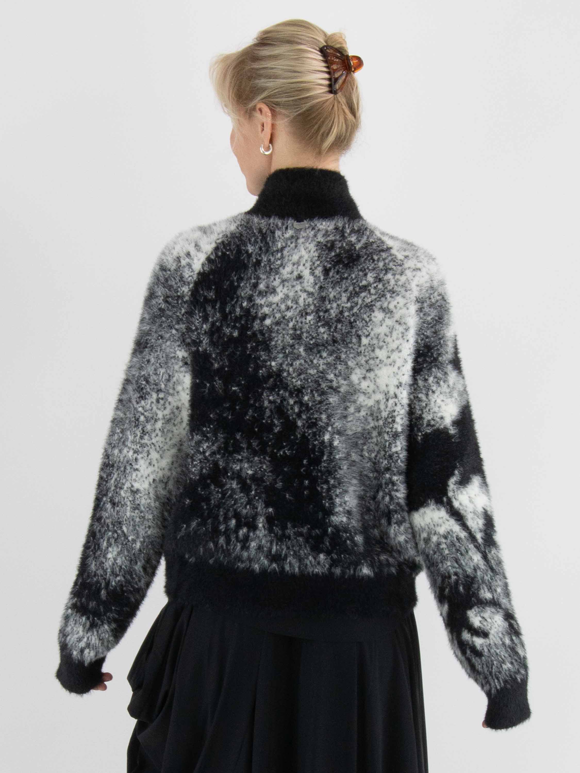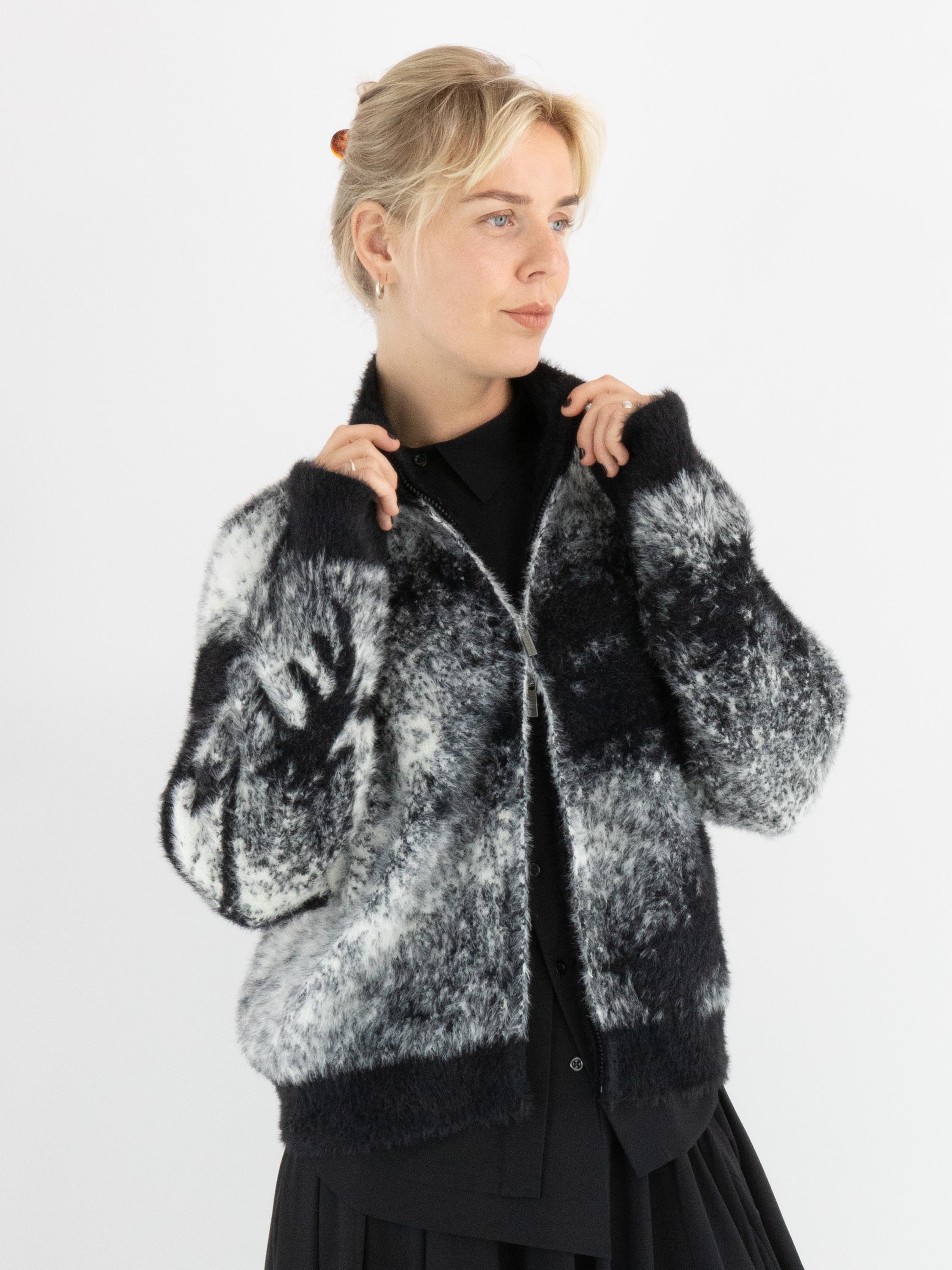 A cardigan by High in a graphic print in black and off-white. The cardigan features a high turtle neckline and a zip fastening. The fabric is elastic and should be hand washed.