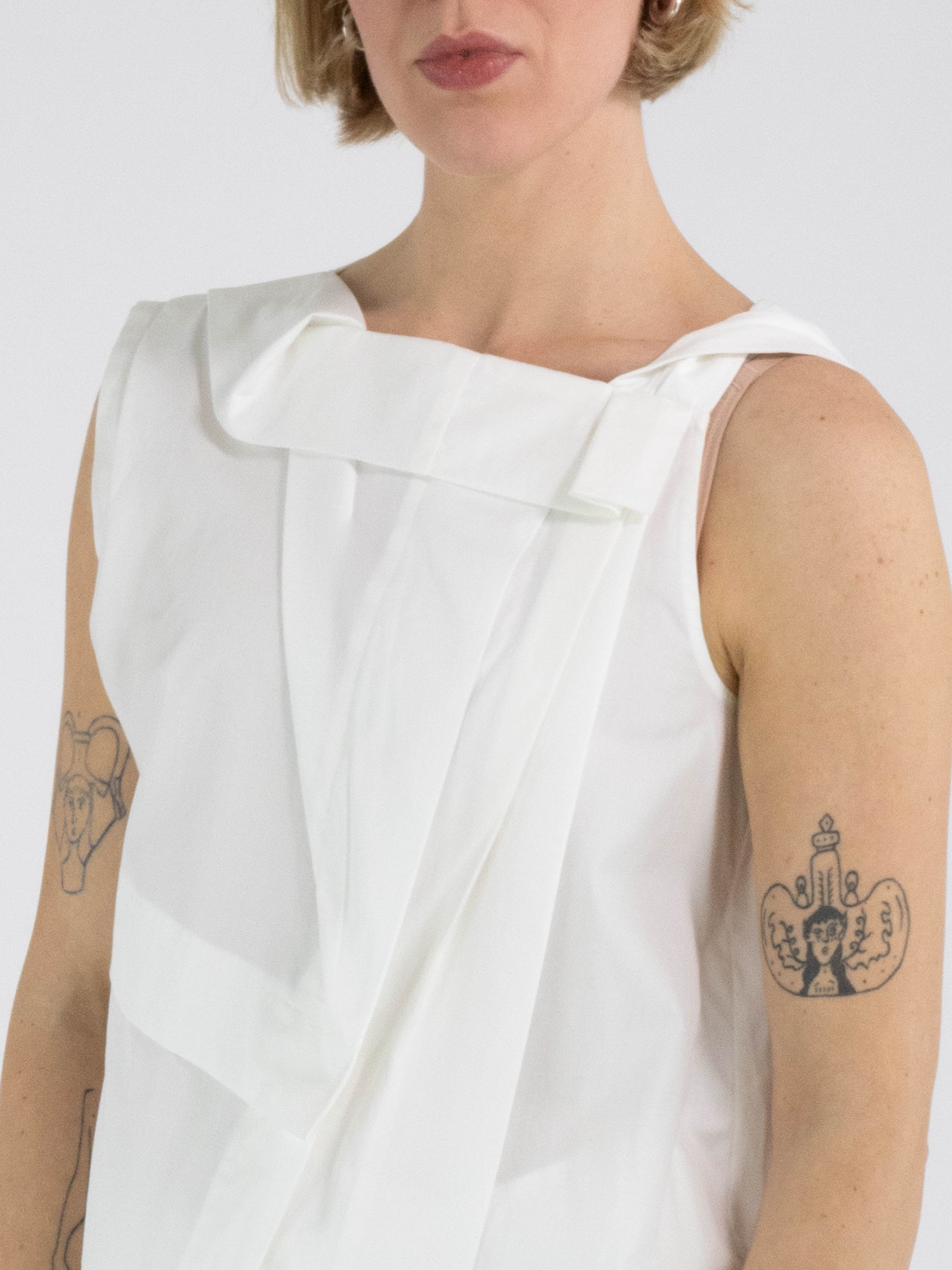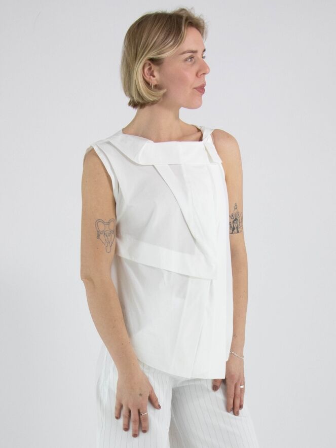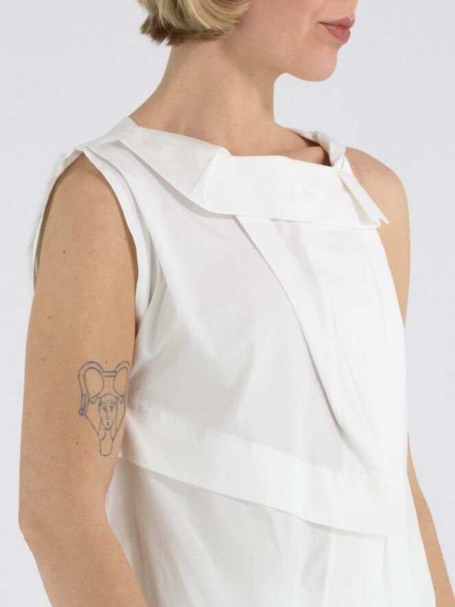 A top from High in an off-white colour. The top features multiple pleated folds, including at the shoulder and along the front of the neckline. From the left shoulder, several pleats run diagonally towards the centre of the hem. The top has an A-line shape and can be hand-washed.