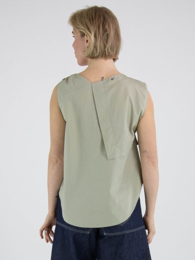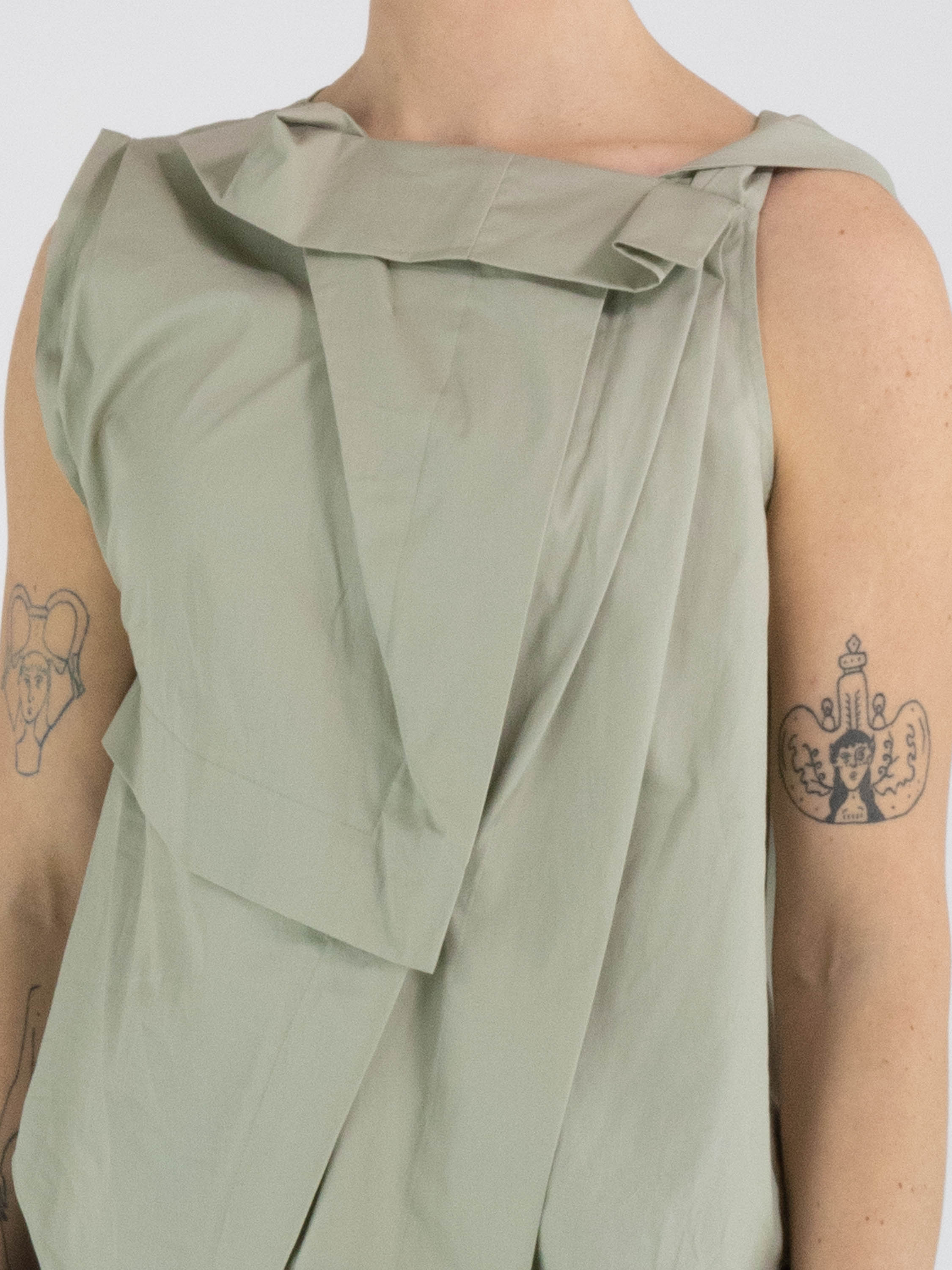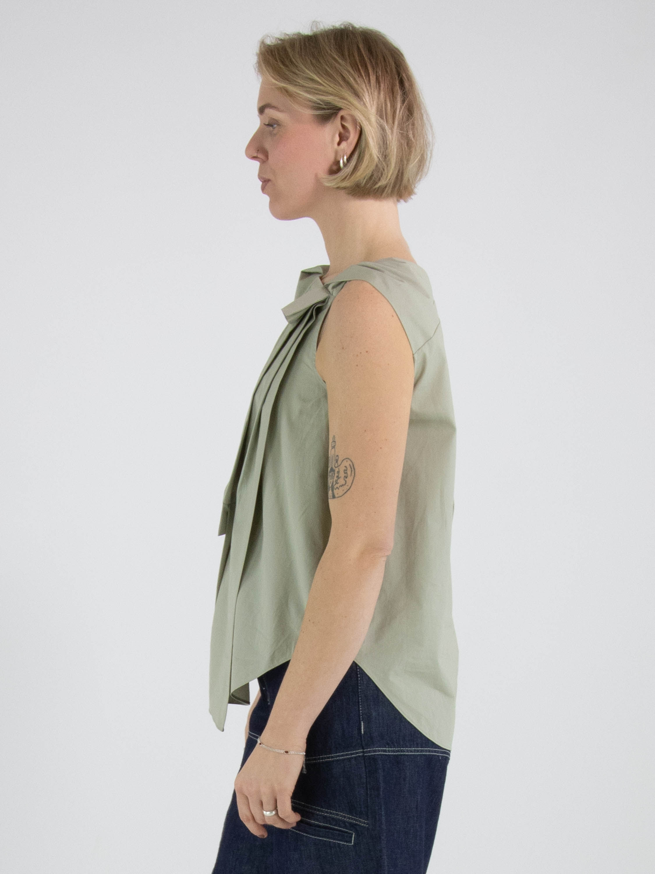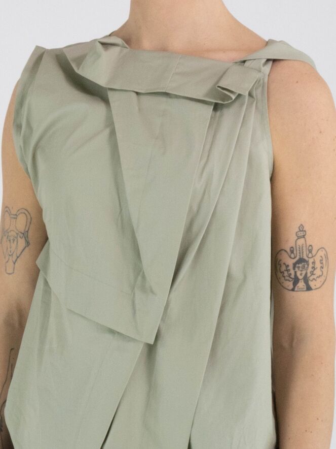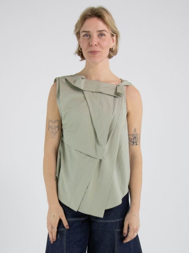A top from High in a soft olive green colour. The top features multiple pleated details, including at the shoulder and the front of the neckline. From the left shoulder, several pleats run diagonally towards the centre of the hem. The top has an A-line shape and can be hand-washed.
