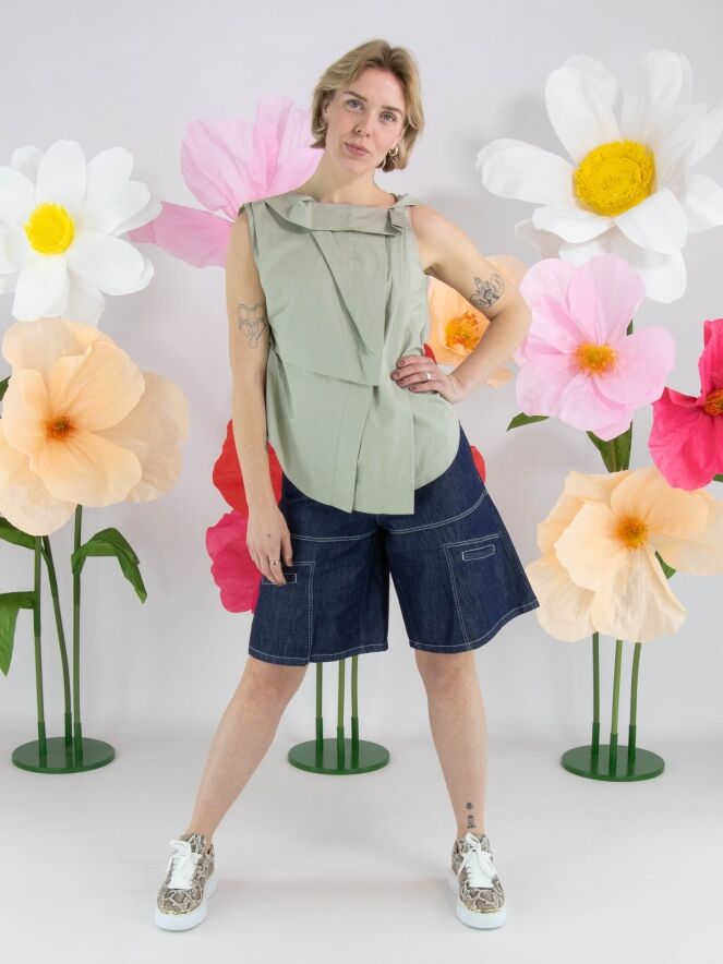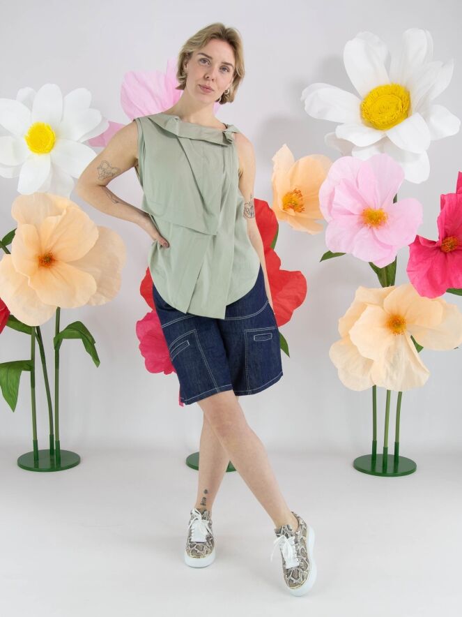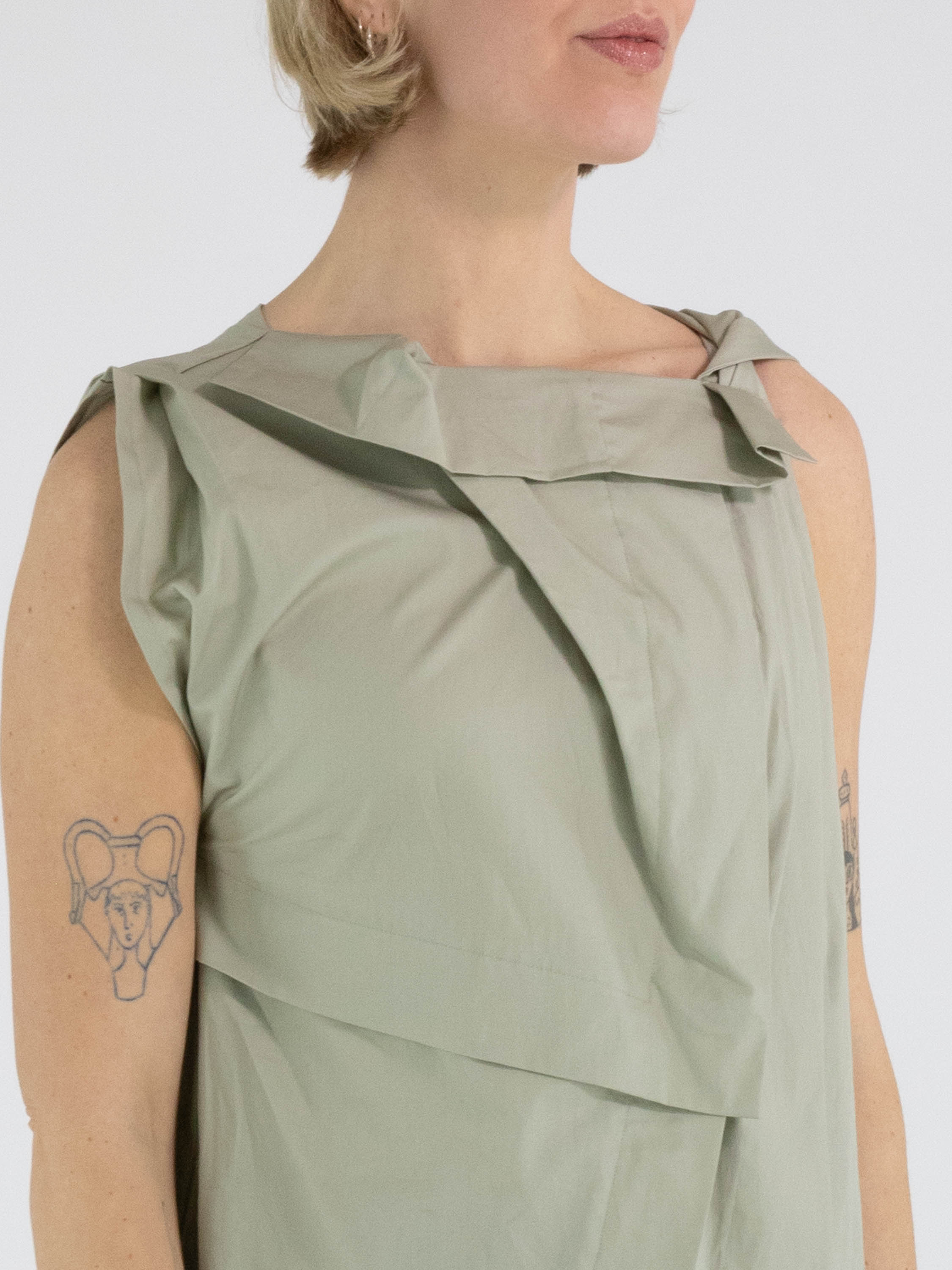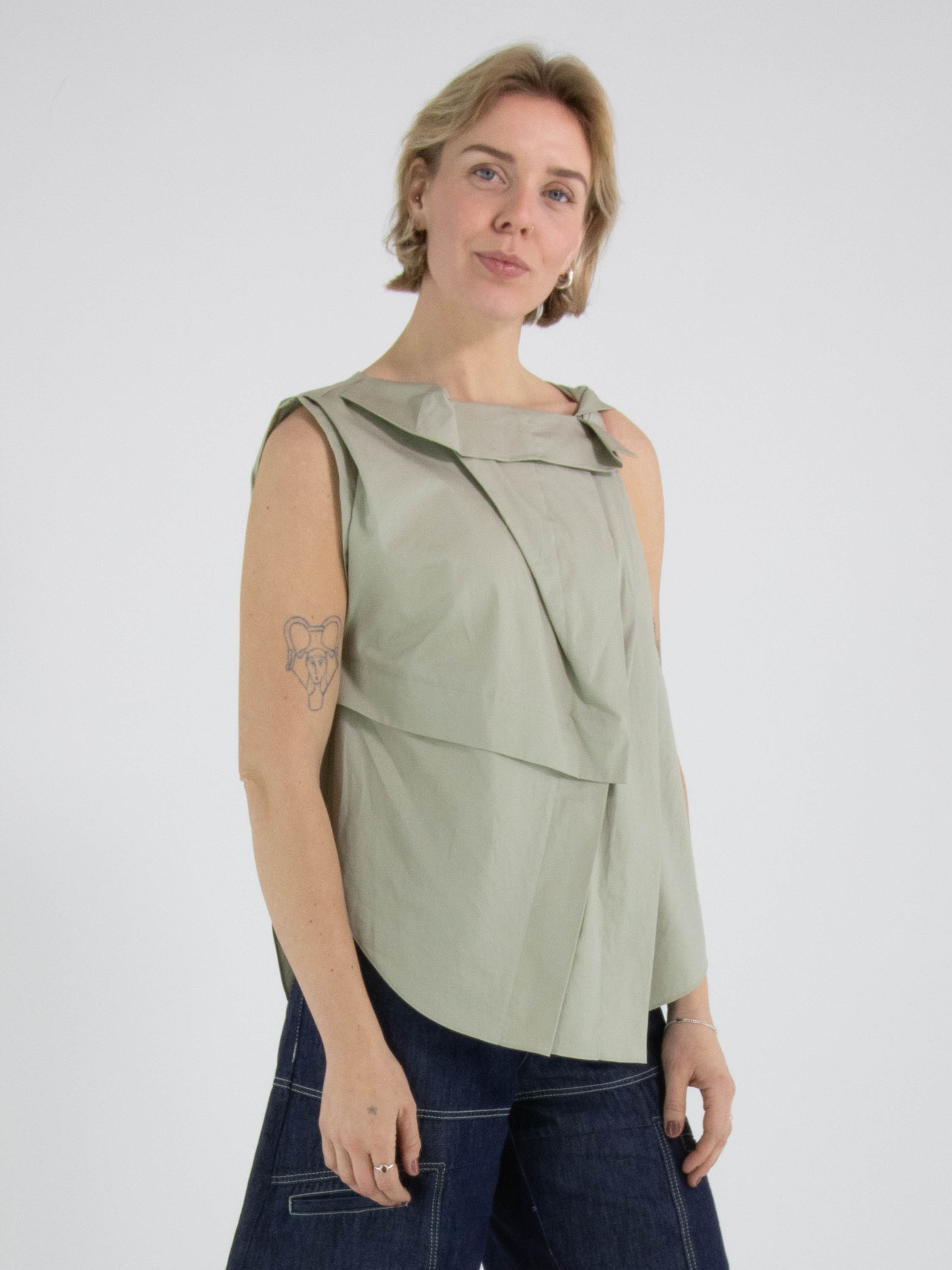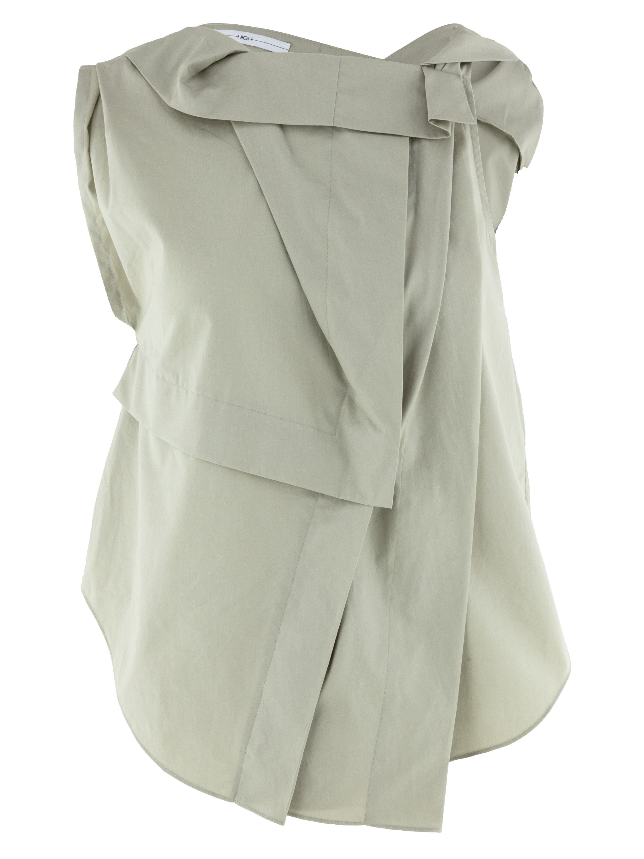 A top from High in a soft olive green colour. The top features multiple pleated details, including at the shoulder and the front of the neckline. From the left shoulder, several pleats run diagonally towards the centre of the hem. The top has an A-line shape and can be hand-washed.