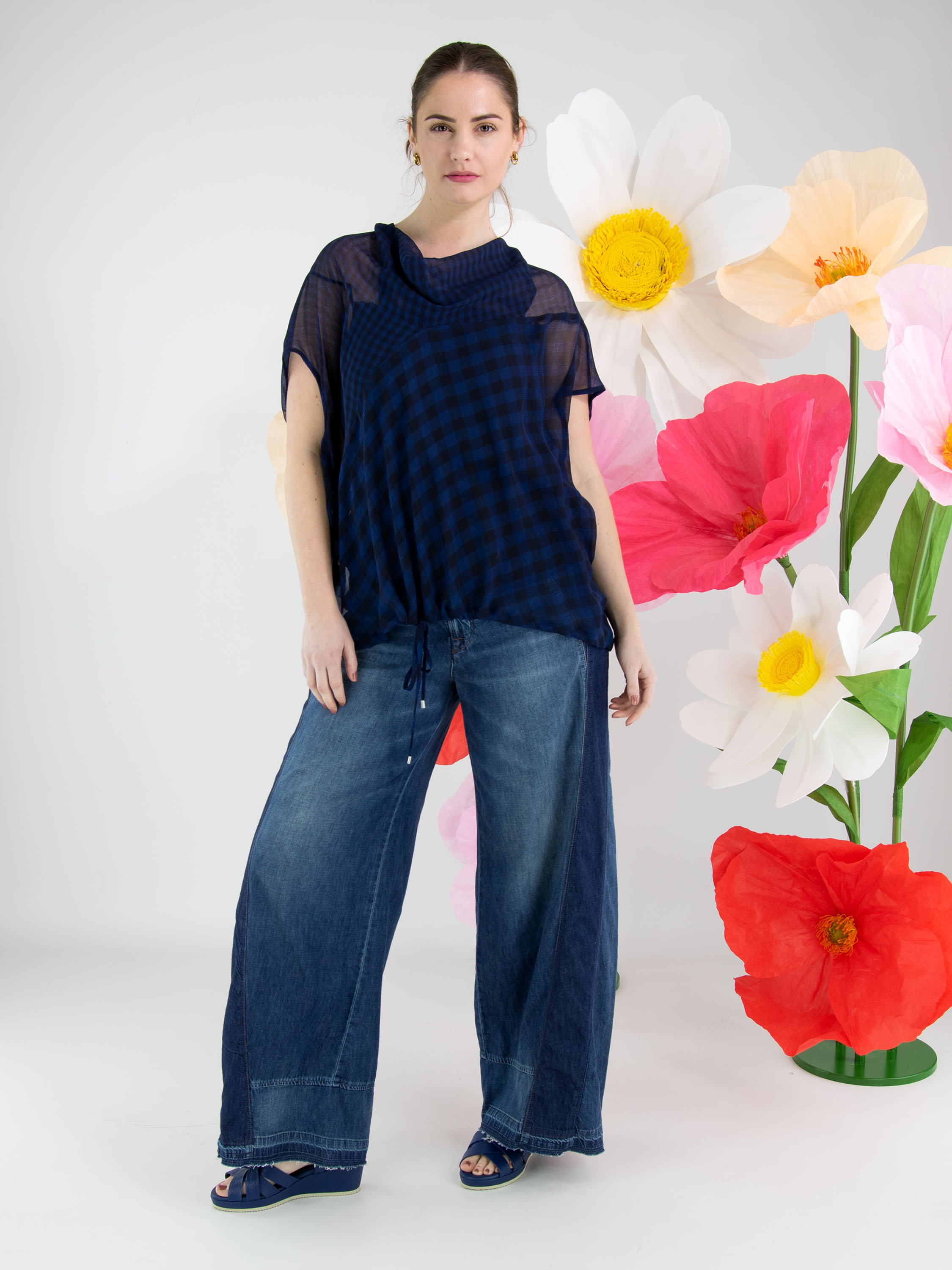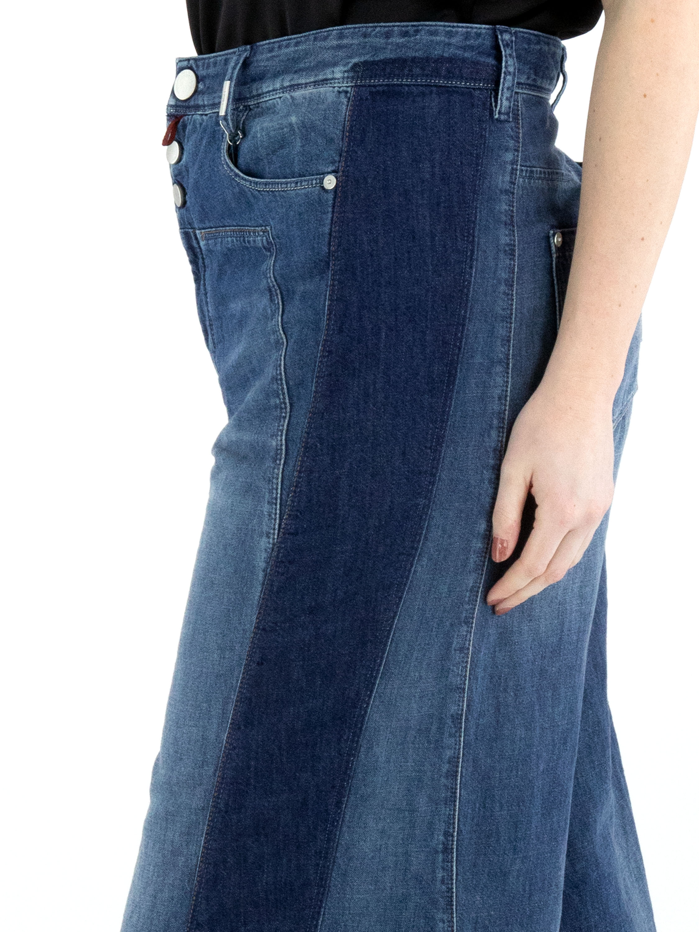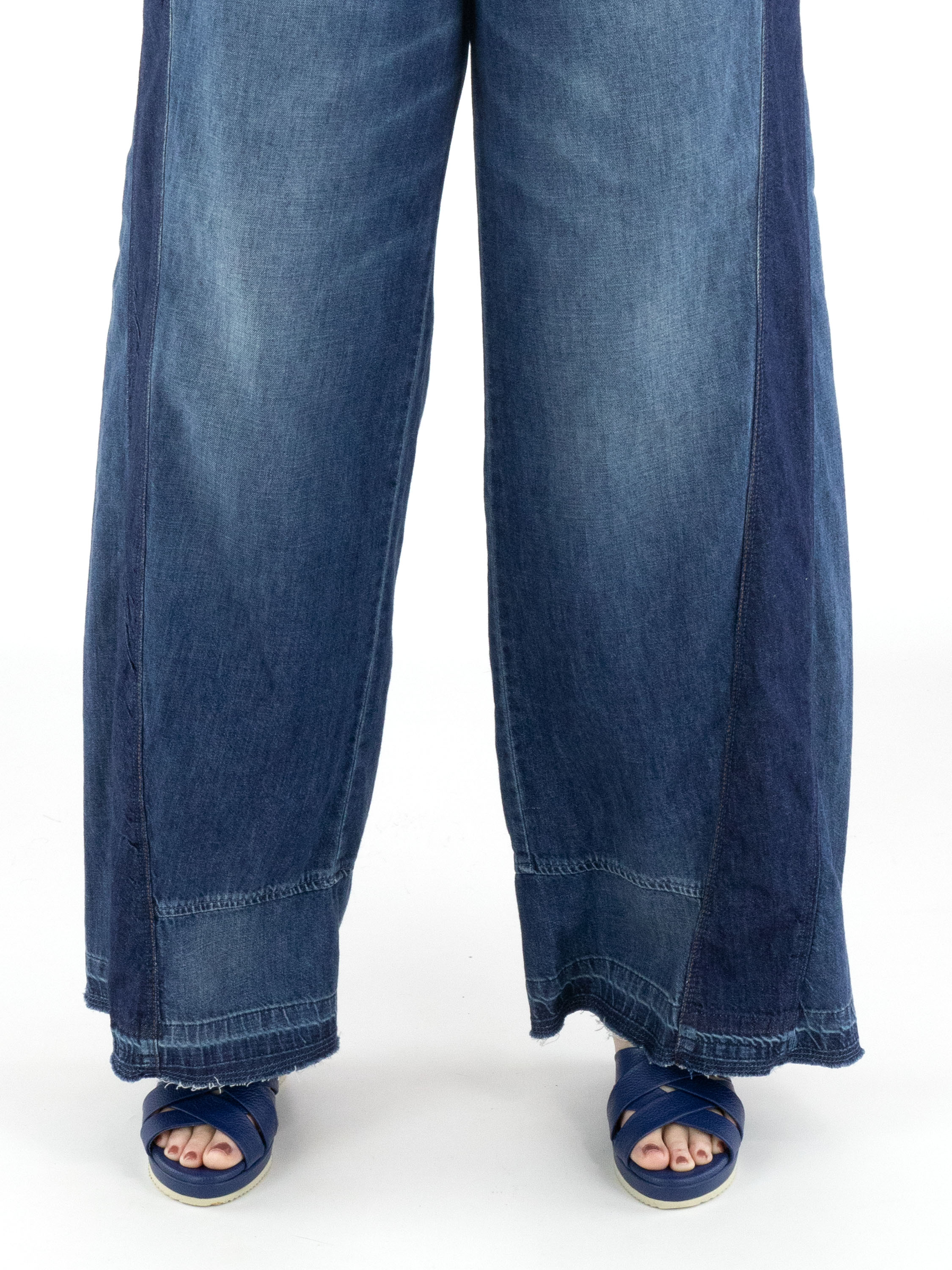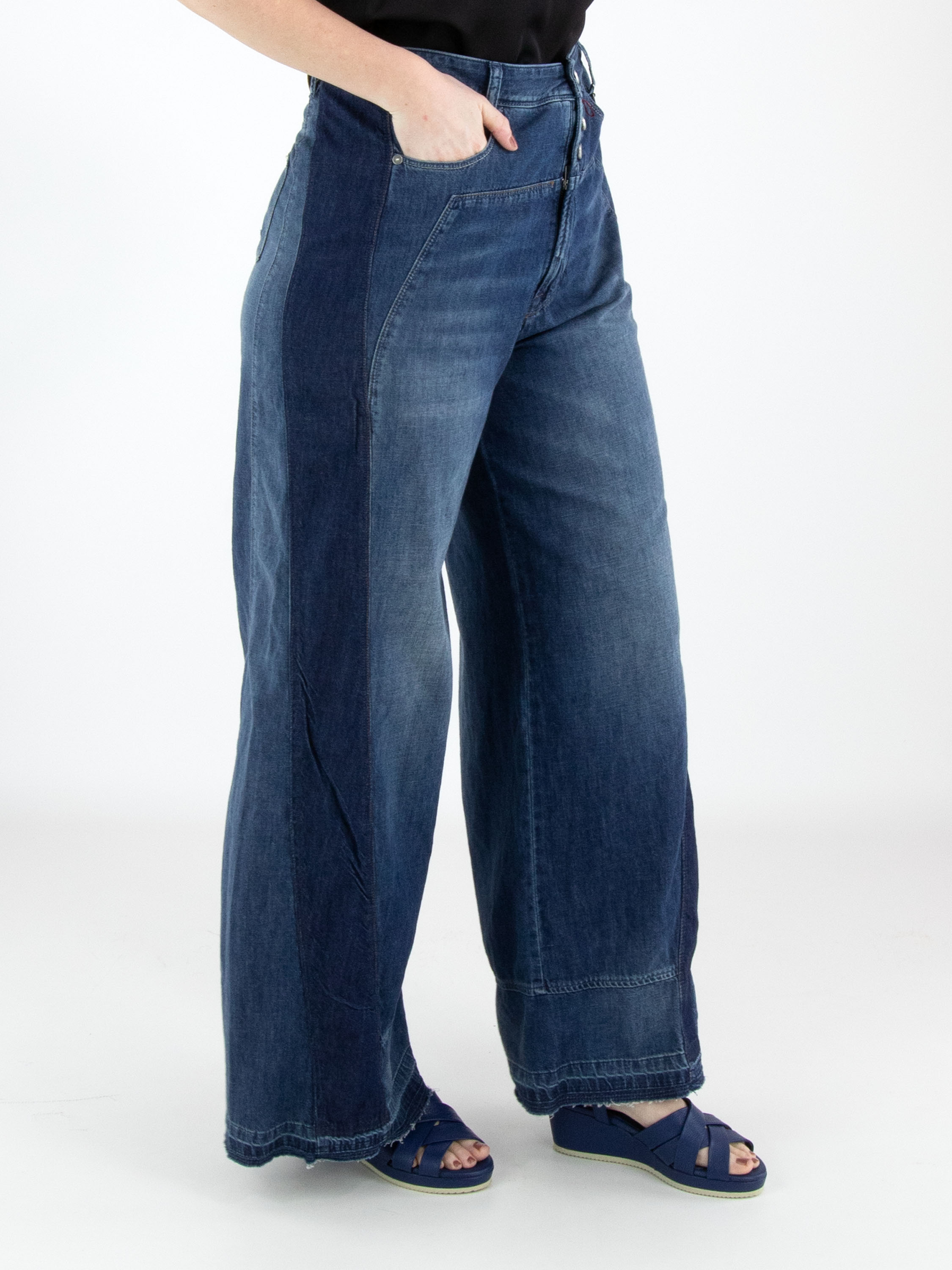 Wide used-look jeans from High in a lighter denim colour. The jeans are designed in a 5-pocket style. Along the sides, there is a wide panel in a darker denim shade. The jeans feature a fastening with three buttons, with a short zip underneath. These jeans can be washed at 30 degrees.