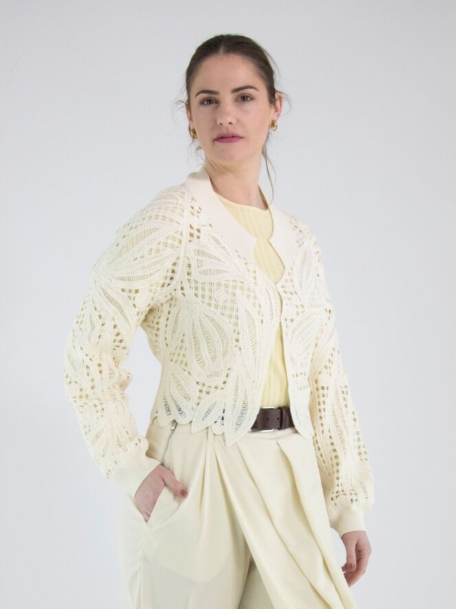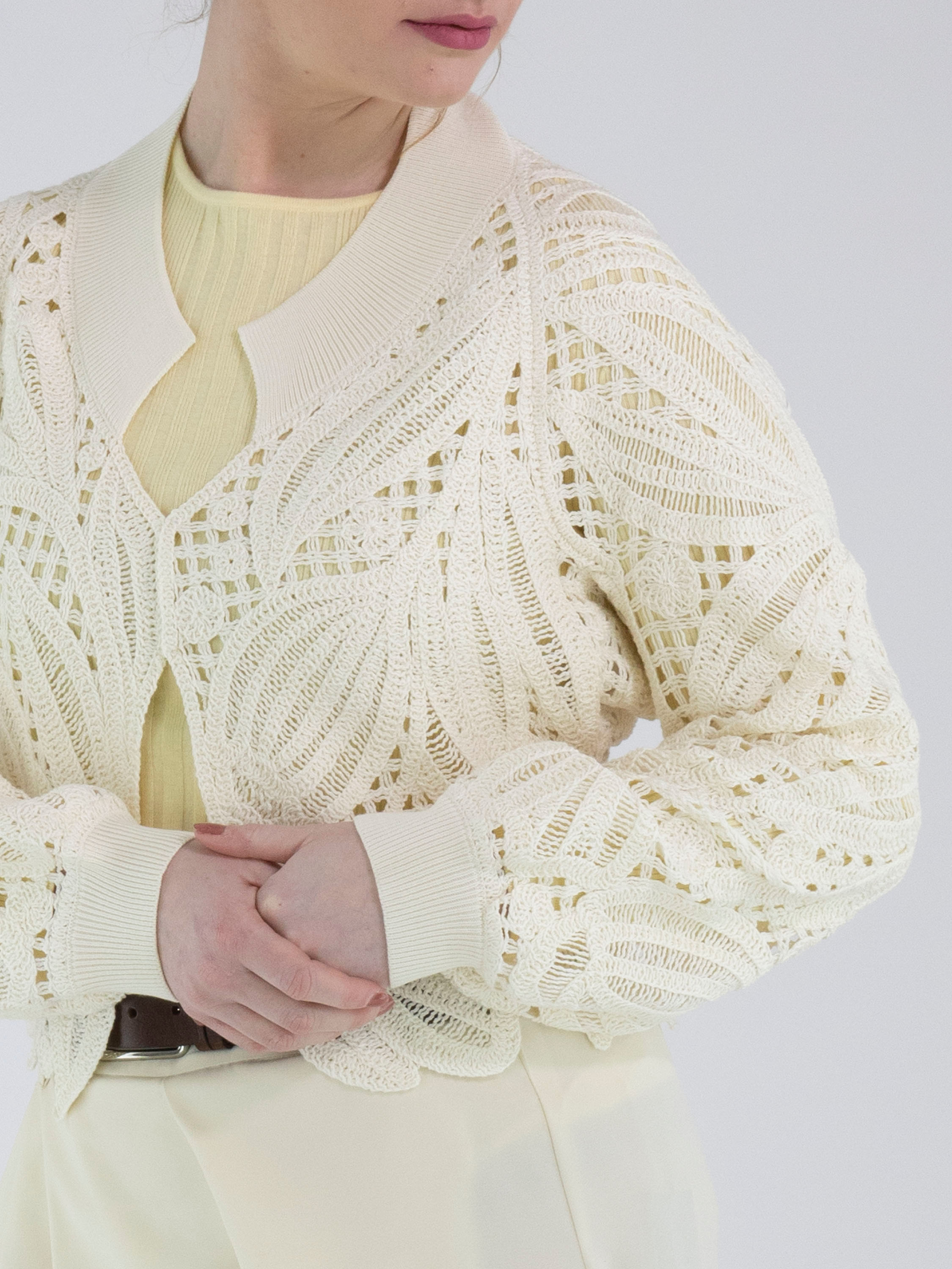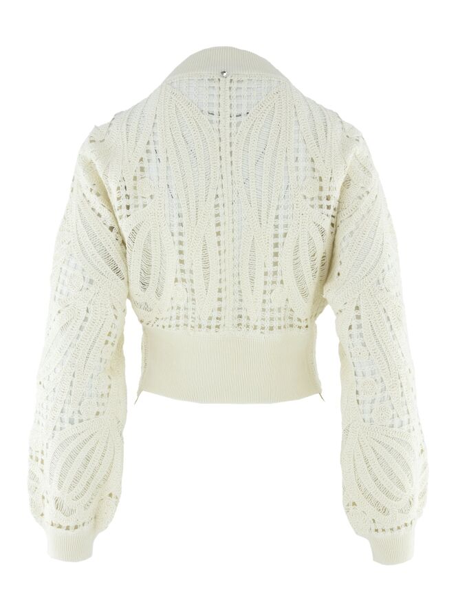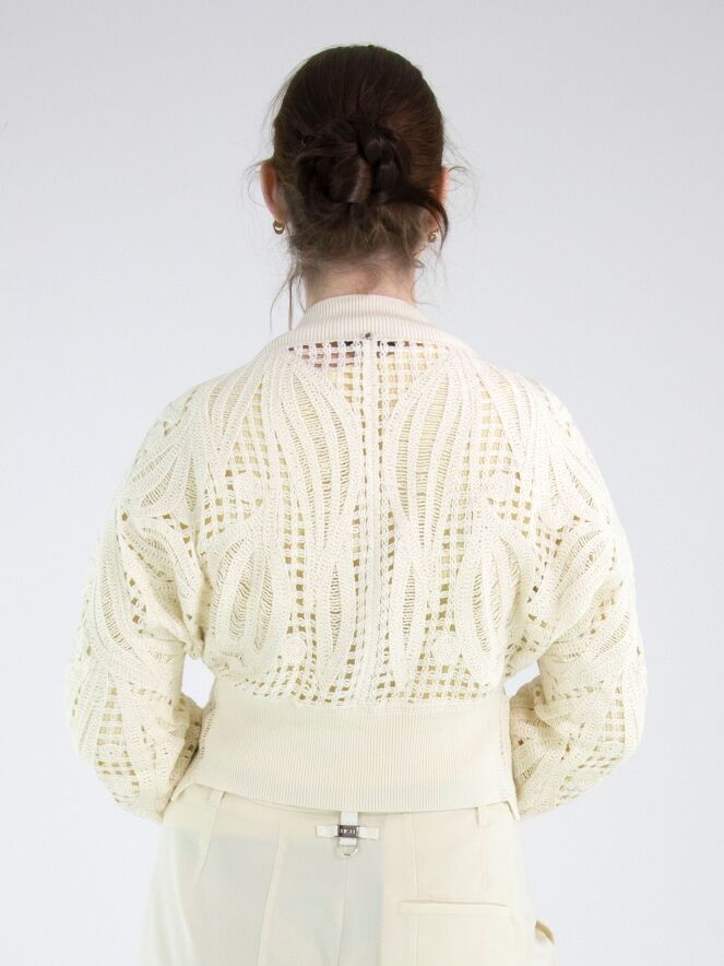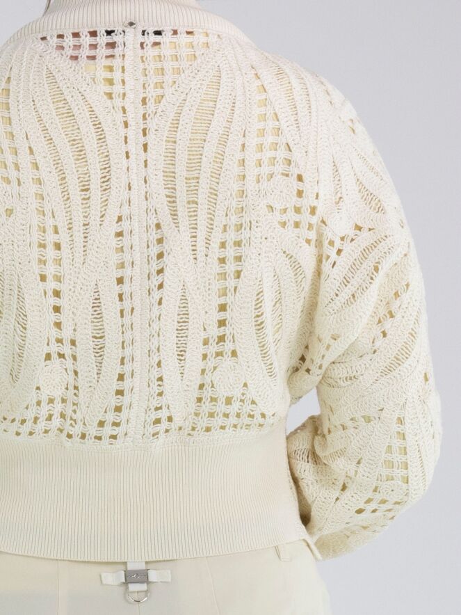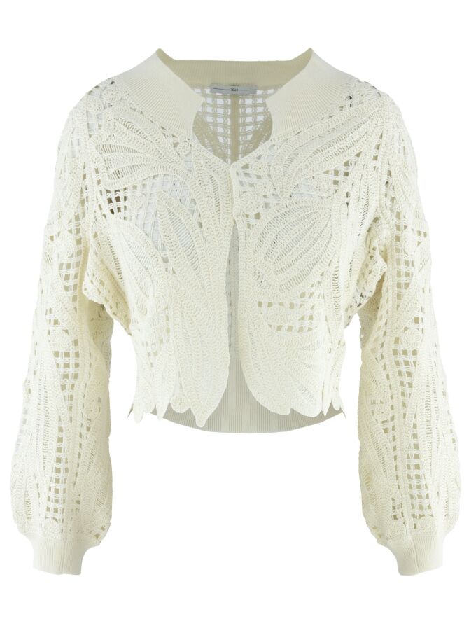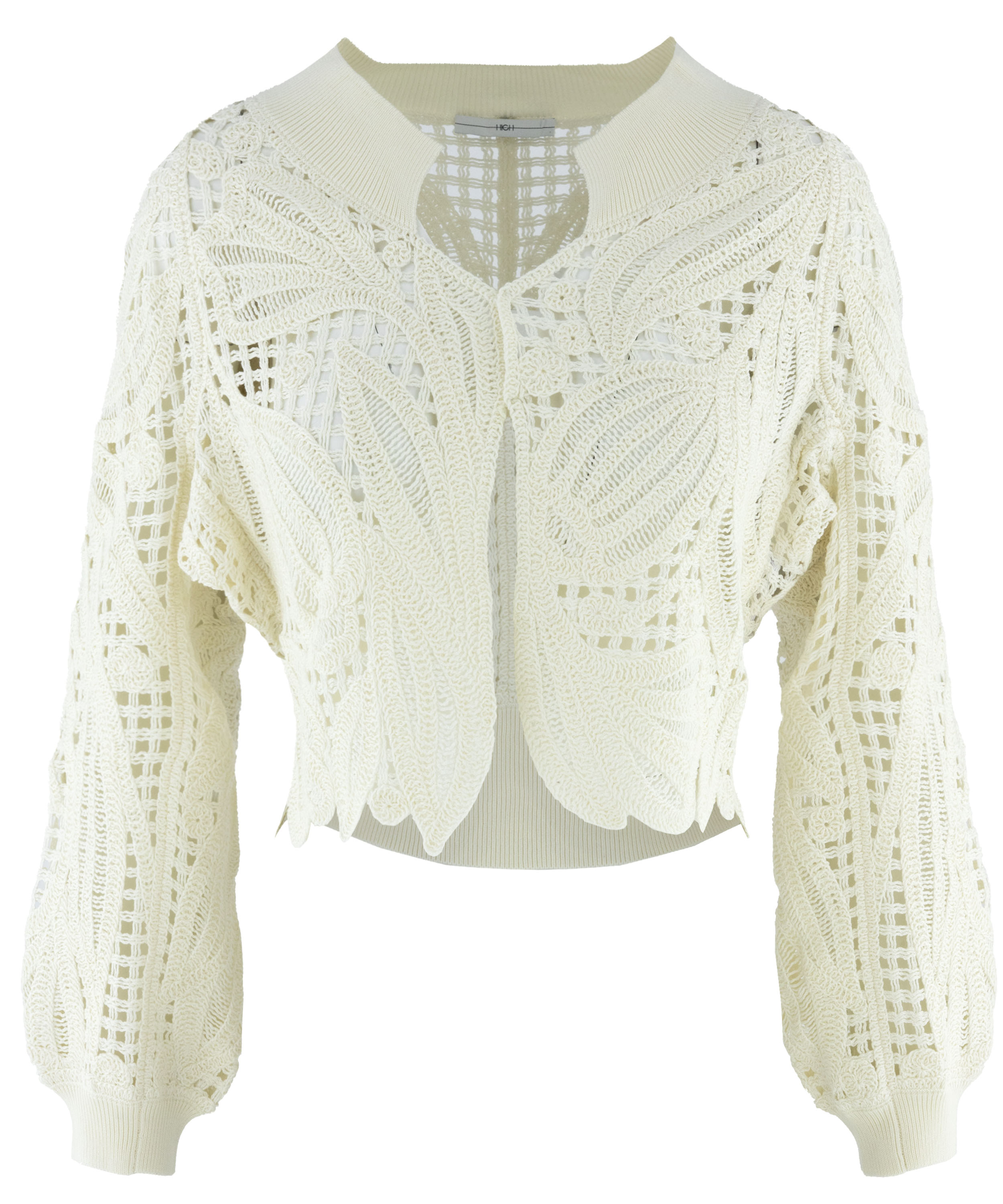 A short open-knit cardigan by High in cream white. The cardigan features a fastening with two small concealed buttons and batwing sleeves. A wide, finely ribbed knit trim runs along the neckline and is also applied at the back hem and the ends of the long sleeves. This cardigan can be hand-washed.