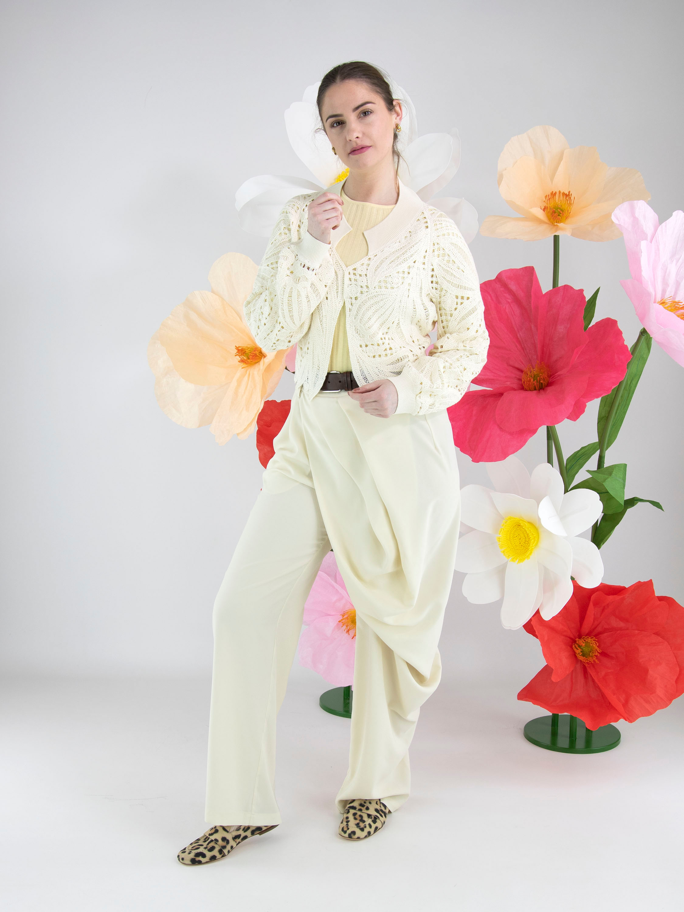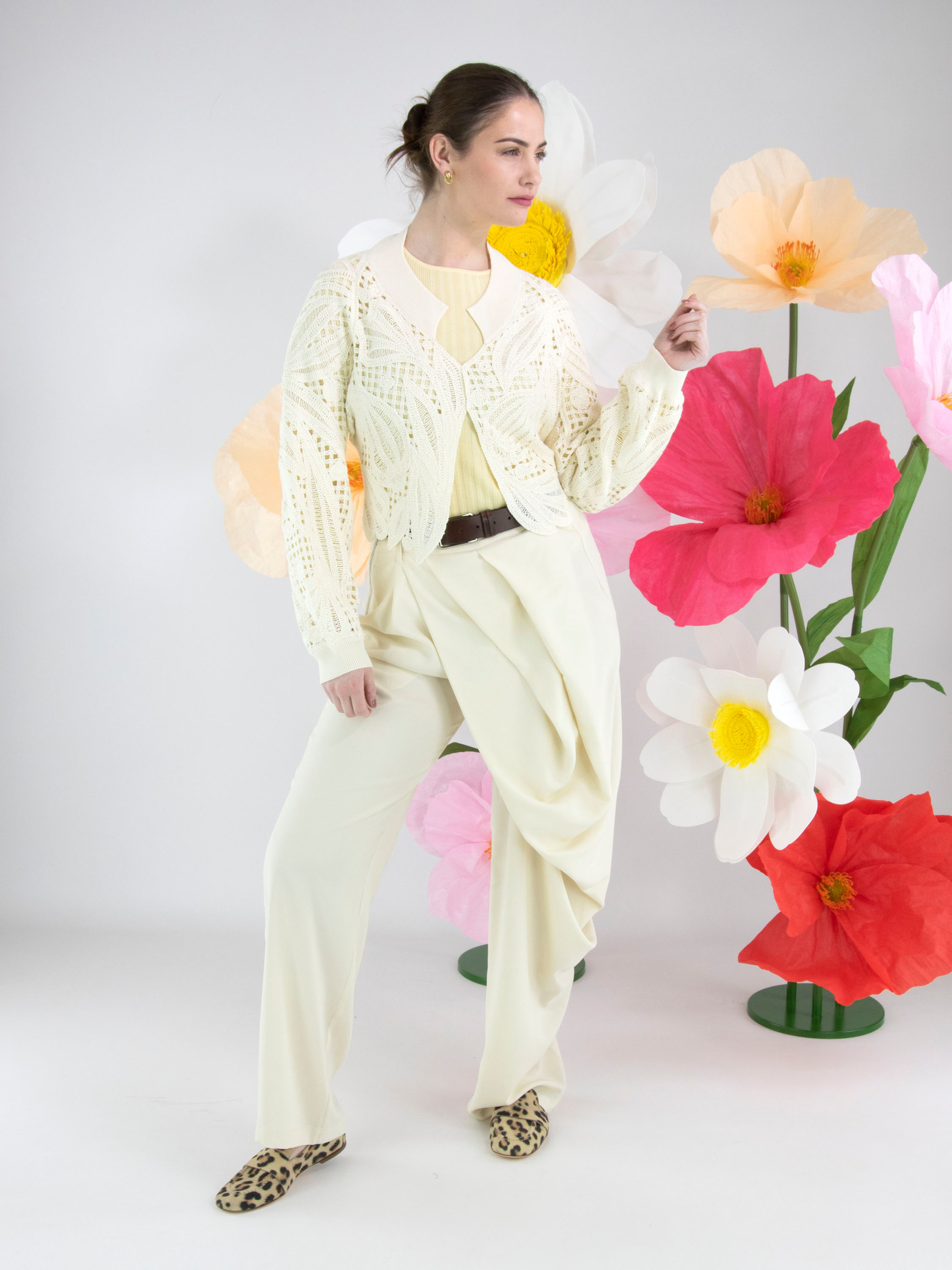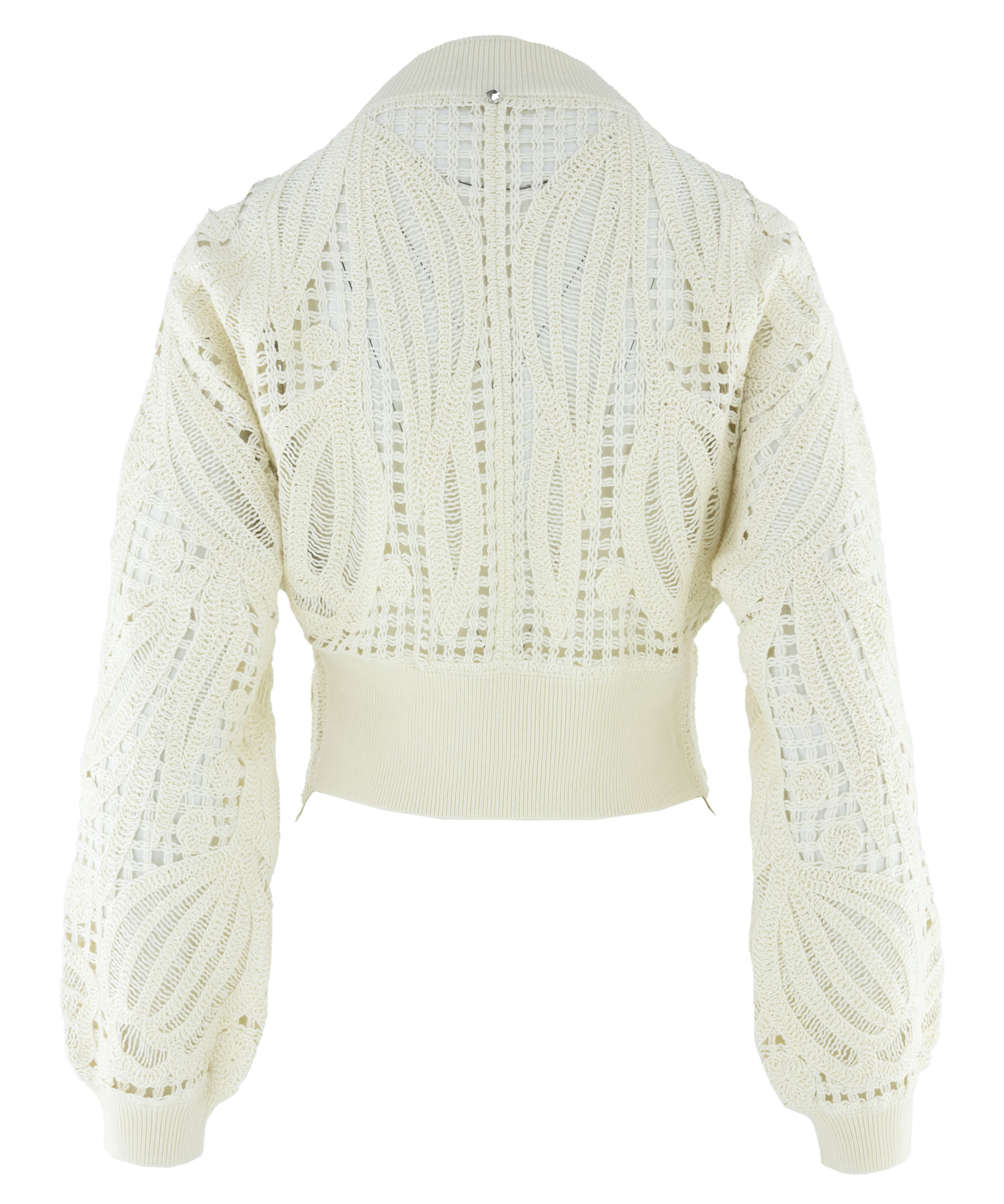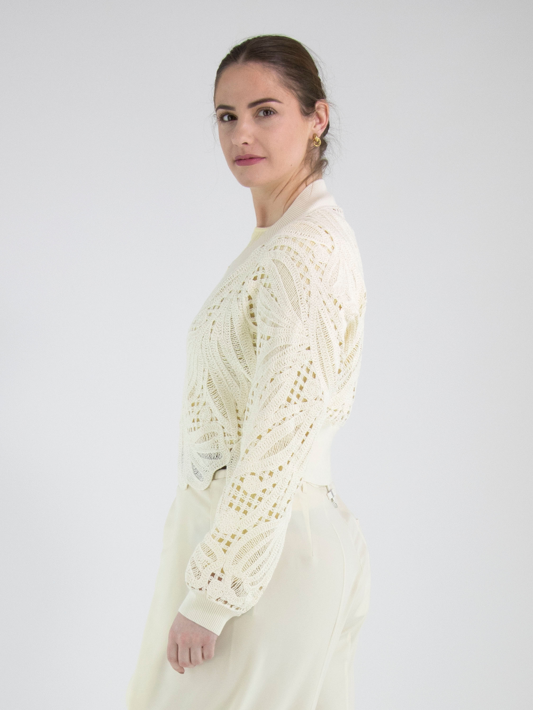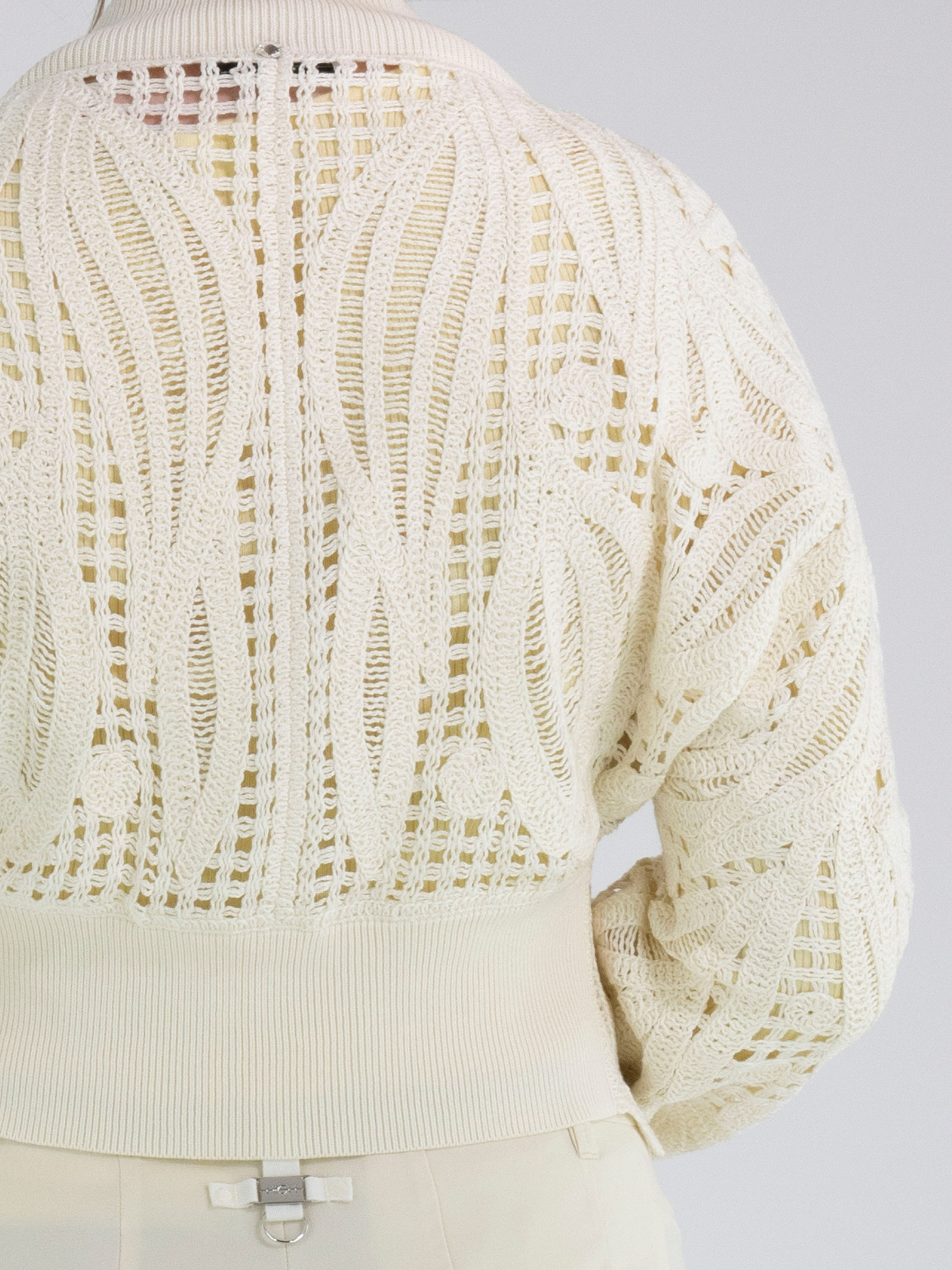 A short open-knit cardigan by High in cream white. The cardigan features a fastening with two small concealed buttons and batwing sleeves. A wide, finely ribbed knit trim runs along the neckline and is also applied at the back hem and the ends of the long sleeves. This cardigan can be hand-washed.
