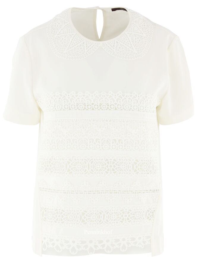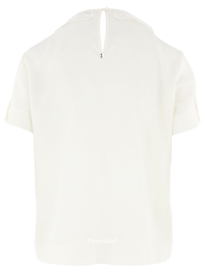 A shirt from High in the color creamy white. The front is partly transparent because from the bust to the bottom, multiple lace patterns are alternated with a matt satin fabric. The shirt has a lace collar. This shirt can be washed by hand.