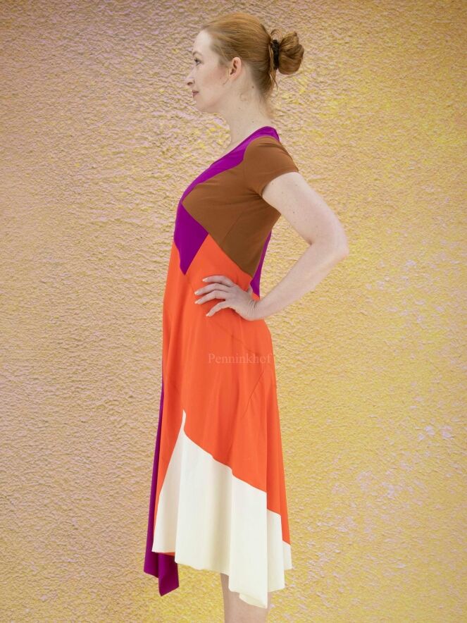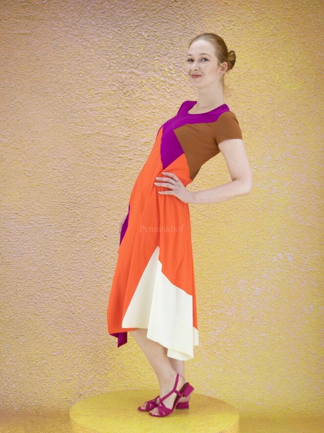 A dress from High in 3 color areas: cognac, orange and purple. There is a pocket on the left side of the waist. At the bottom in the middle of the front is a split. From the waist the dress has an A - Line. The dress has a round neckline and short sleeves. This dress can be hand washed.
