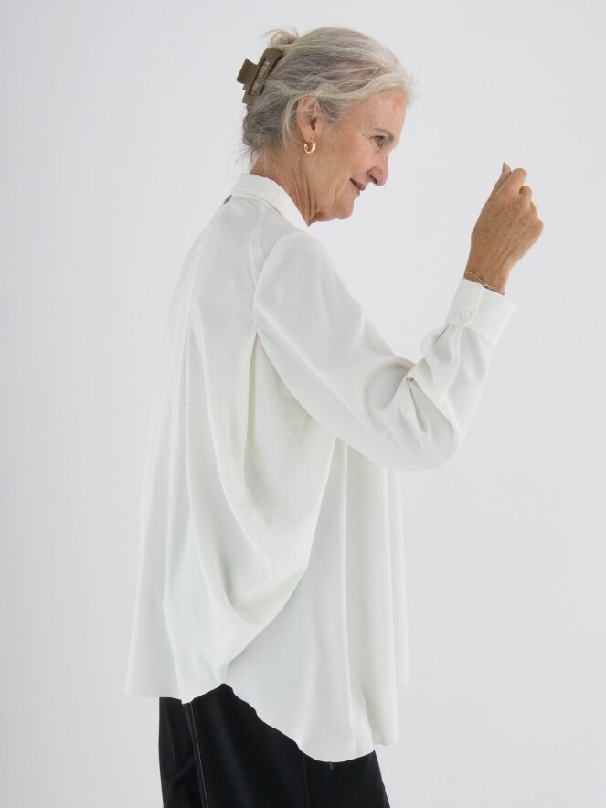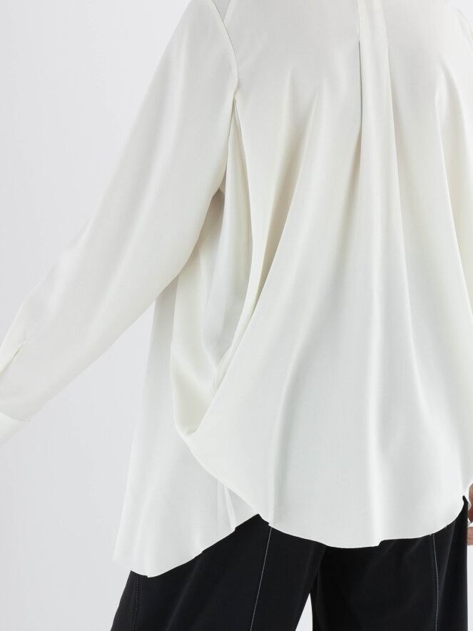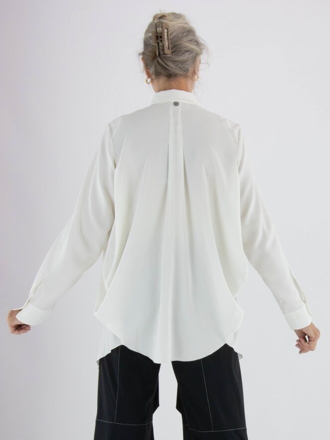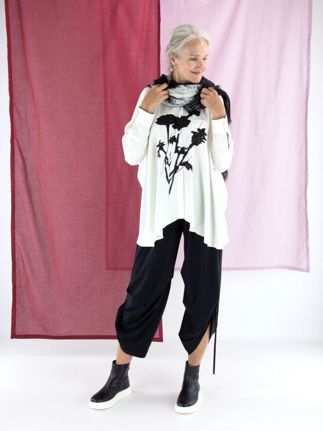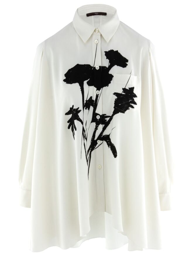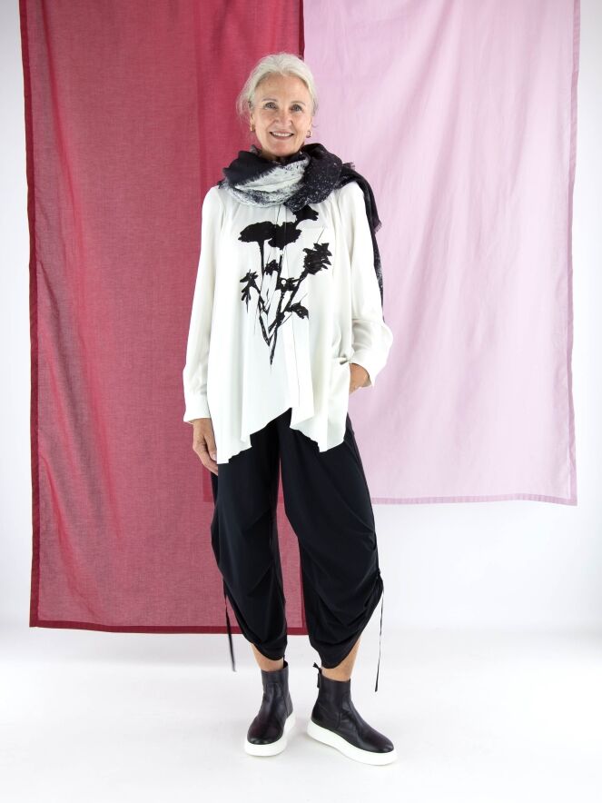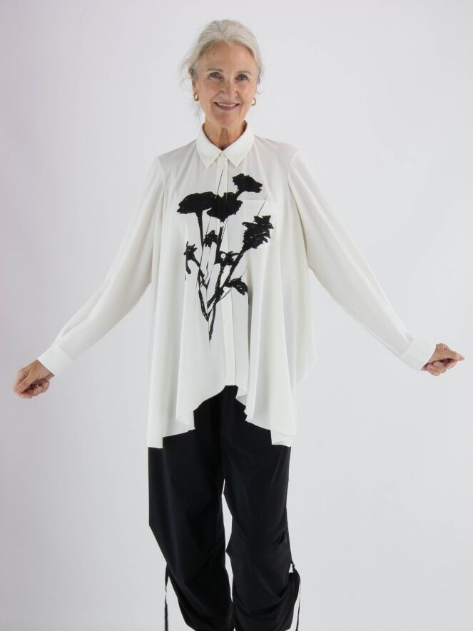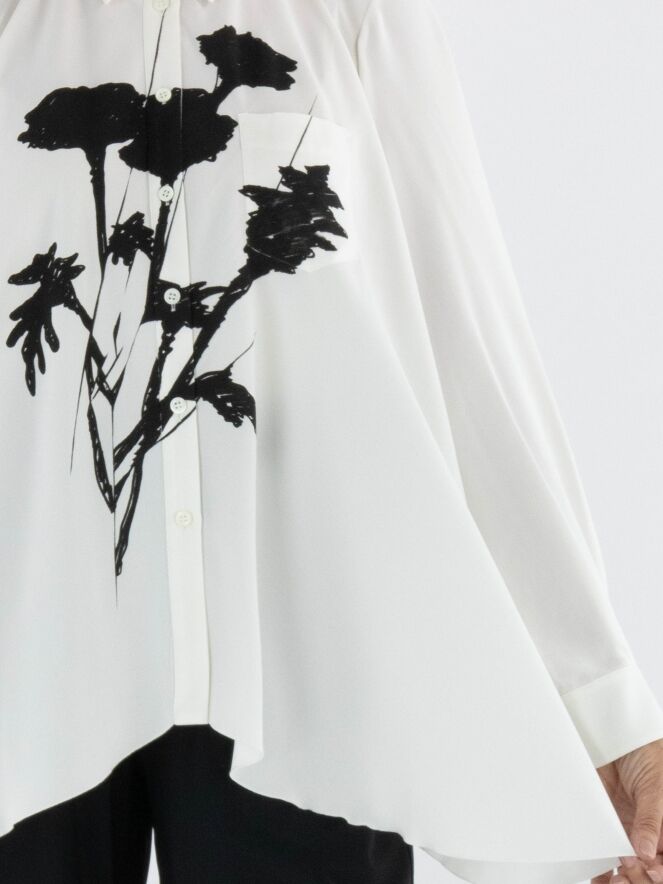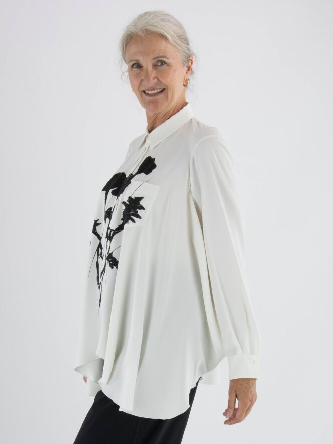 A long blouse from High in ivory, featuring a graphic design of flowers on stems in black. At the bottom, both sides have gathered details that create a blouson effect. The hem is rounded, with extra length at the sides. This blouse should be hand-washed.