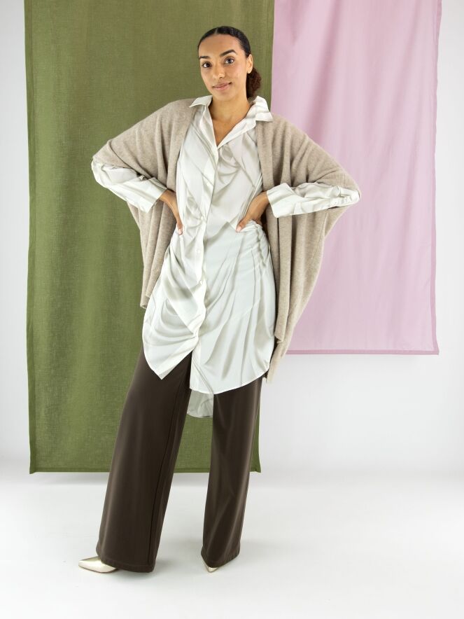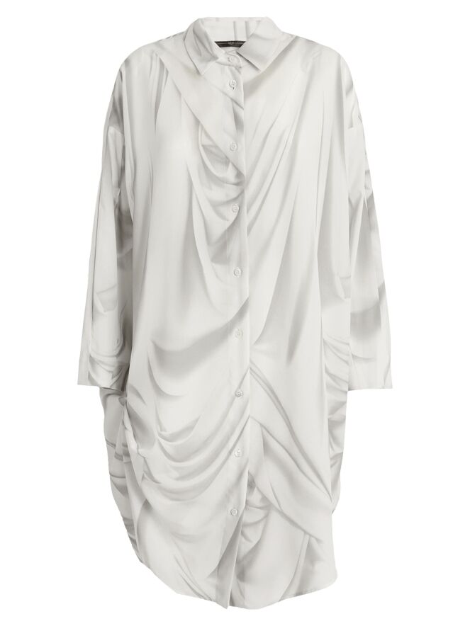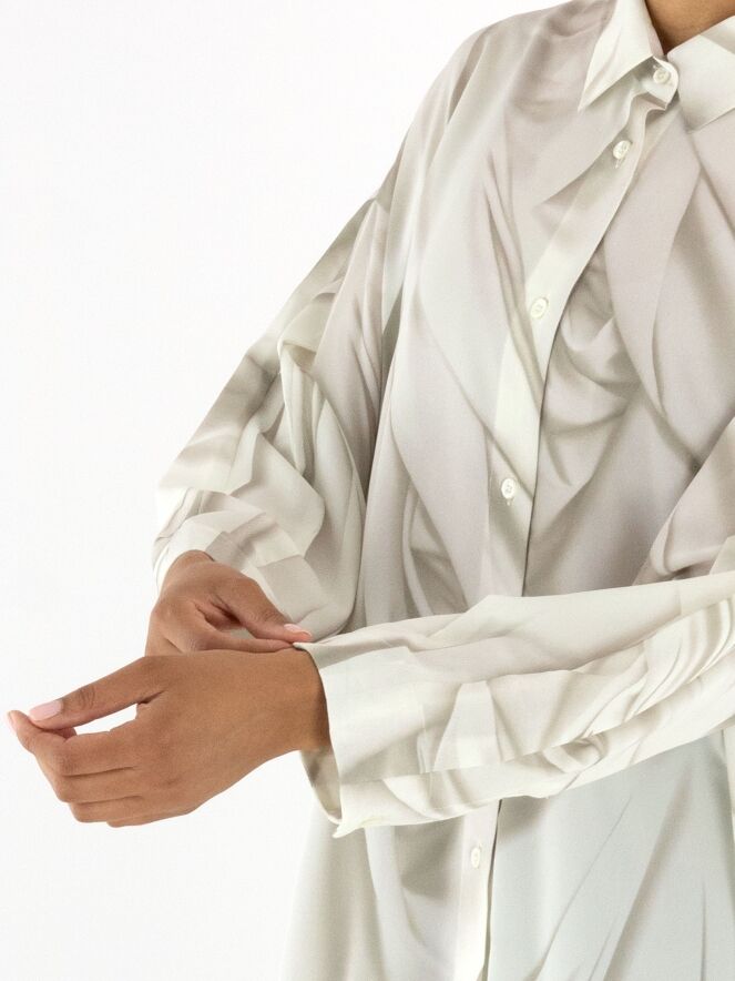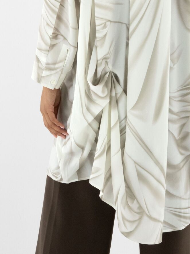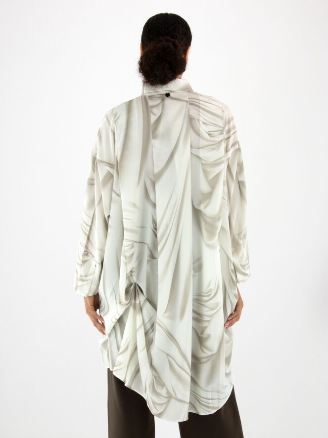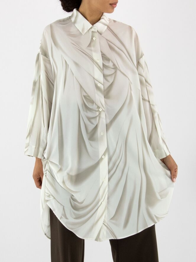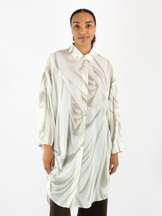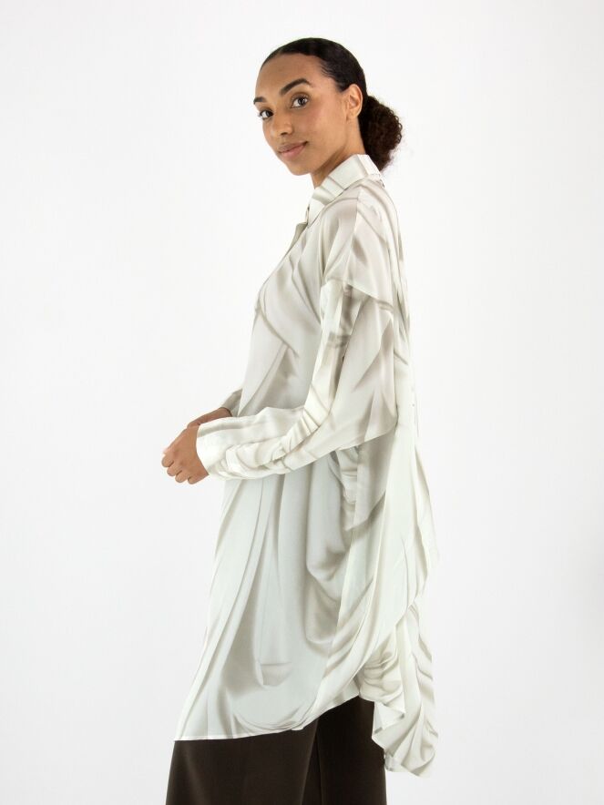 An oversized blouse by High with a pleat print in various shades of putty and off-white. The hem is rounded. At the back, around hip level, a gathered detail creates a draped effect. The blouse has elbow-length sleeves and can be washed at 30 degrees.