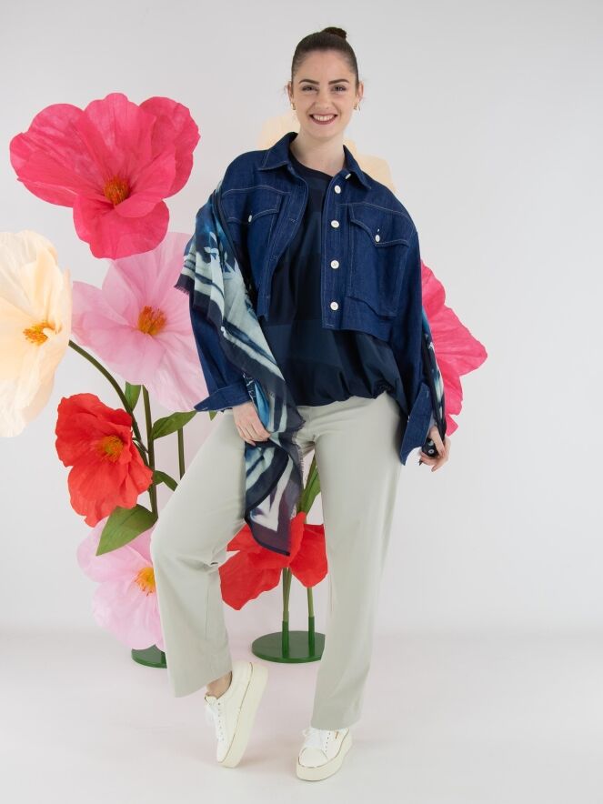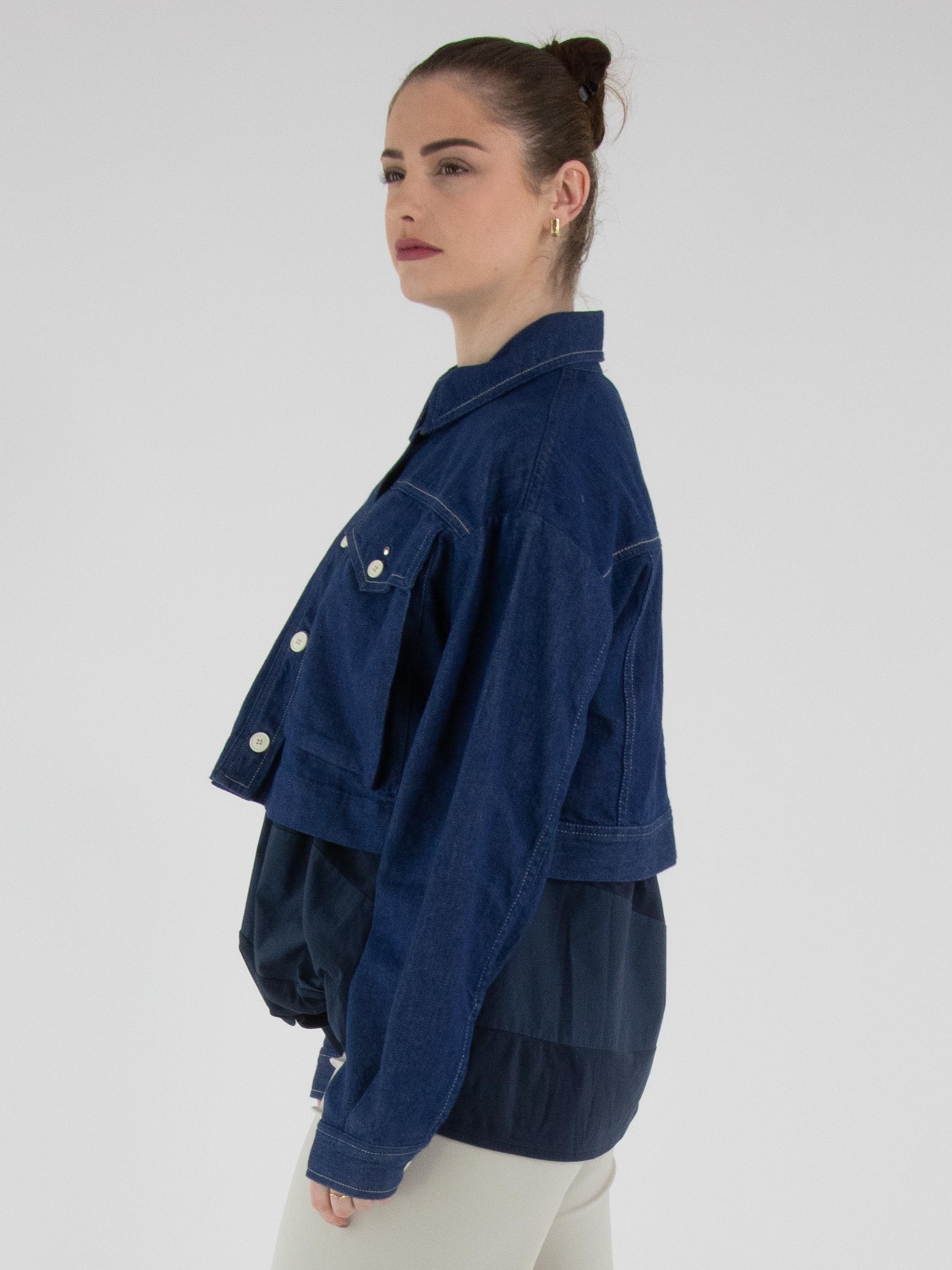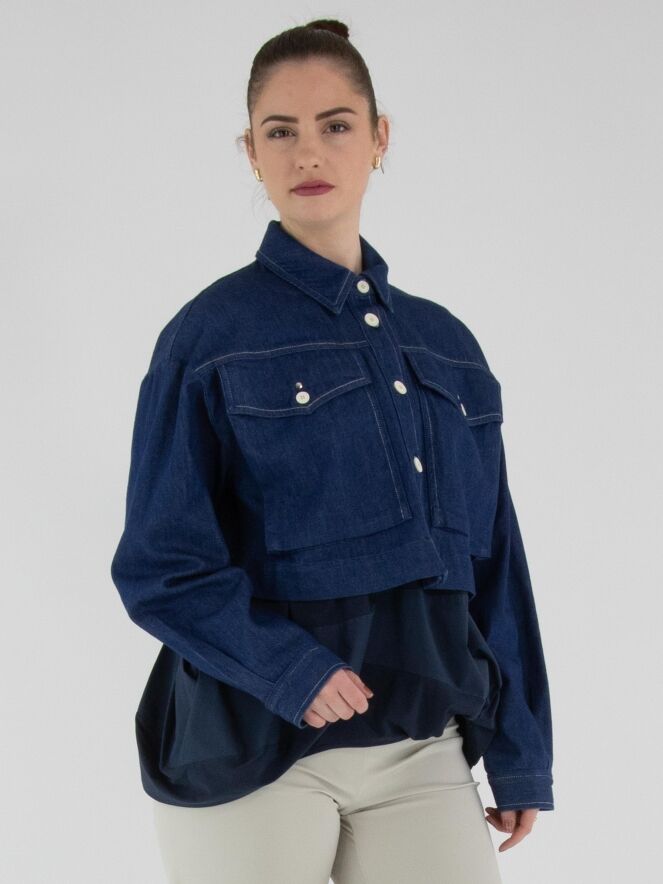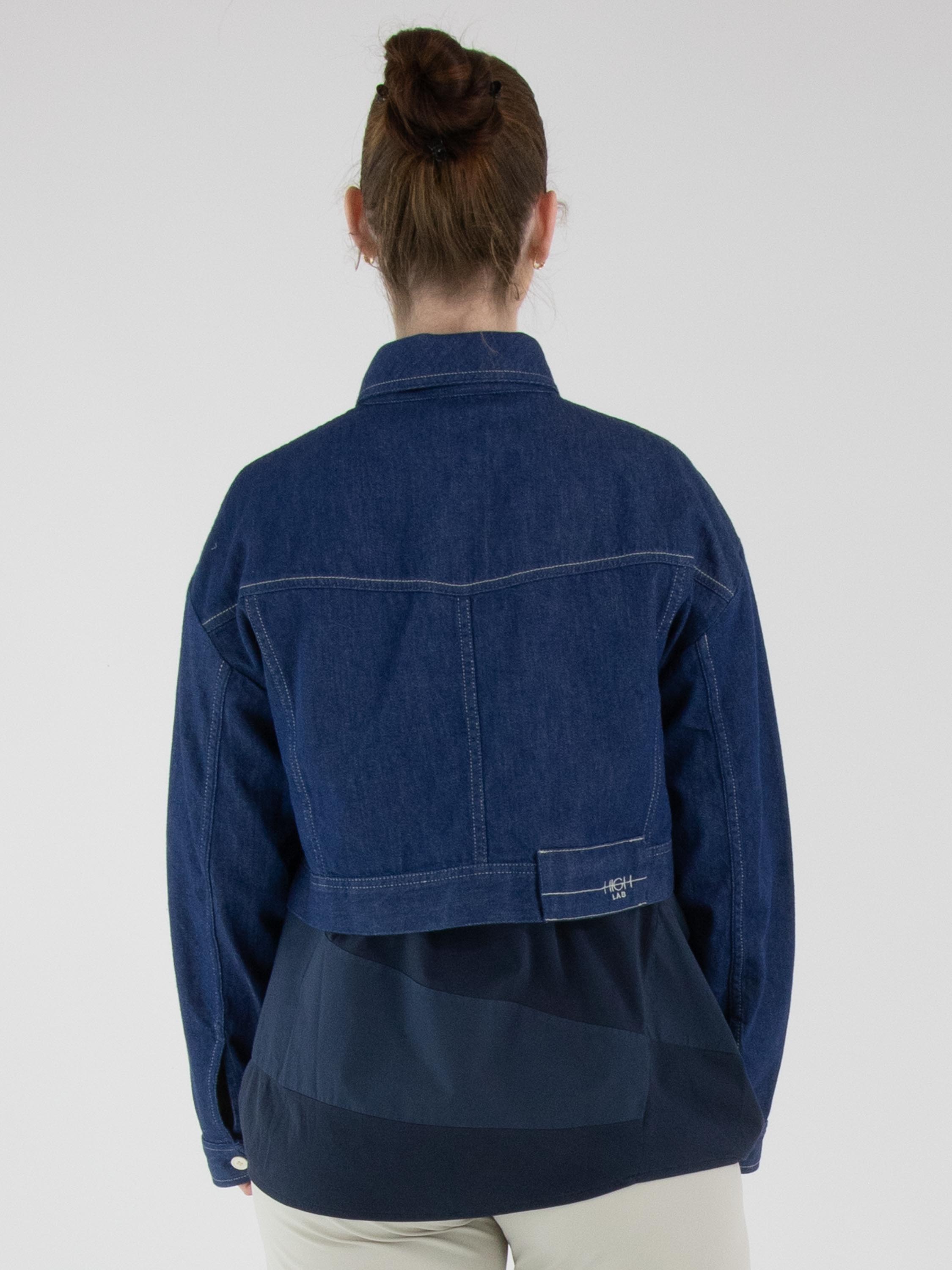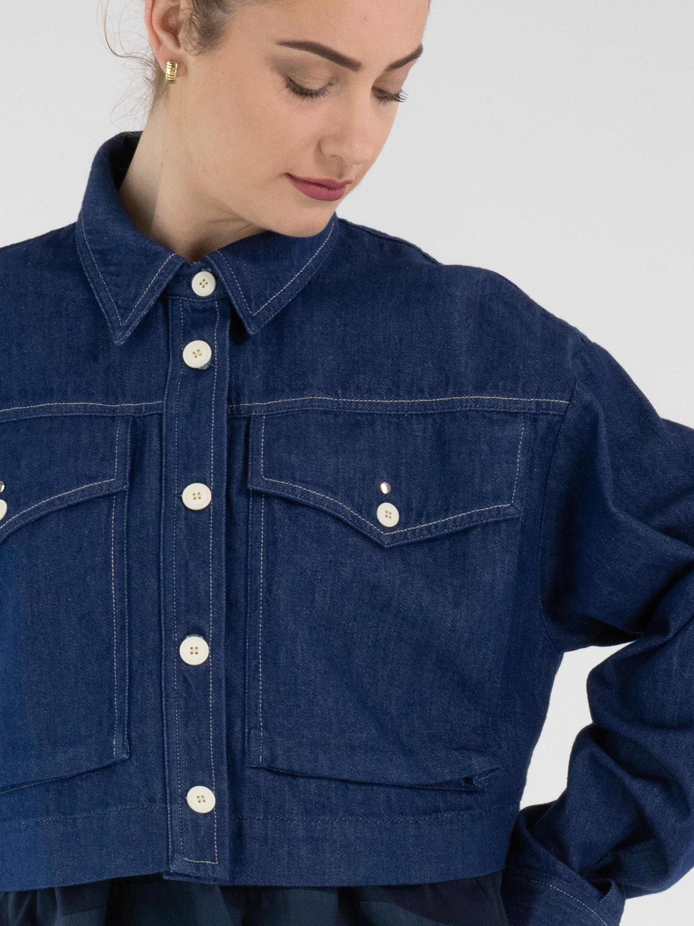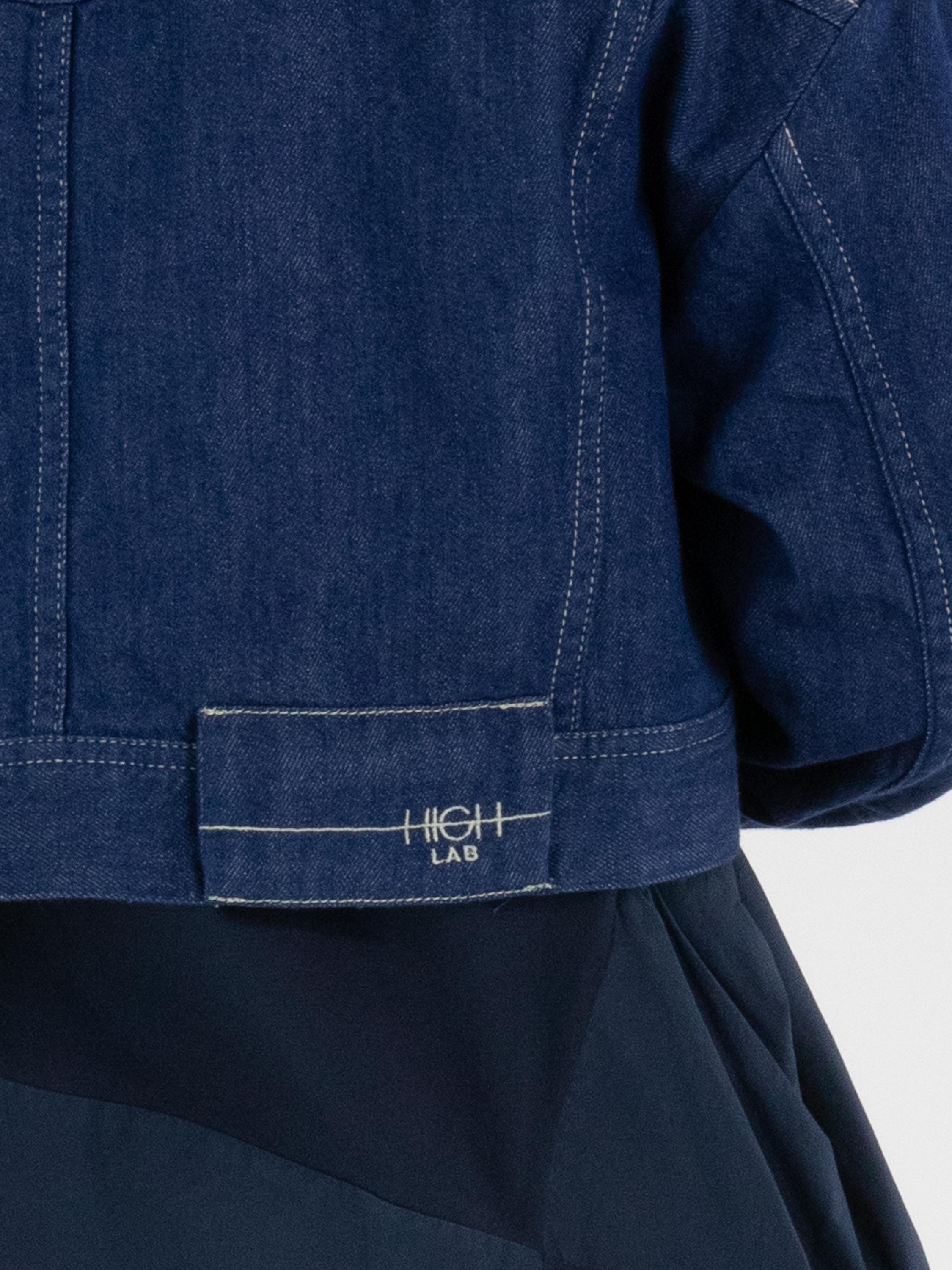 A short denim blazer by High in a rich denim blue shade. The blazer features a fastening with five cream-white buttons. The chest pockets are finished with the same buttons, topped with a silver-coloured stud. This blazer can be washed at 30 degrees.