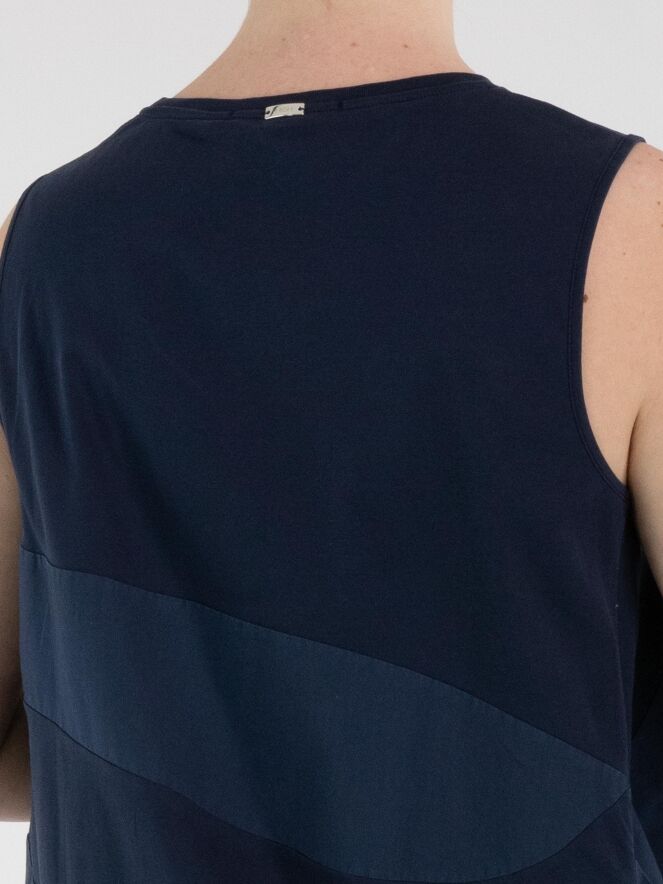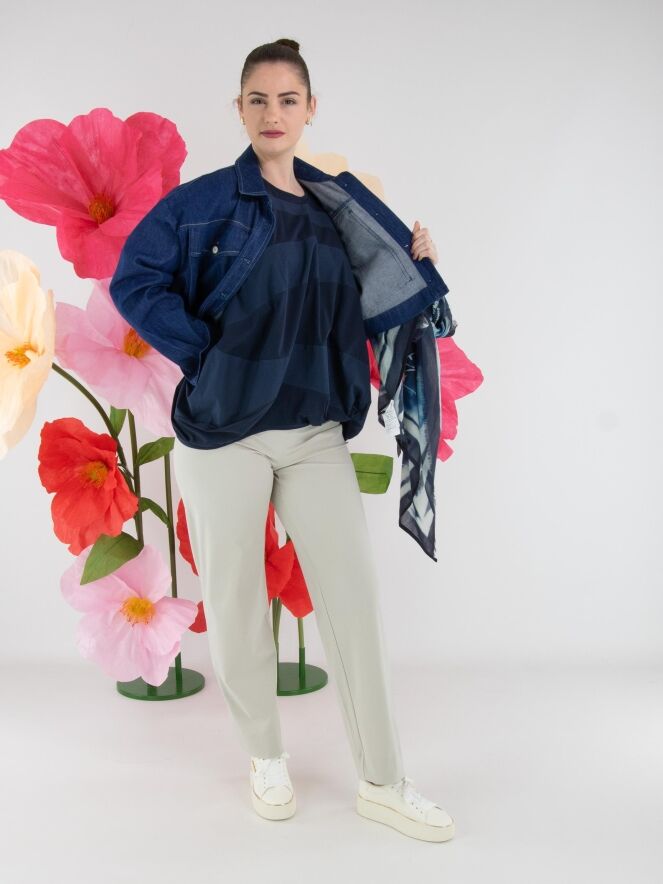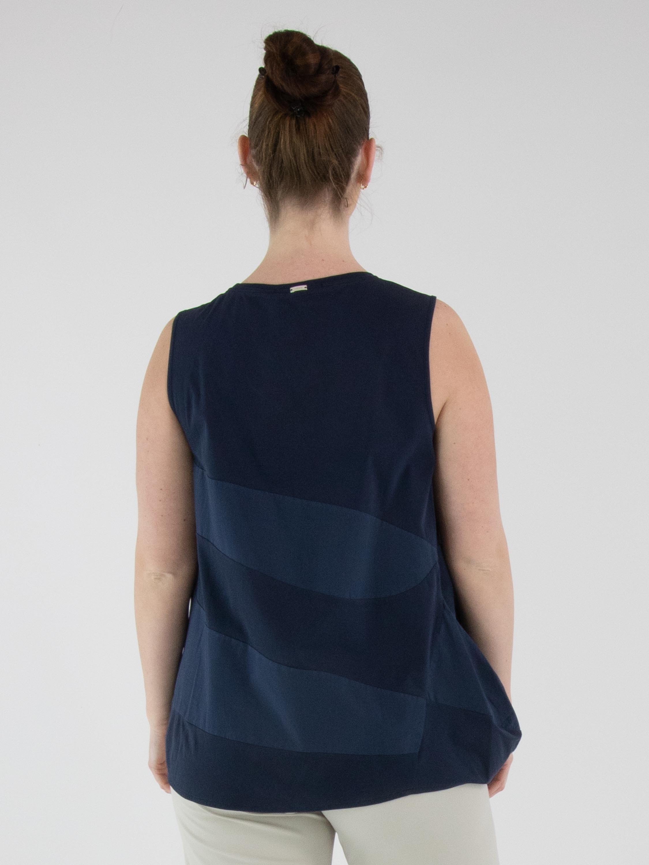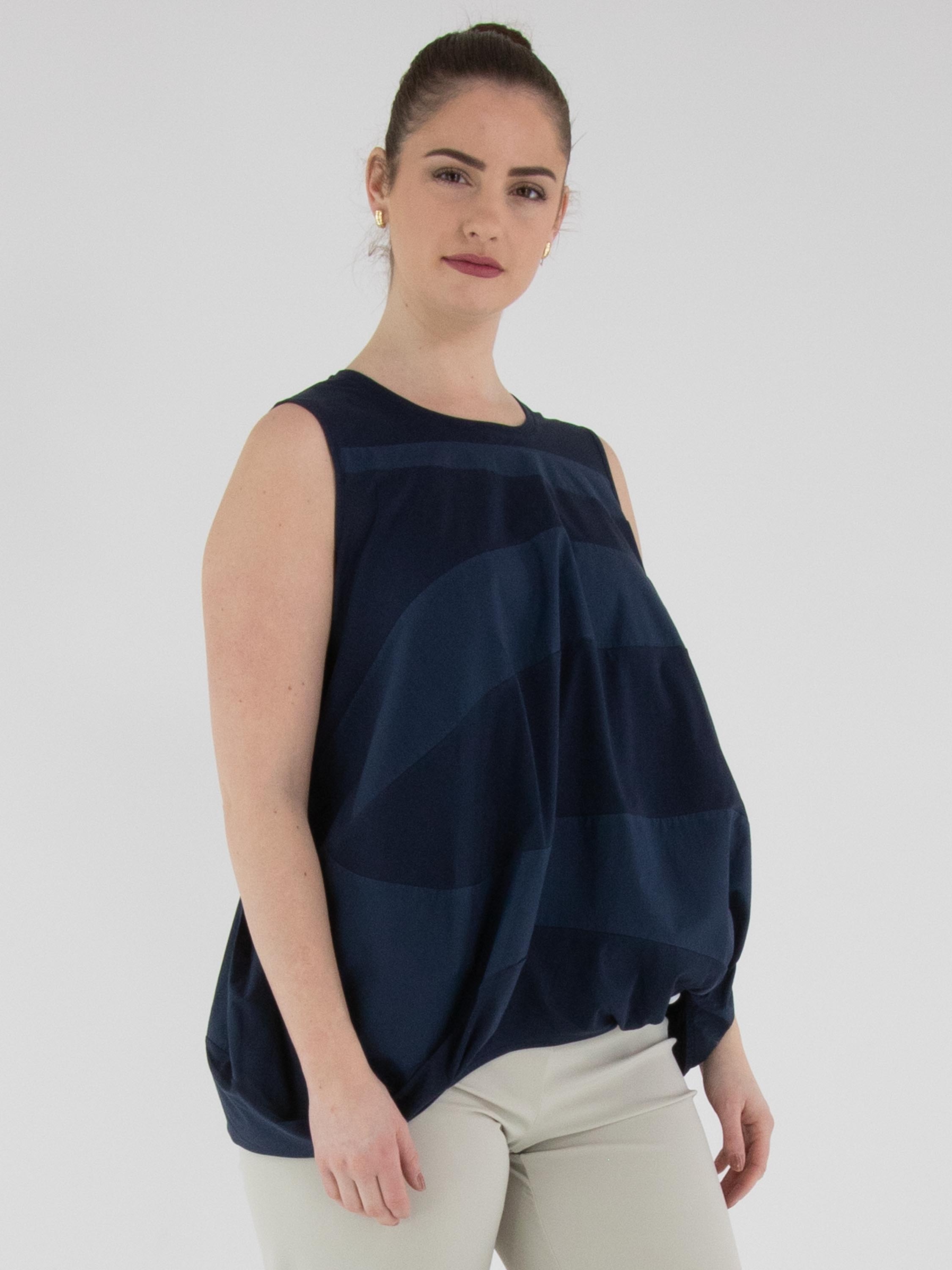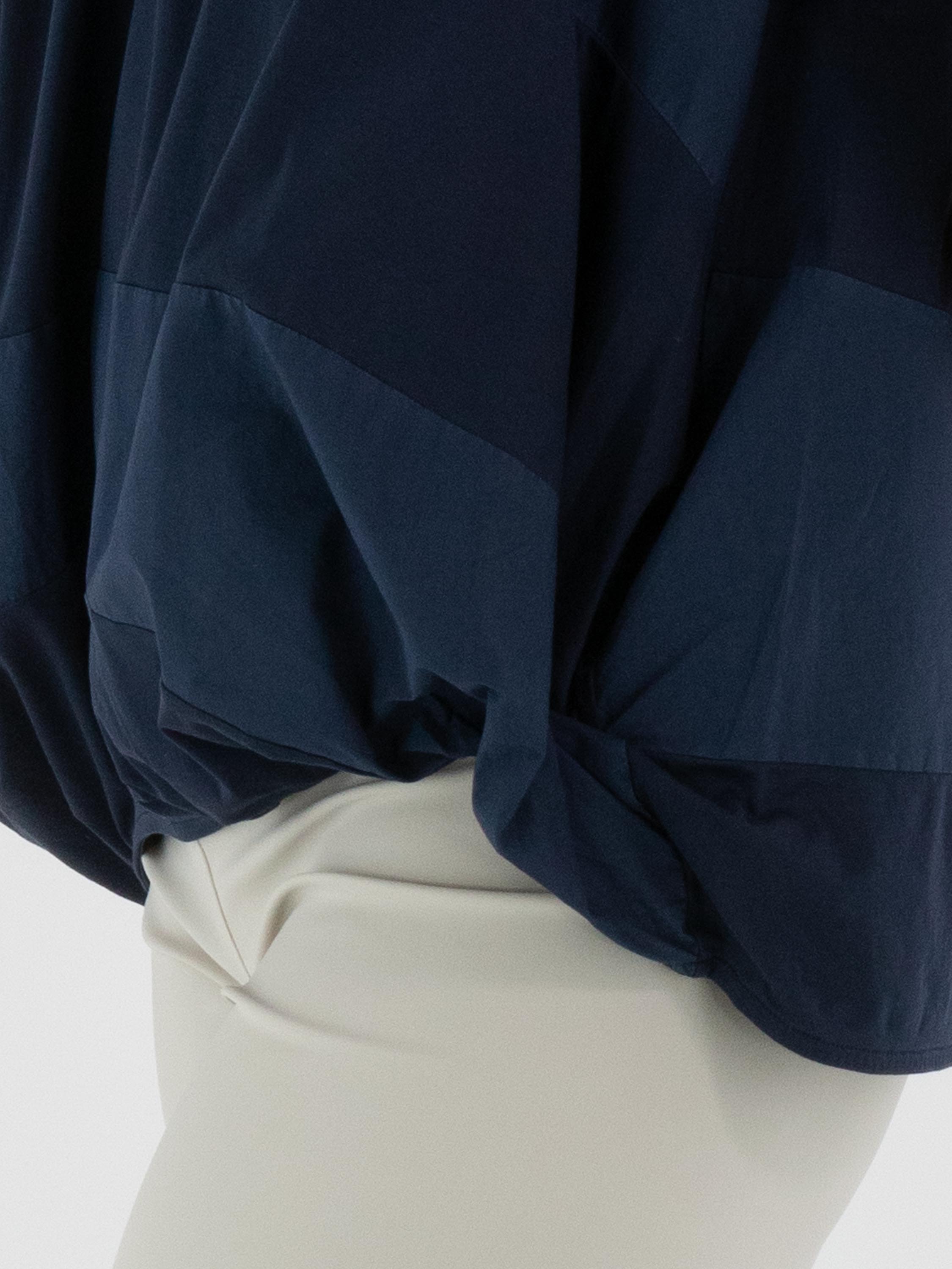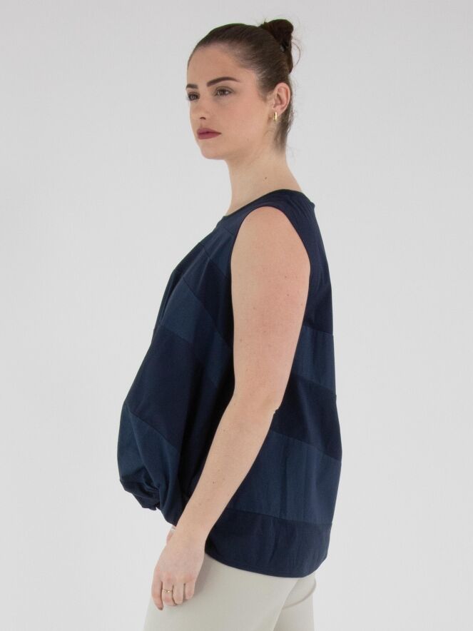 A top by High featuring a wide striped pattern in midnight blue and navy blue. The edge of the round neckline is finished with a finely pleated knit trim. At the hem, the fabric is pleated at the sides. This top can be hand-washed.