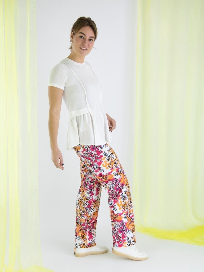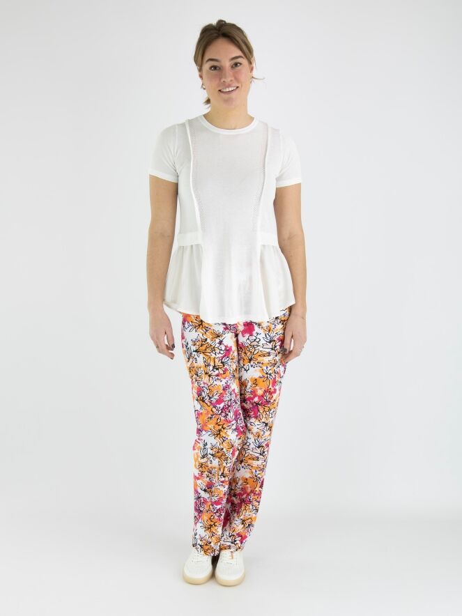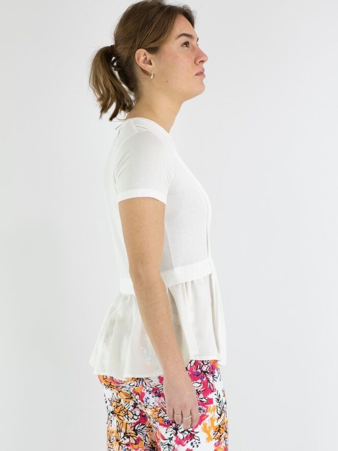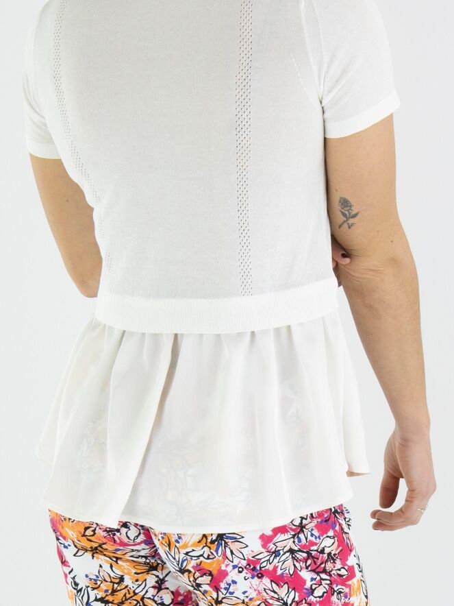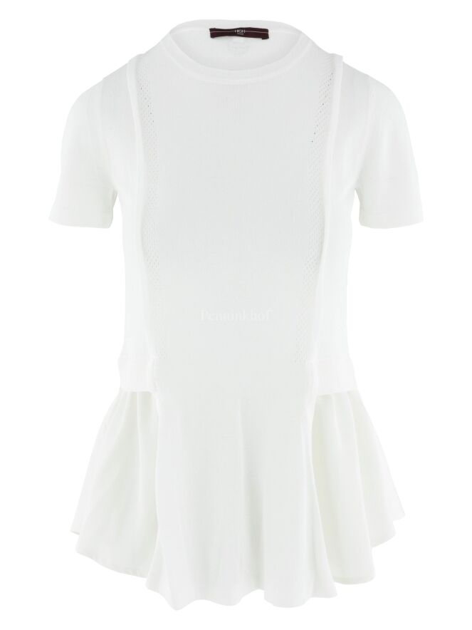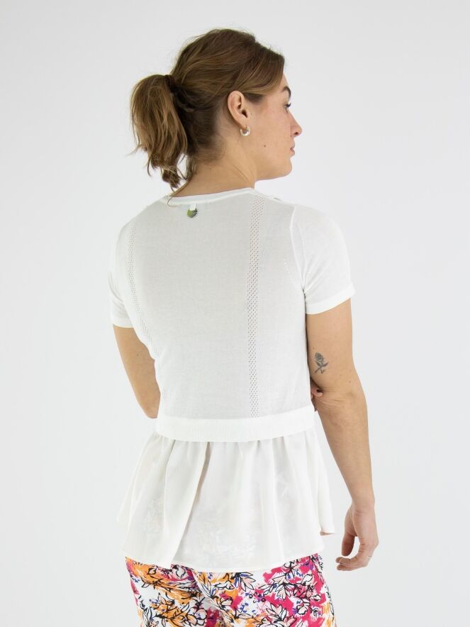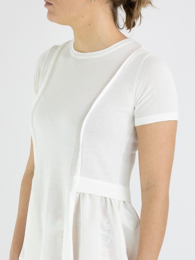 A finely woven shirt by High in cream white. To the left and right of the center, there is an openwork trim, with a finely ribbed knit trim next to it on the front. From the waist, the sides extend to the back with a matte satin fabric. The shirt has short sleeves and can be hand washed.