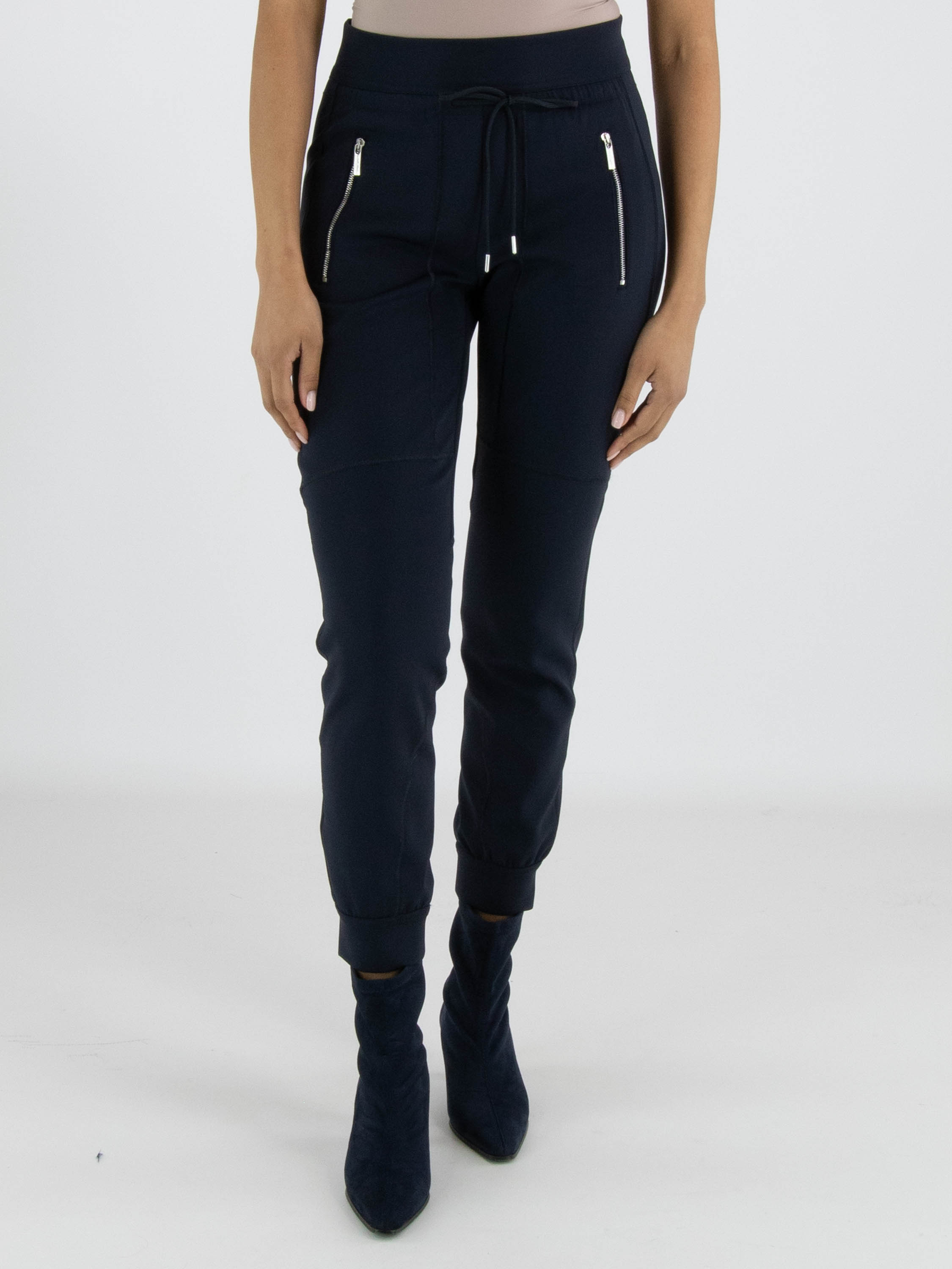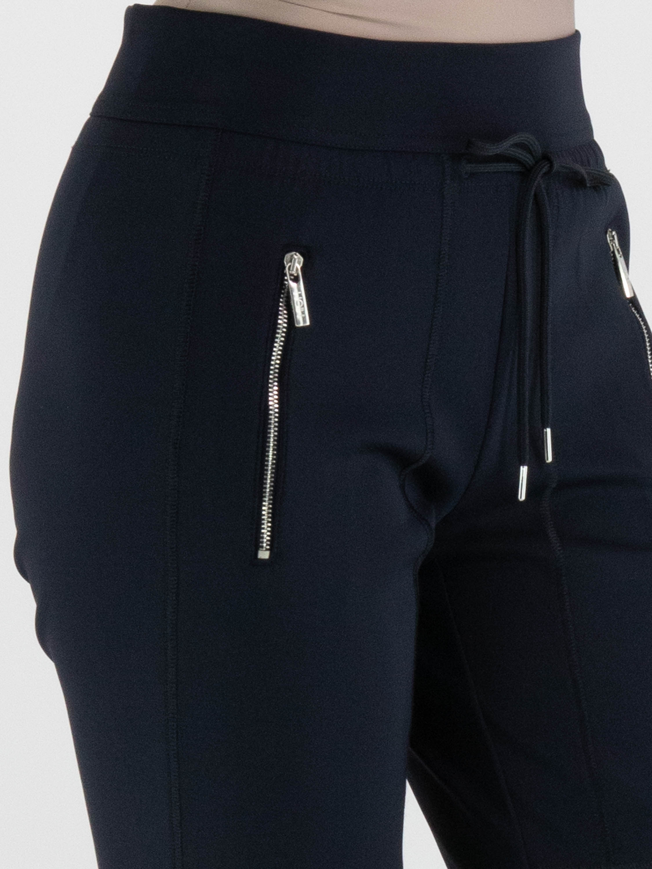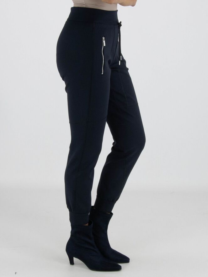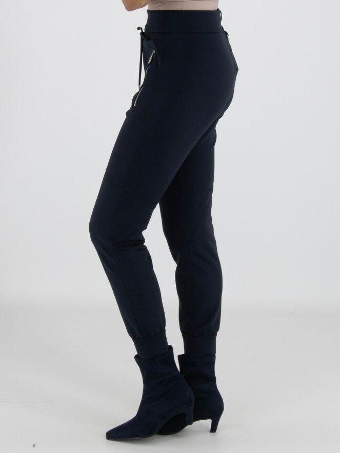 A jogger from High in navy blue. The waistband and the hem of the legs feature a smooth elastic band. Just below the waistband, a drawstring runs through a tunnel design. The deep slit pockets have zip closures. On the thigh, around the knees, and along the sides of the lower leg, several decorative seams are applied. These trousers can be washed at 30 degrees.