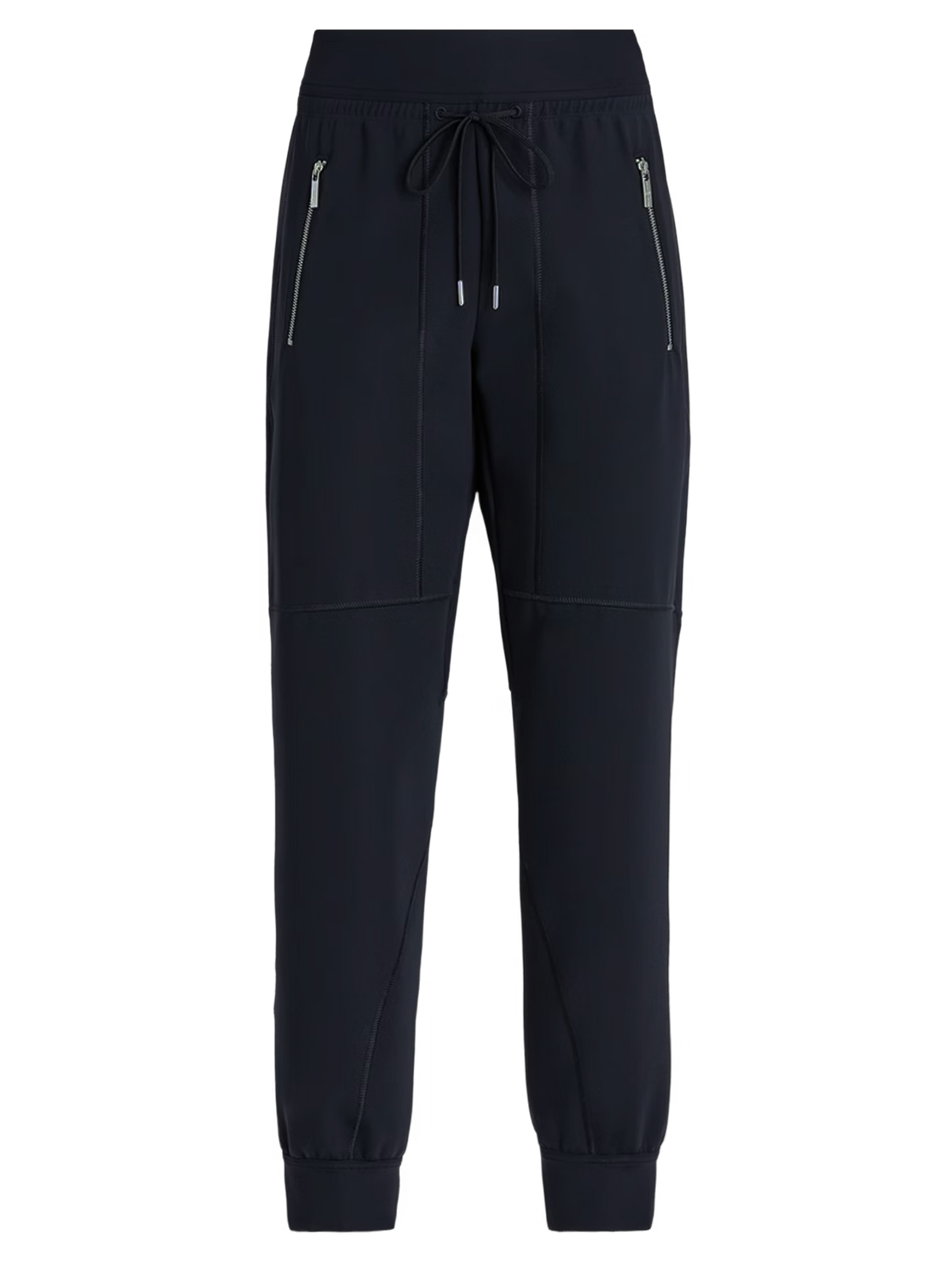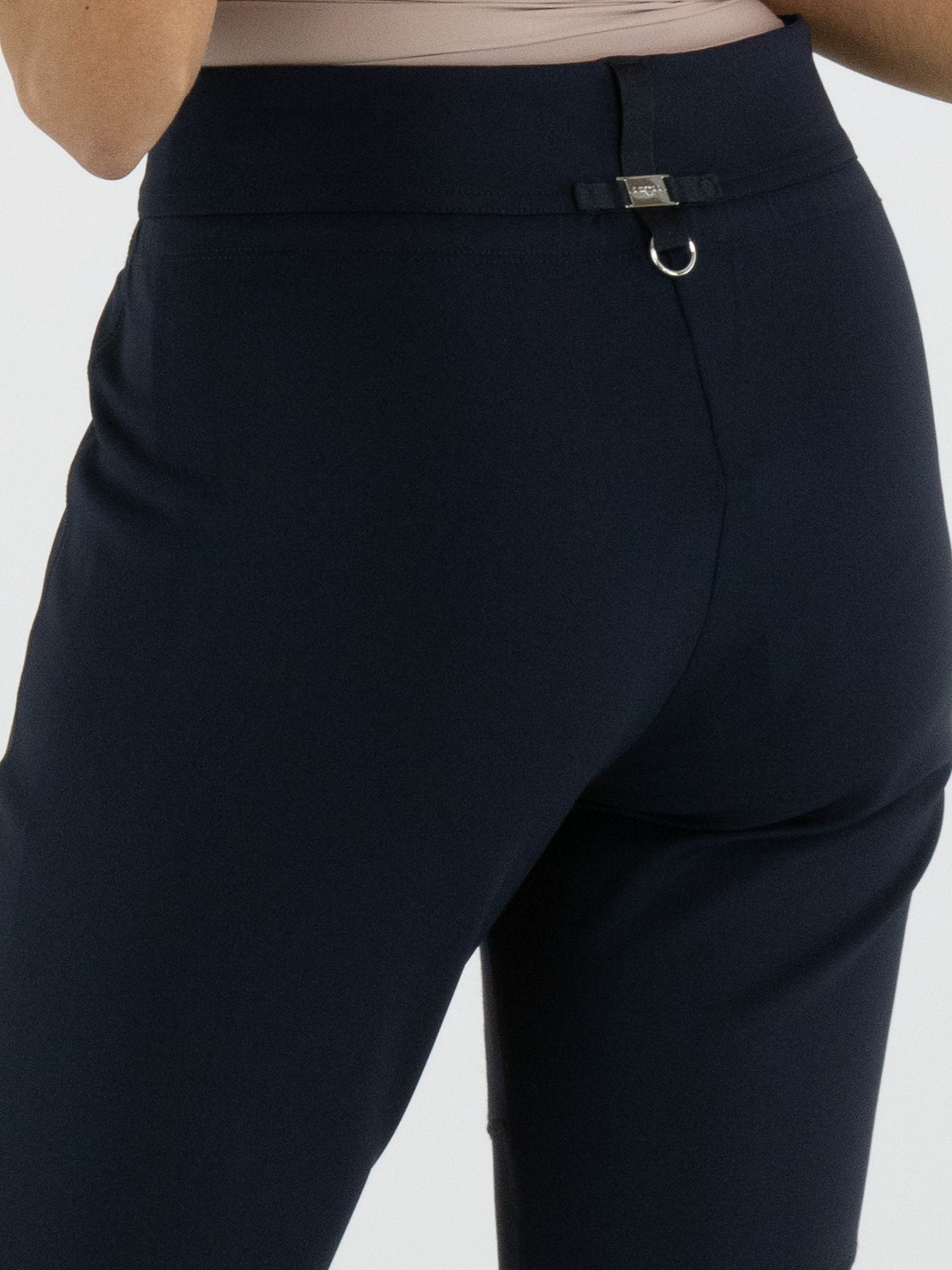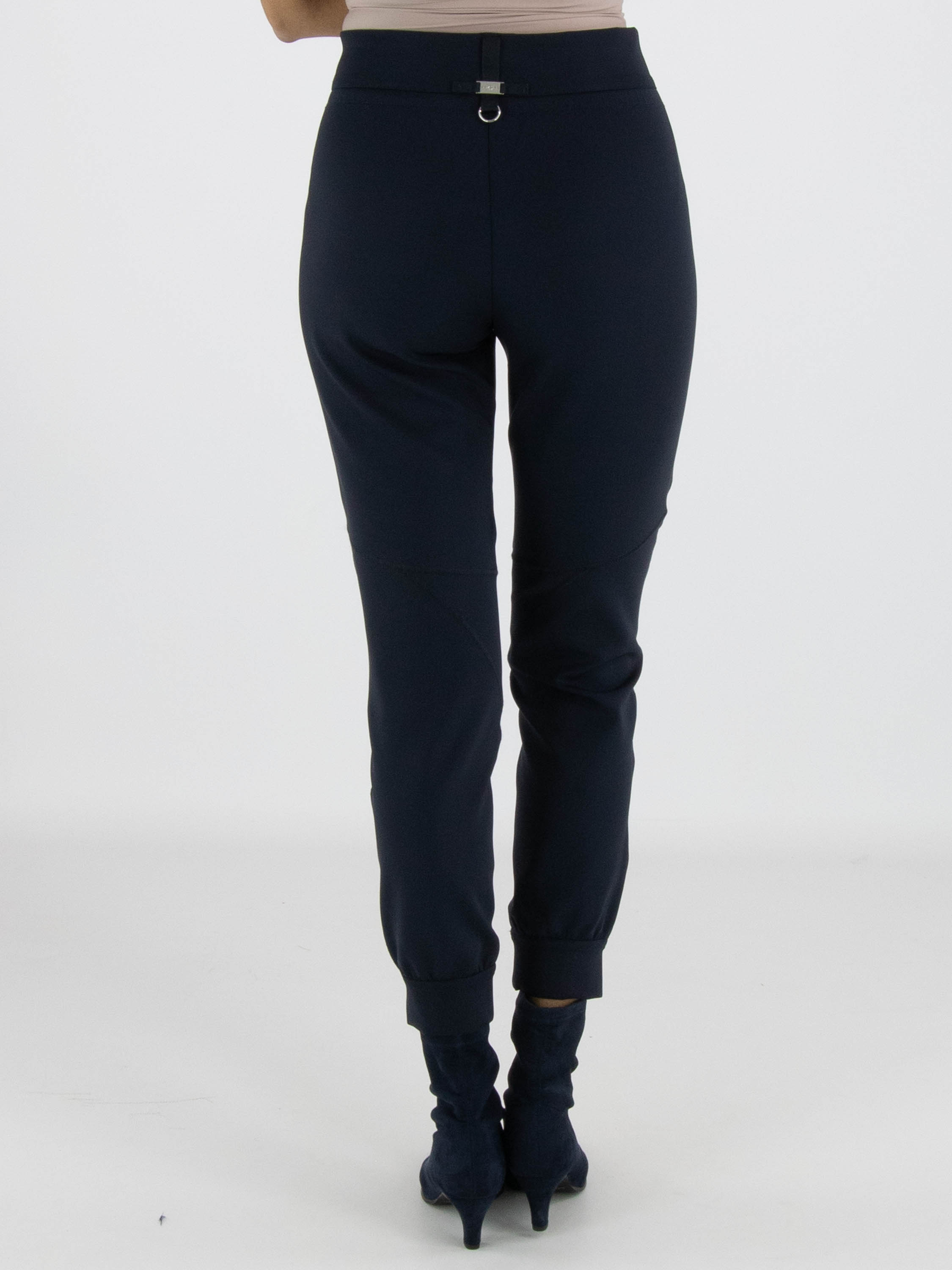 A jogger from High in navy blue. The waistband and the hem of the legs feature a smooth elastic band. Just below the waistband, a drawstring runs through a tunnel design. The deep slit pockets have zip closures. On the thigh, around the knees, and along the sides of the lower leg, several decorative seams are applied. These trousers can be washed at 30 degrees.