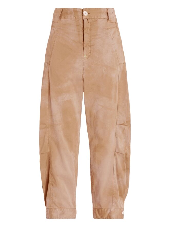 A High trouser featuring a tone-on-tone batik-inspired print in multiple Mediterranean rust shades. Short dart seams at knee level subtly shape and define the silhouette. The legs taper slightly towards the hem and are finished with a decorative white button at the edge. The trousers include side pockets and can be washed at 30 degrees.