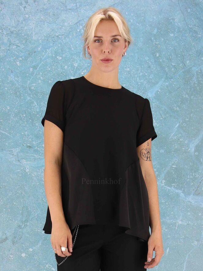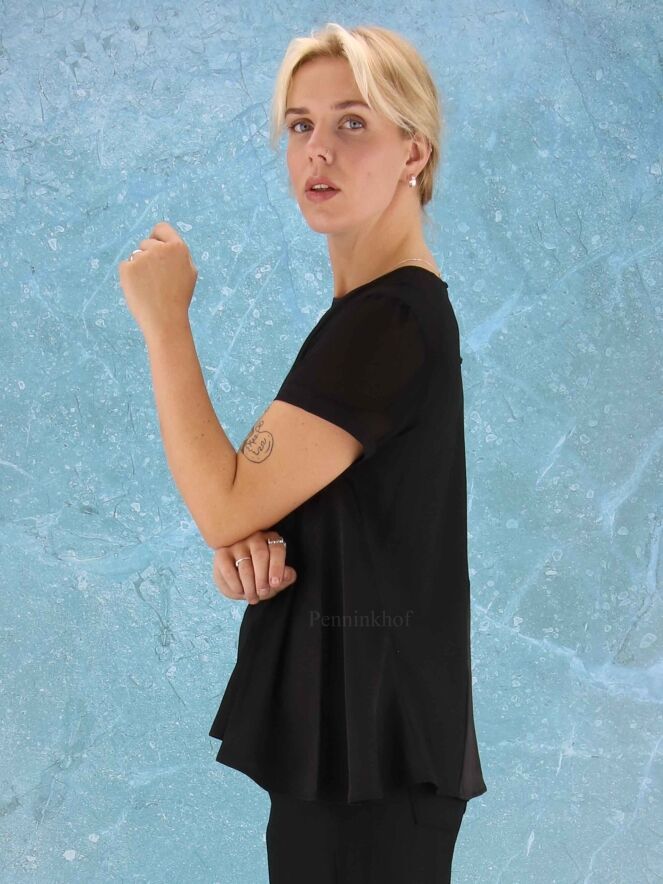 A shirt from High in 2 colors of black in a matt satin fabric. The short sleeves are slightly transparent. The shirt has a wide A-Line and can be washed by hand.