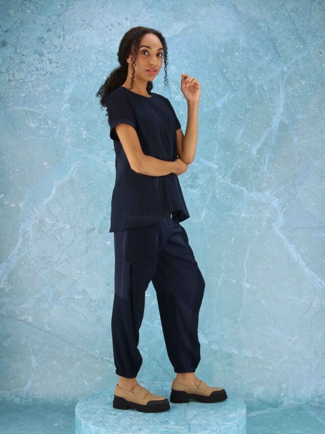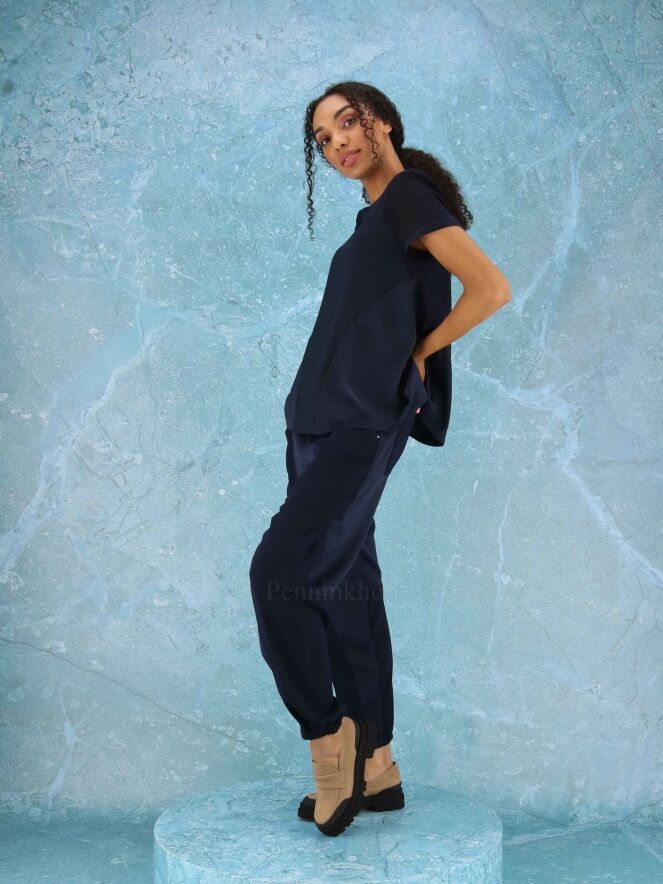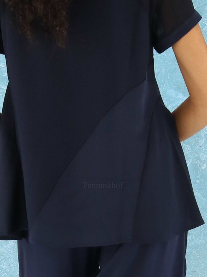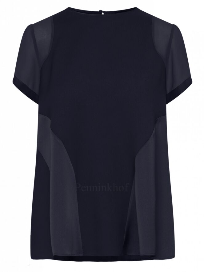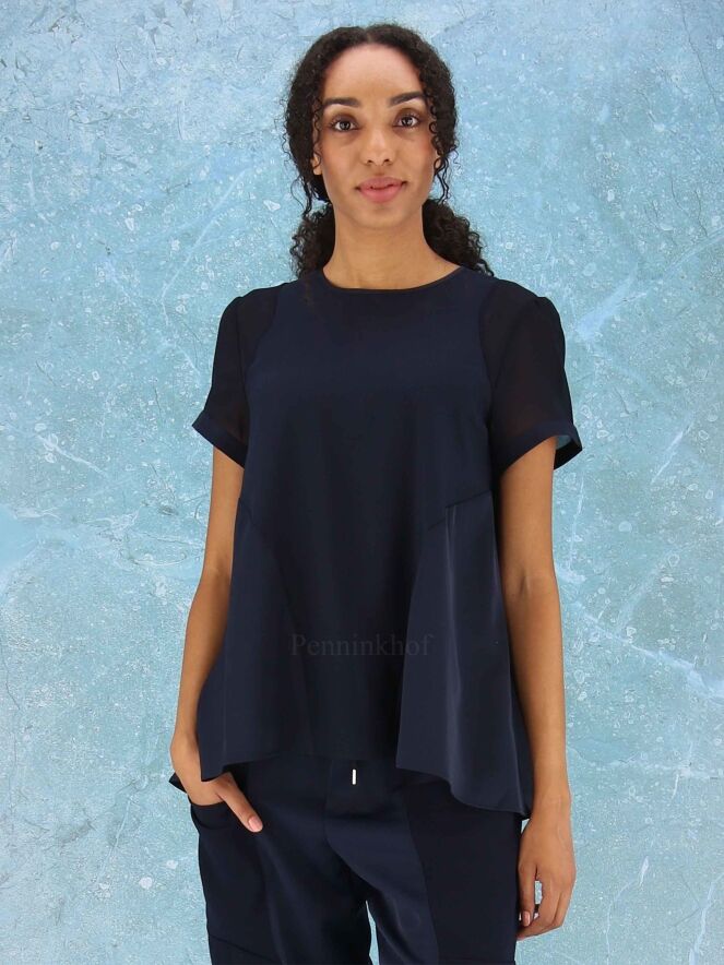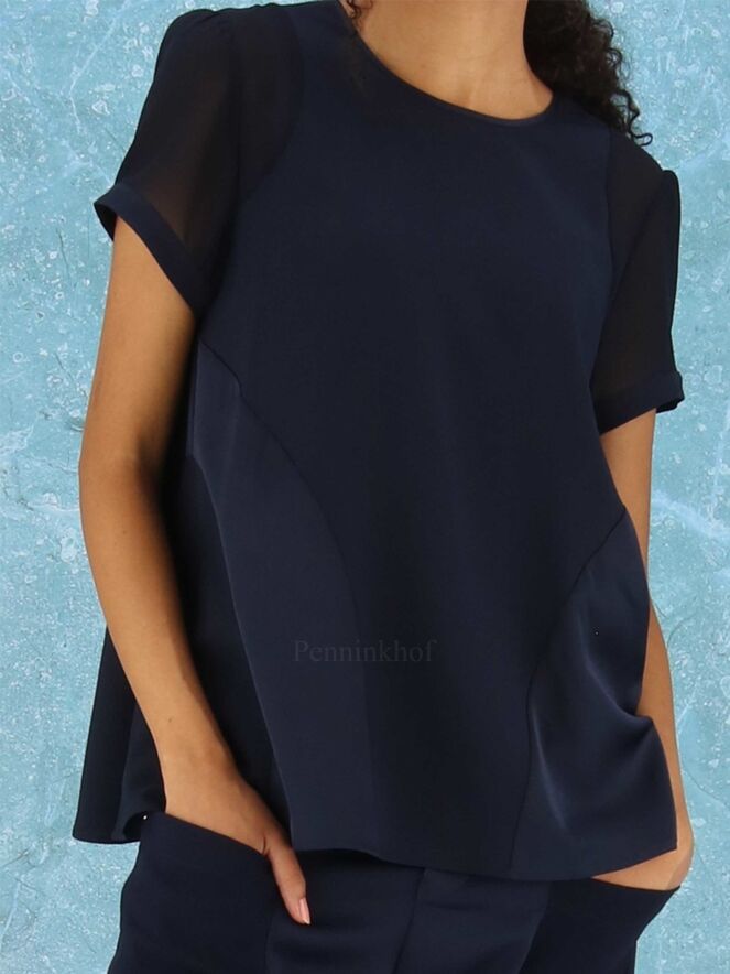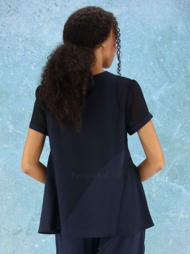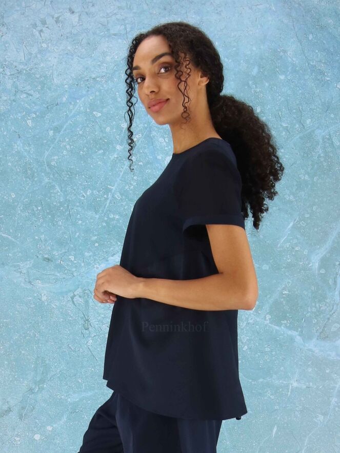 A shirt from High in 2 colors of navy bleu in a matt satin fabric. The short sleeves are slightly transparent. The shirt has a wide A-Line and can be washed by hand.