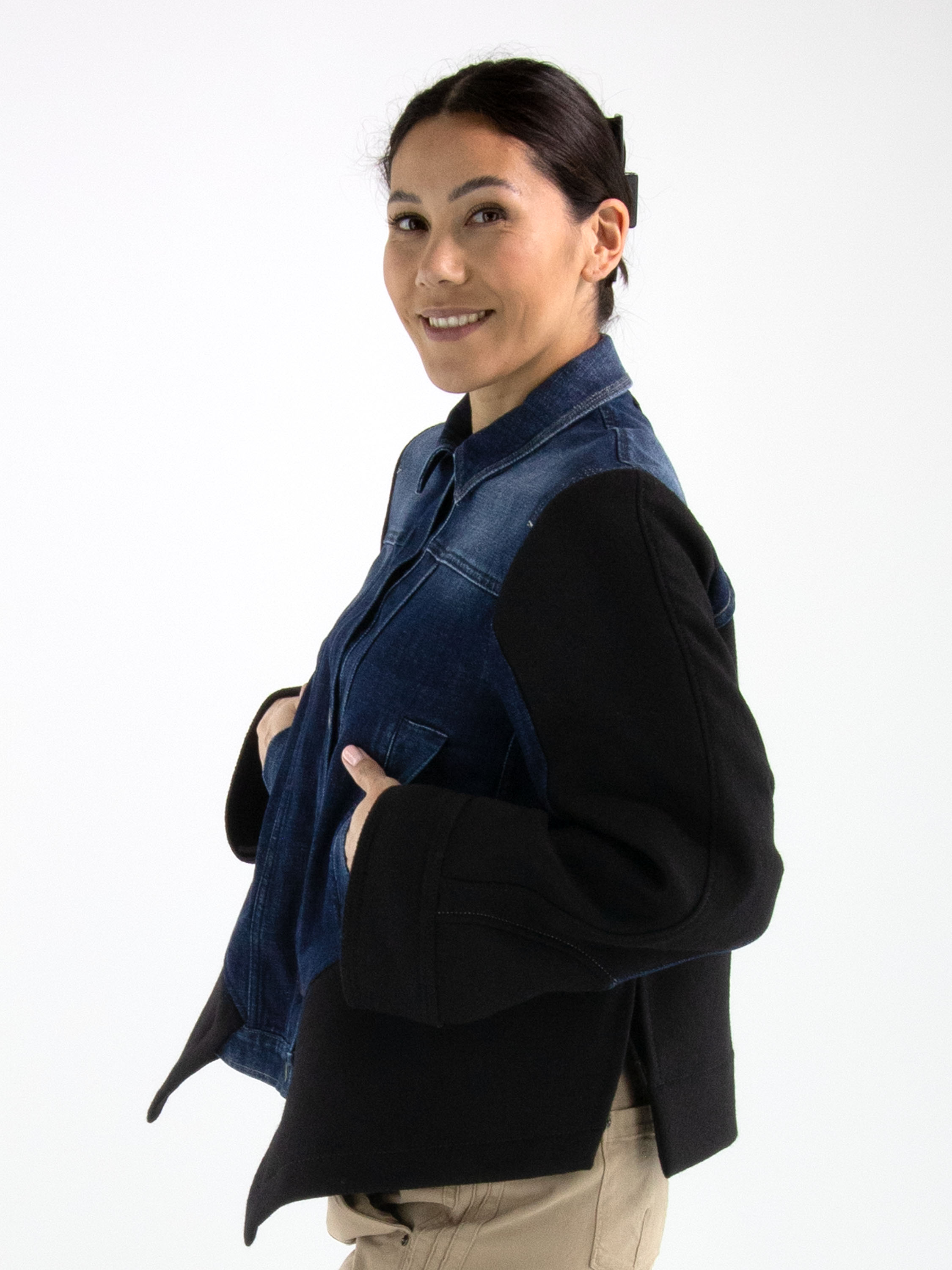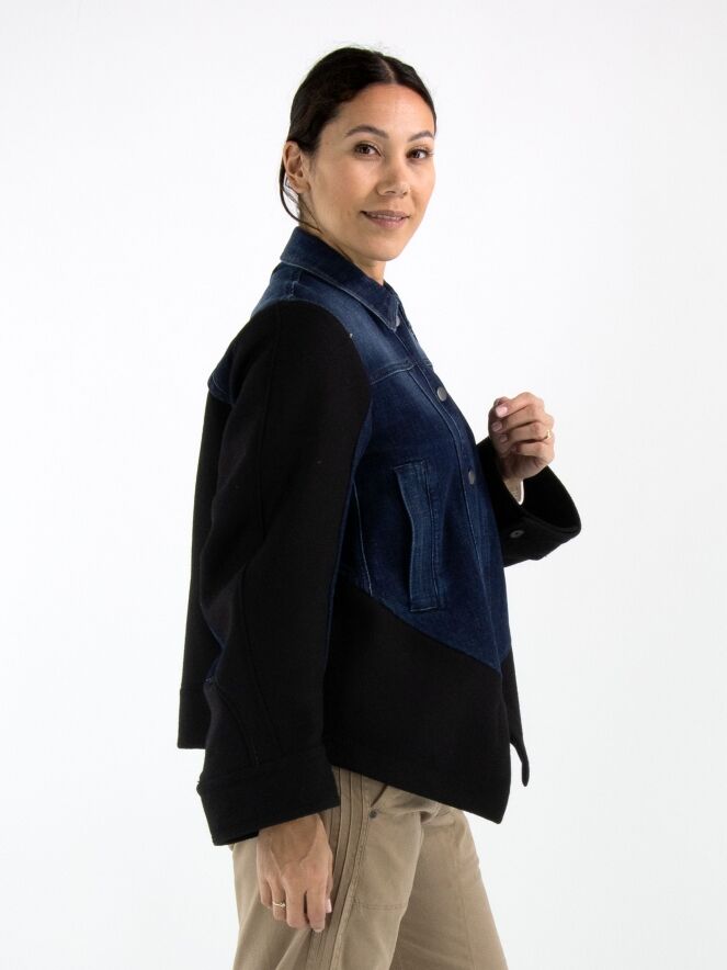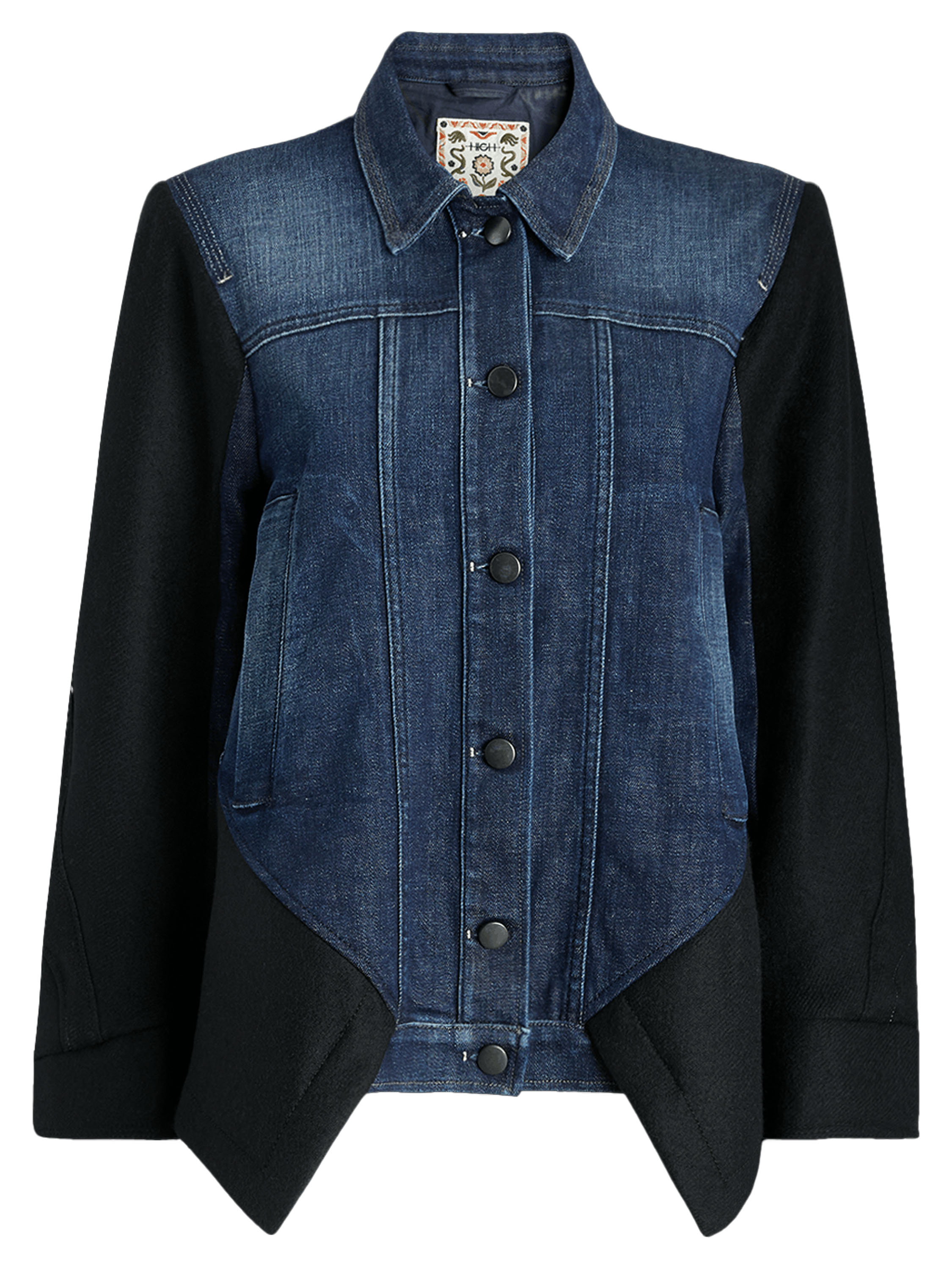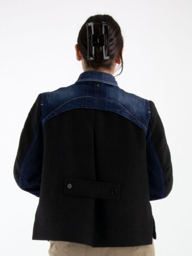A denim blazer from High in dark denim, combined with luxurious boiled wool at the back, hemline, and partly on the sleeves. The blazer features a button closure and slit pockets at the waist. This blazer must not be washed.