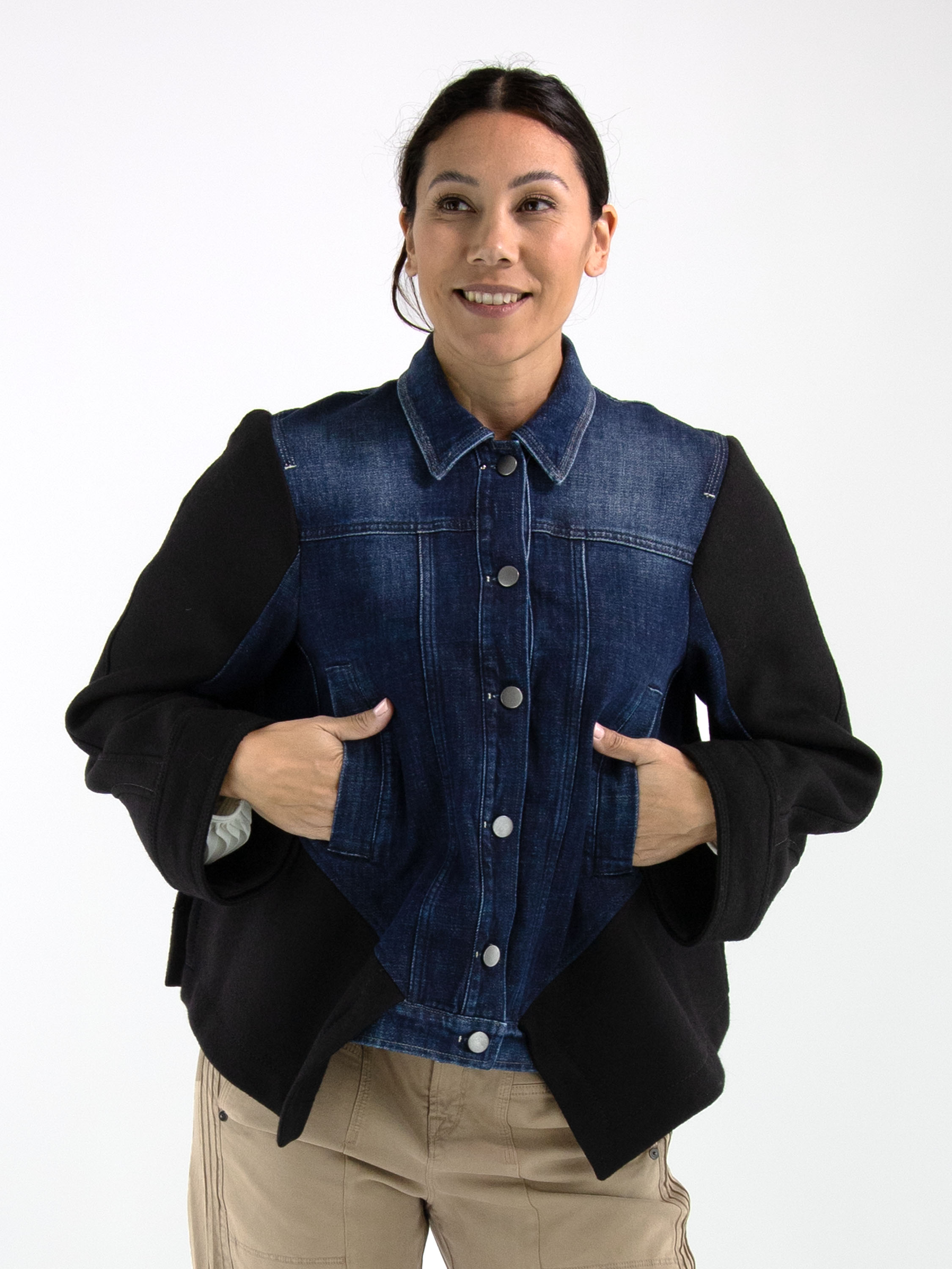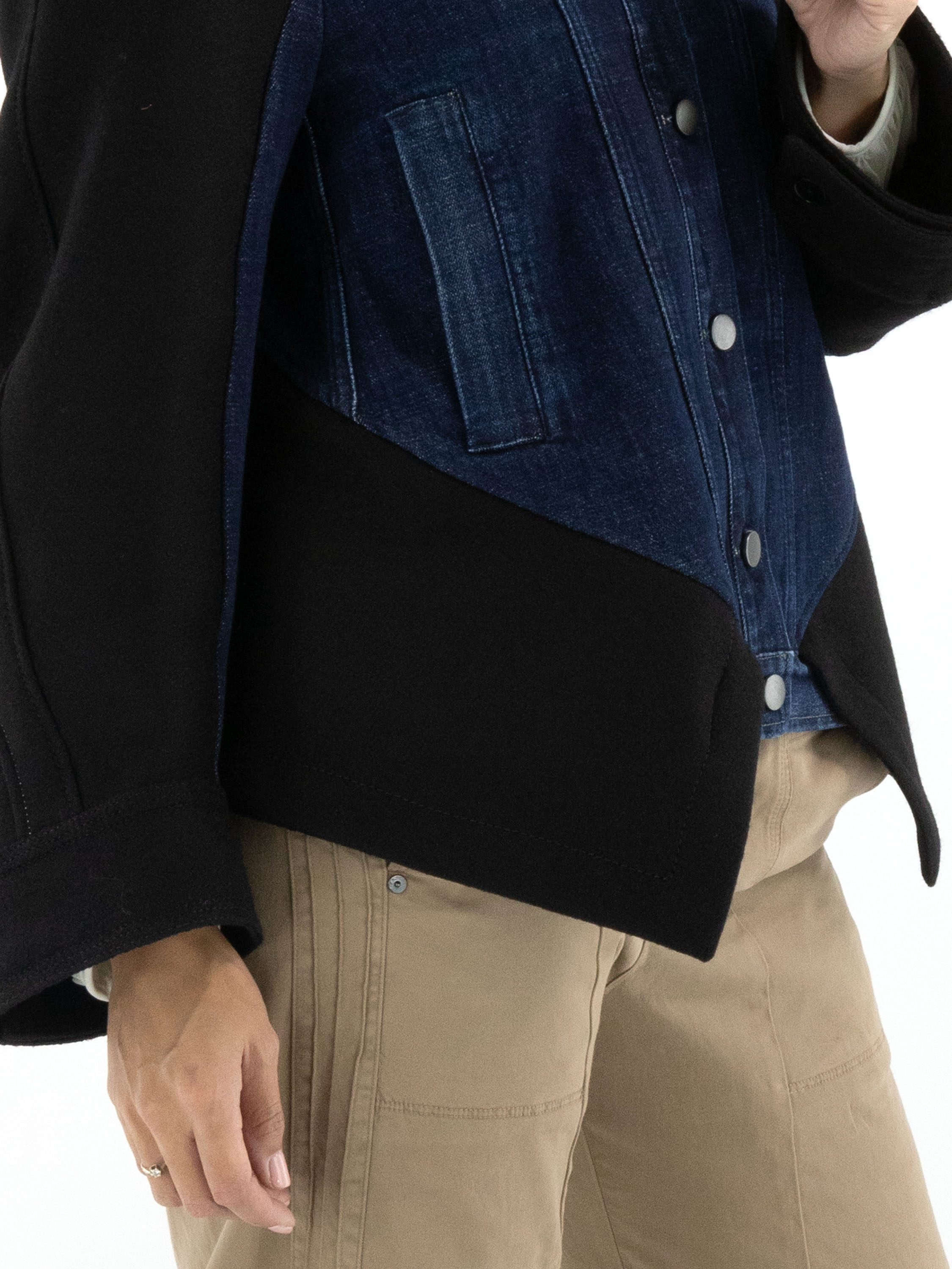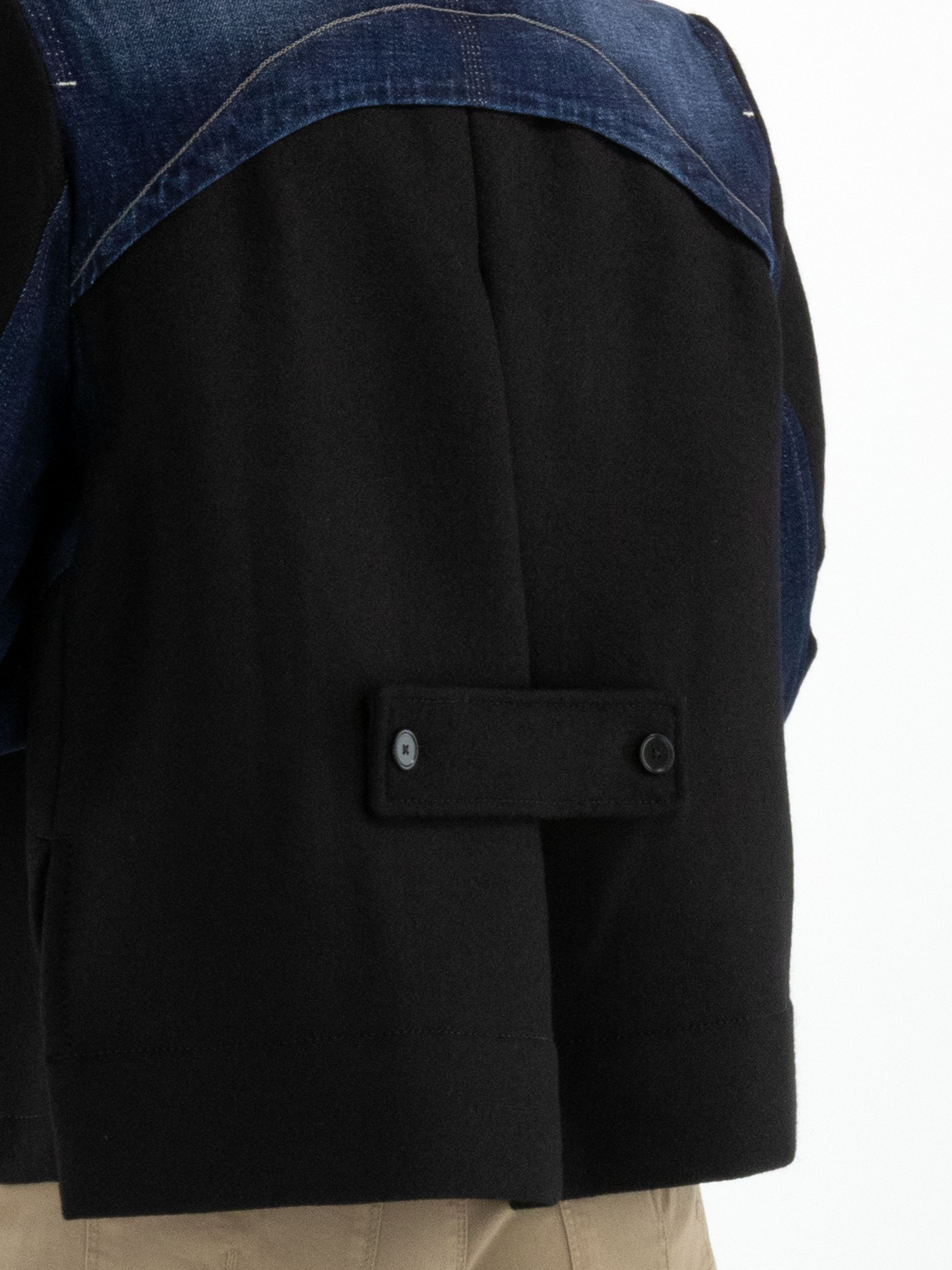 A denim blazer from High in dark denim, combined with luxurious boiled wool at the back, hemline, and partly on the sleeves. The blazer features a button closure and slit pockets at the waist. This blazer must not be washed.