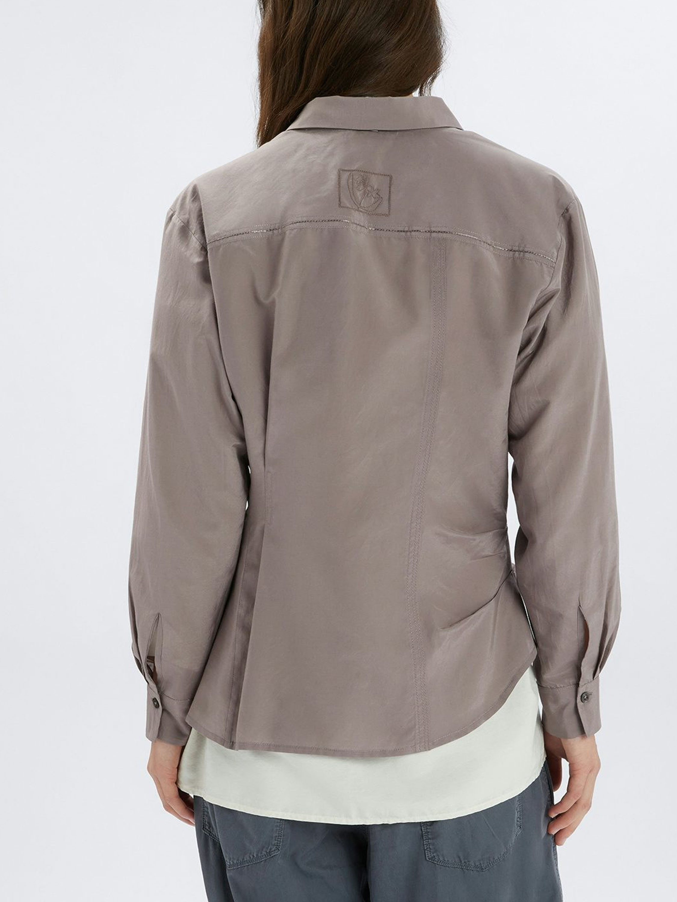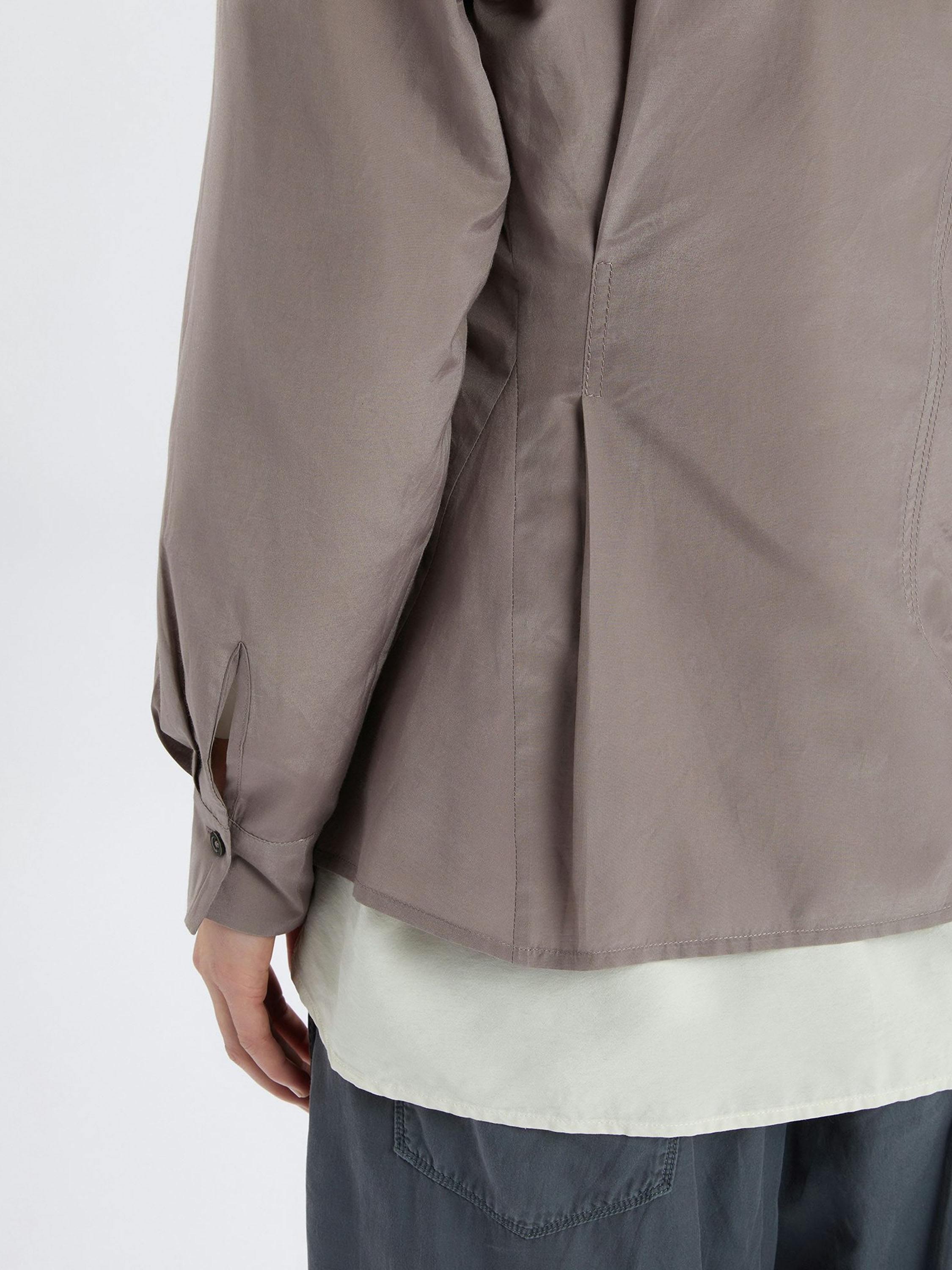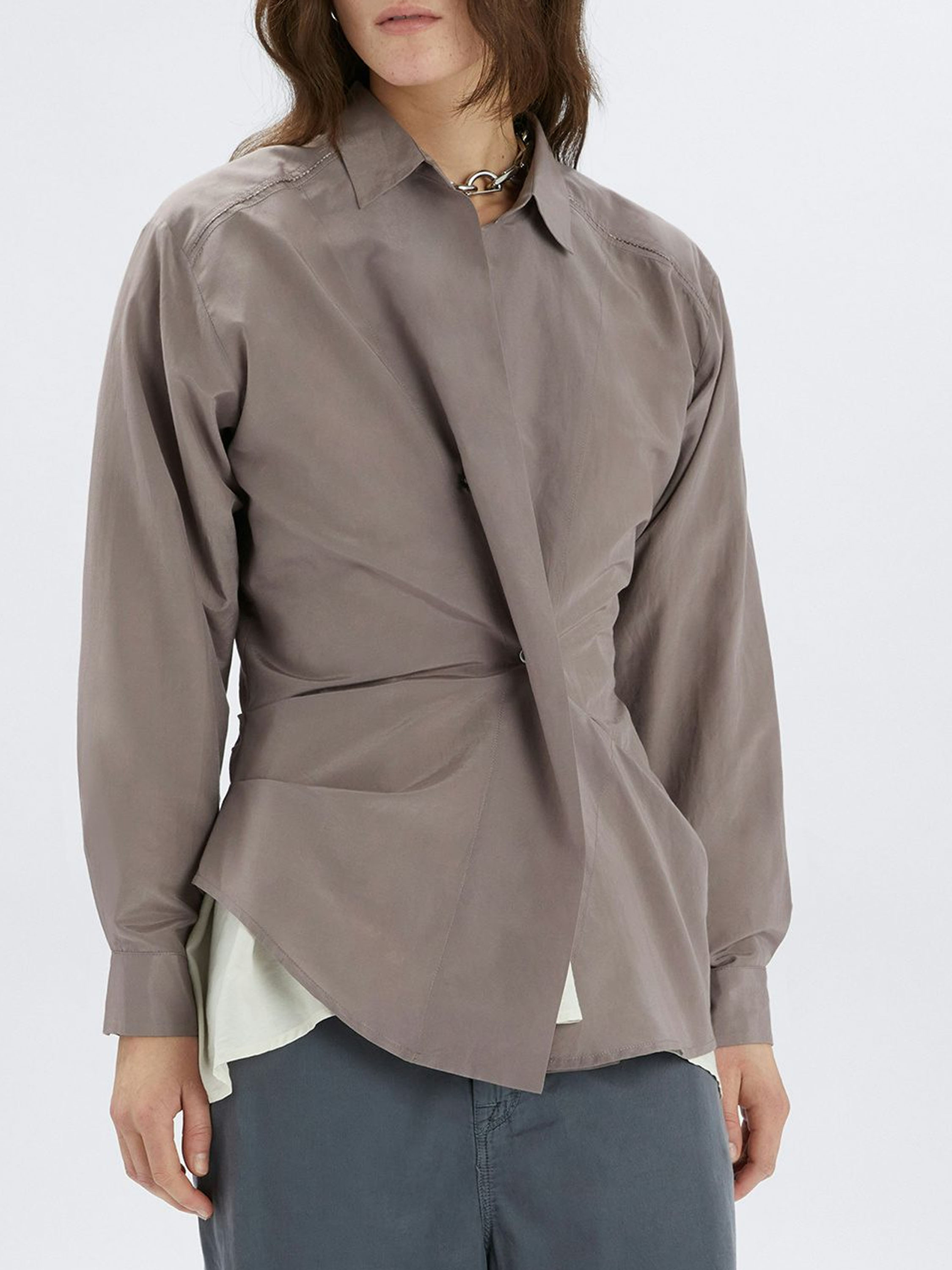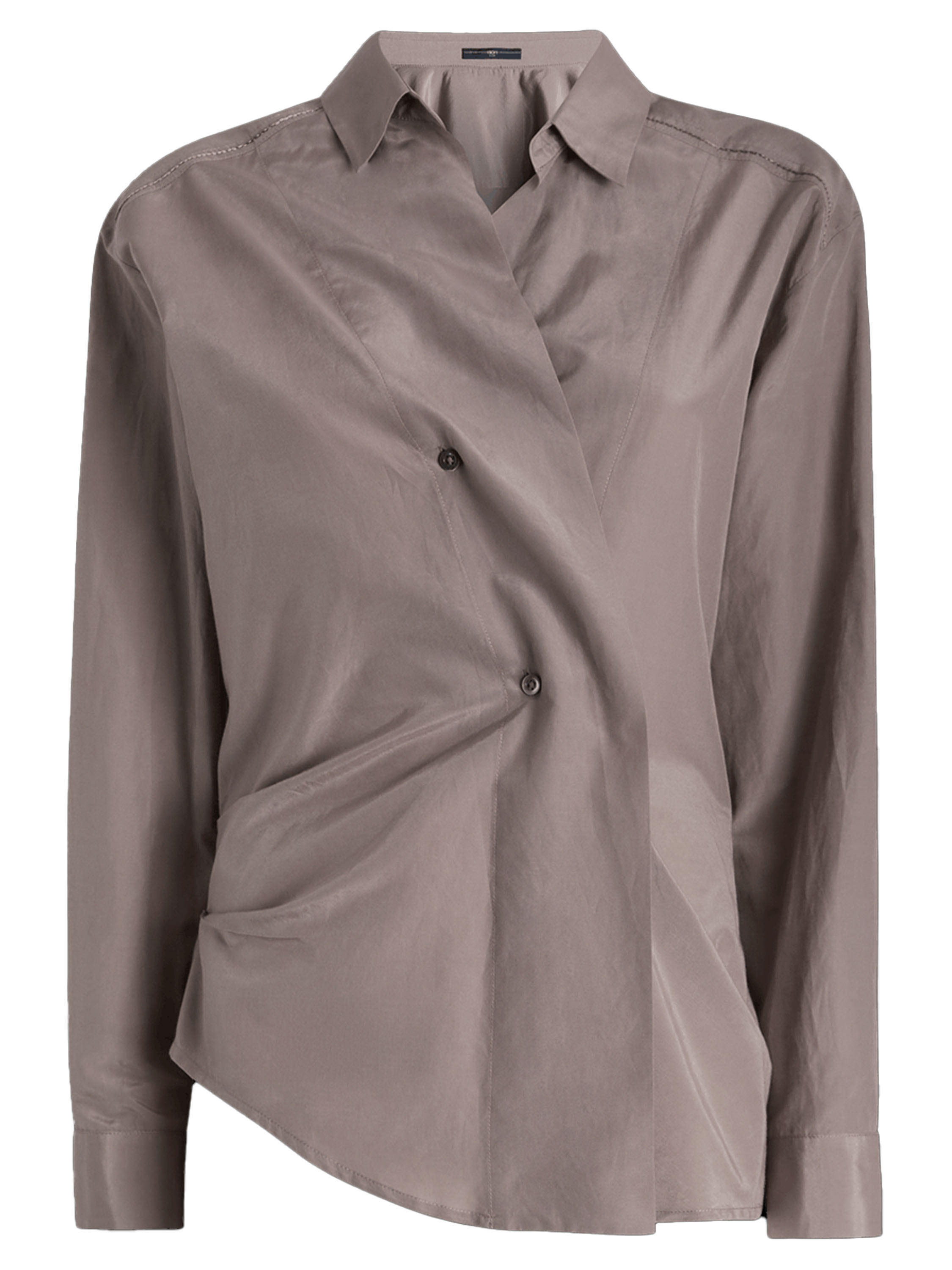 A blouse by High in a lavender shade. The blouse features a diagonal fastening with two buttons. From the collar, the fabric falls as a long lapel over the closure. At the waist, small gathers along the sides create a softly pleated effect. This blouse can be hand-washed.