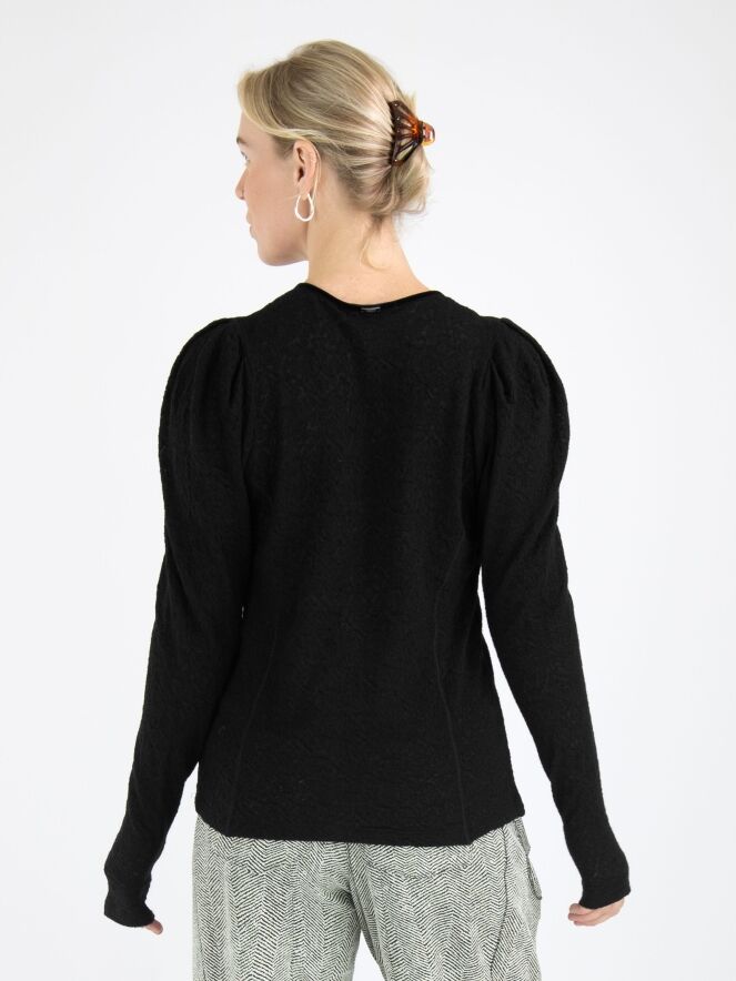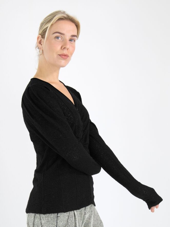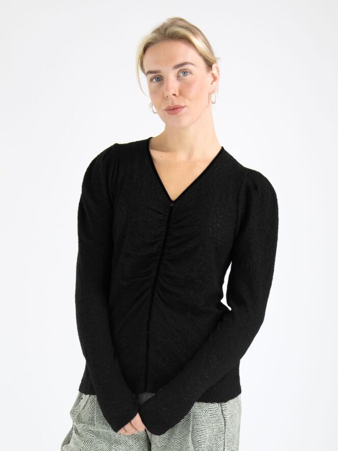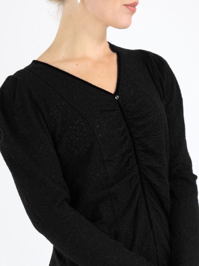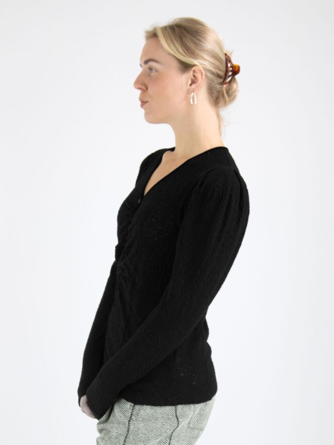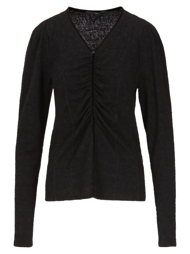 A light, transparent shirt by High in a textured pattern in black color. Along the edge of the V-neckline is a velvet trim that continues down from the midpoint of the V-neck. The fabric is finely pleated along this trim. This shirt can be hand-washed.