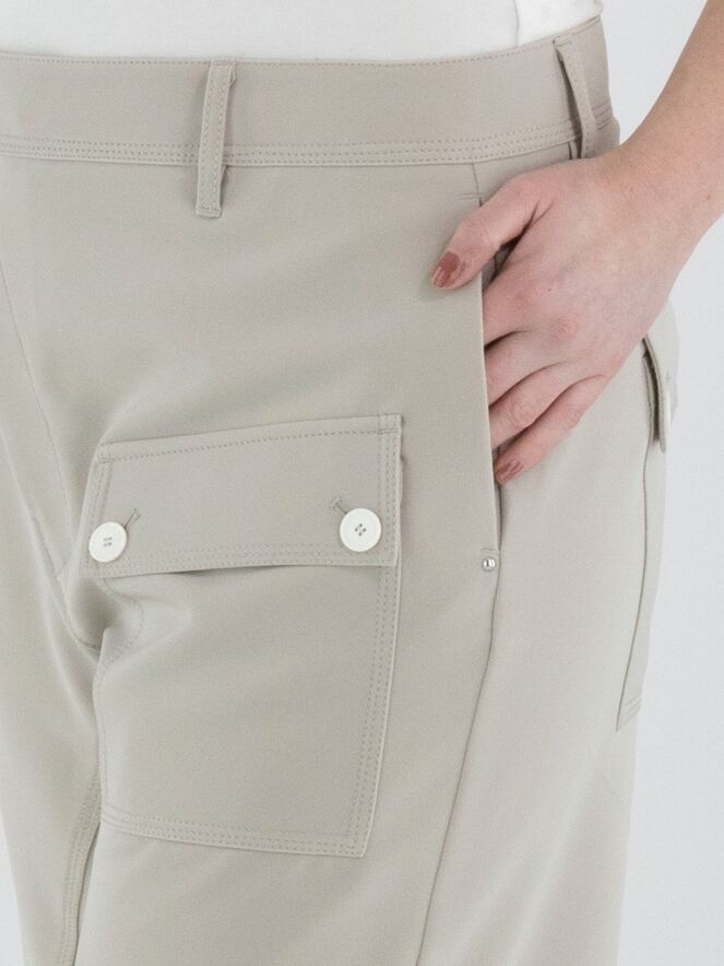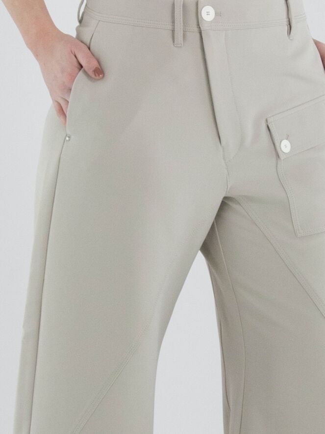 Trousers from High in beige. The trousers feature a diagonal zip fastening. At the bottom of the slit pockets, a silver-coloured stud is placed. A pocket is positioned on the left upper leg. At the front, there is a decorative diagonal seam. These trousers can be hand-washed.