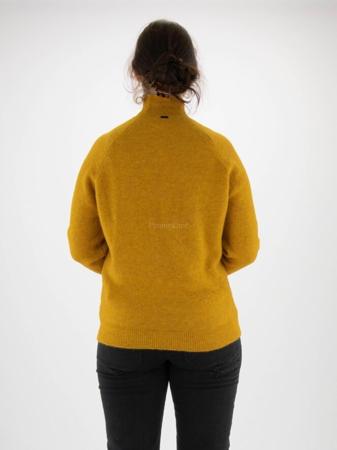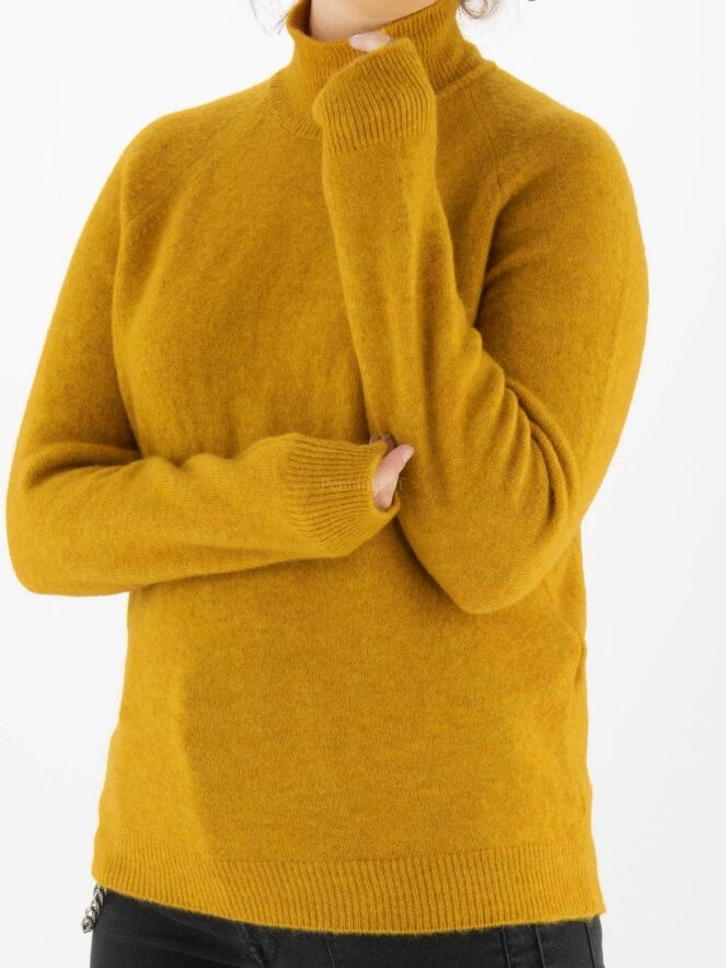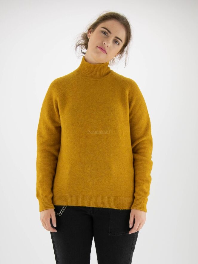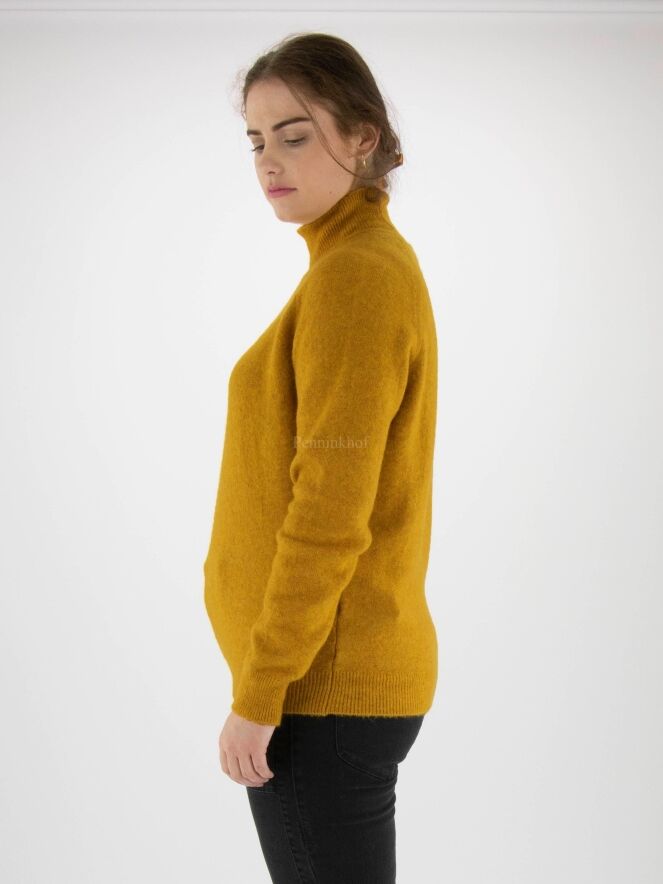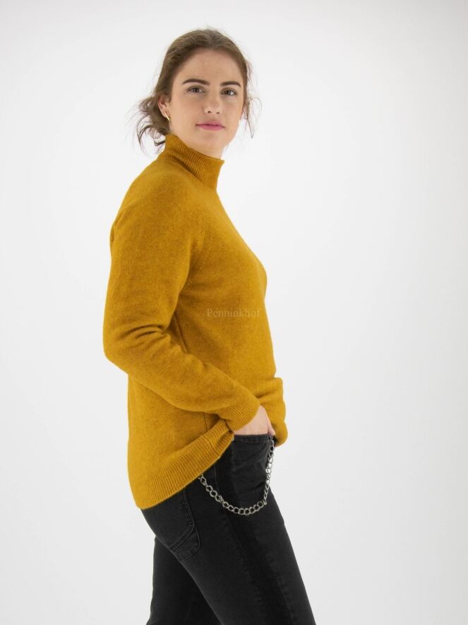 A luxurious light mixed pullover from High in an ocher yellow color. The turtle neck is in a soft ribbed structure that returns at the bottom of the pullover. This pullover can be washed by hand.
