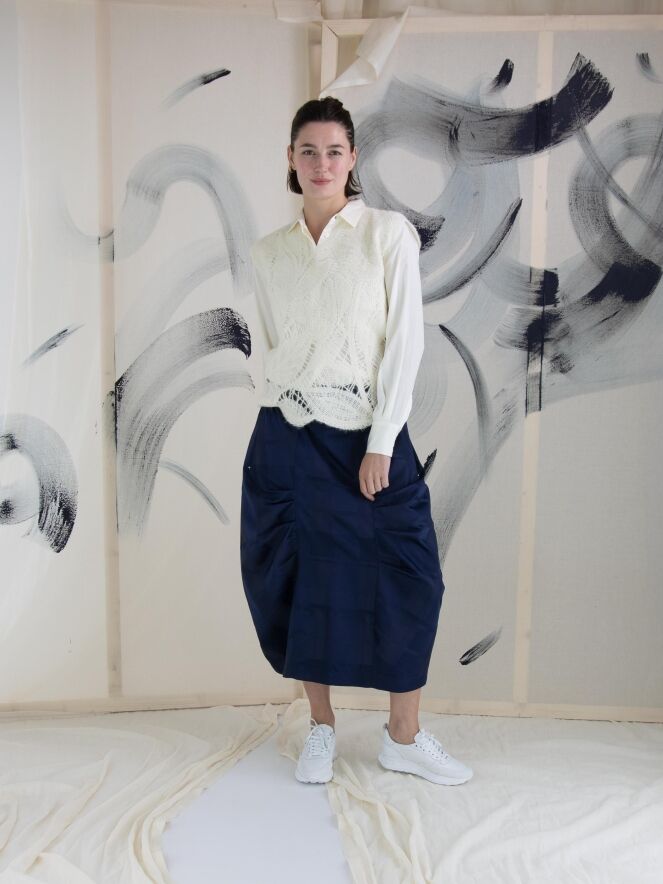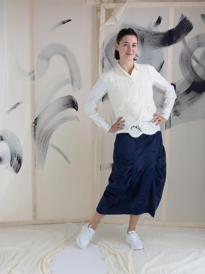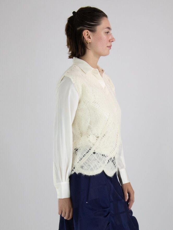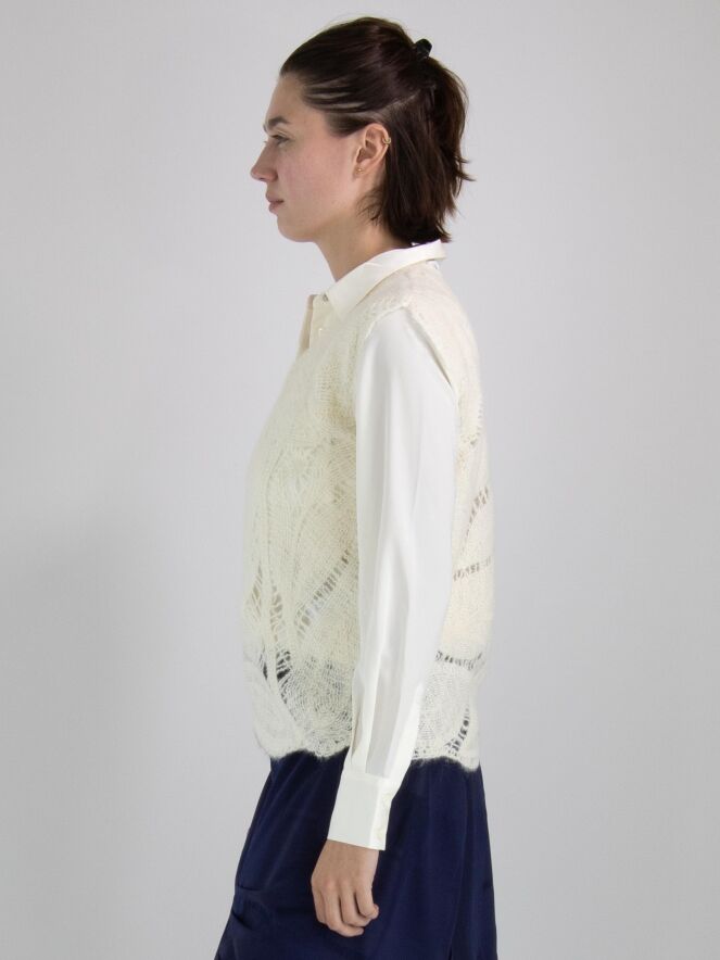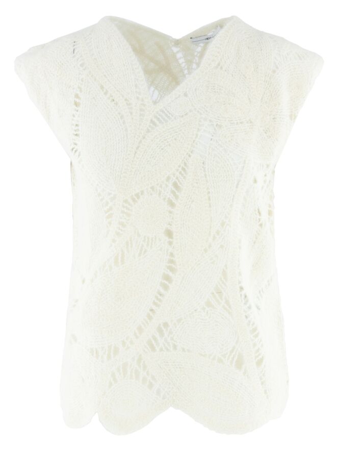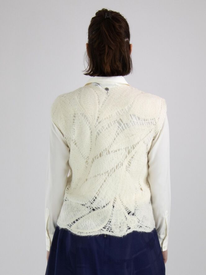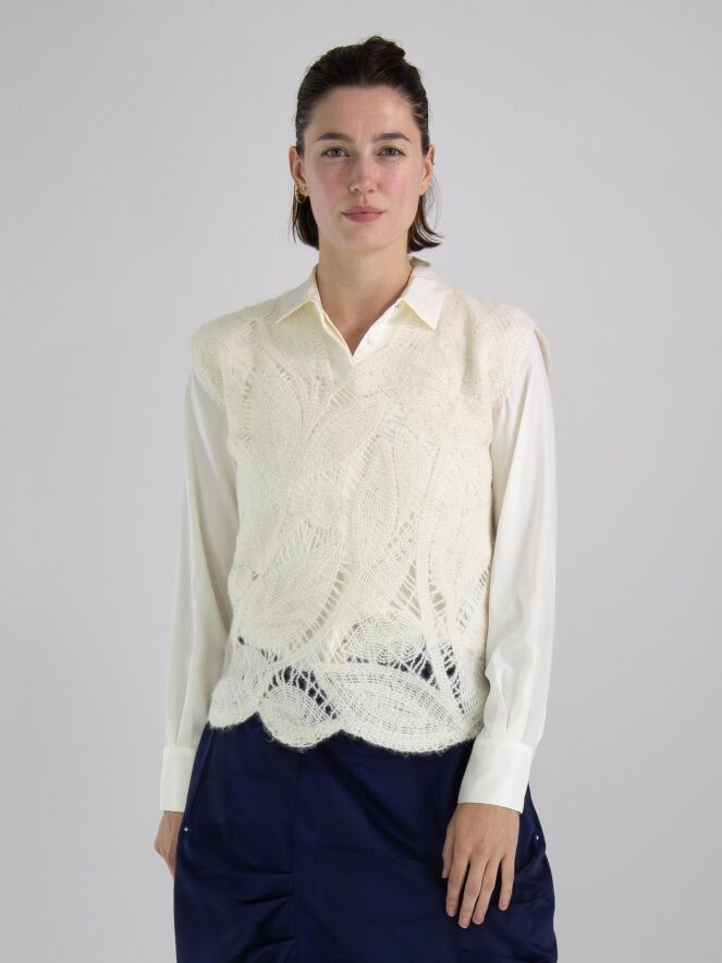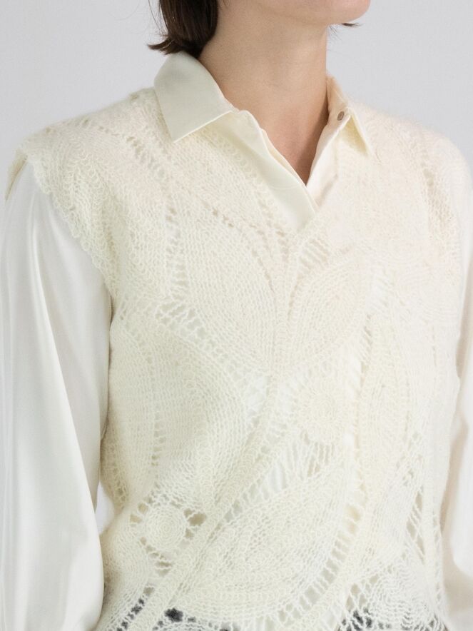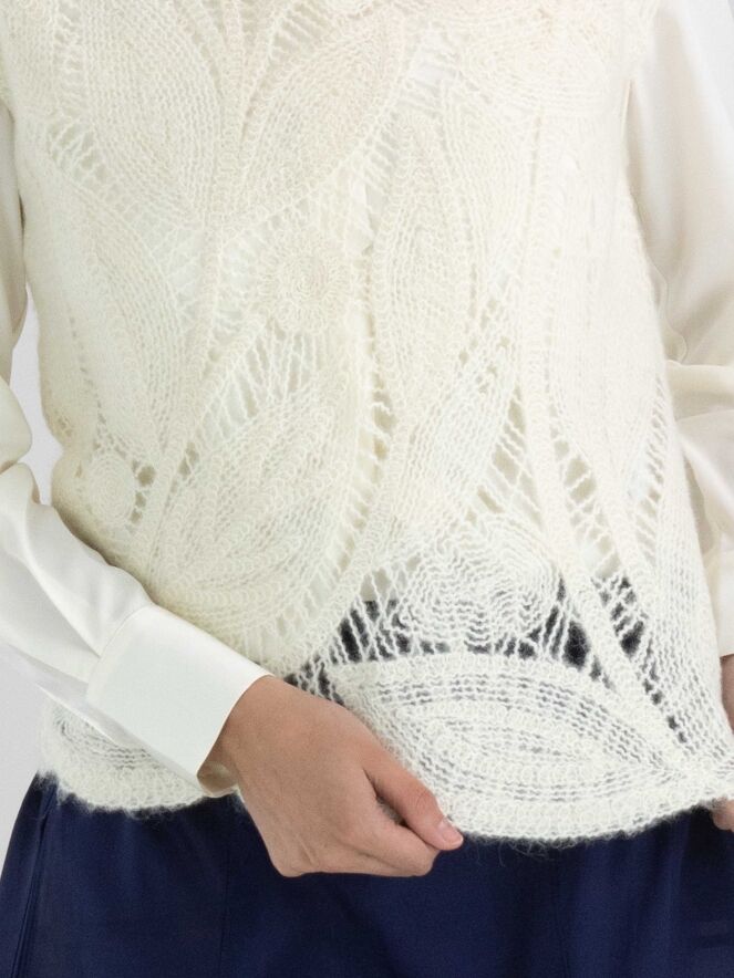 A luxurious open-knit top from High featuring a leaf pattern in cream white. This top can be hand washed.