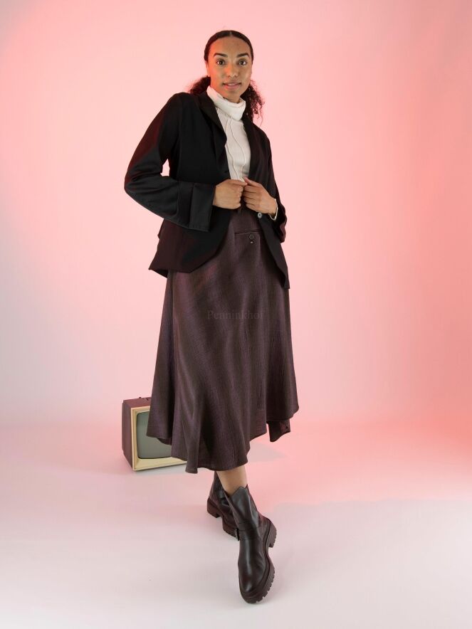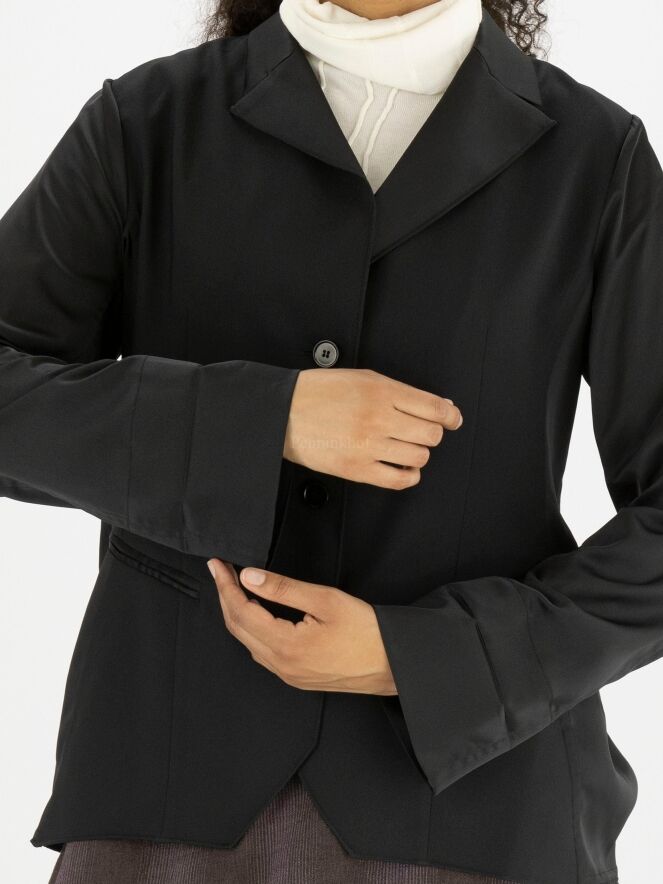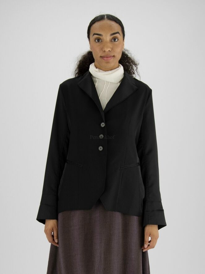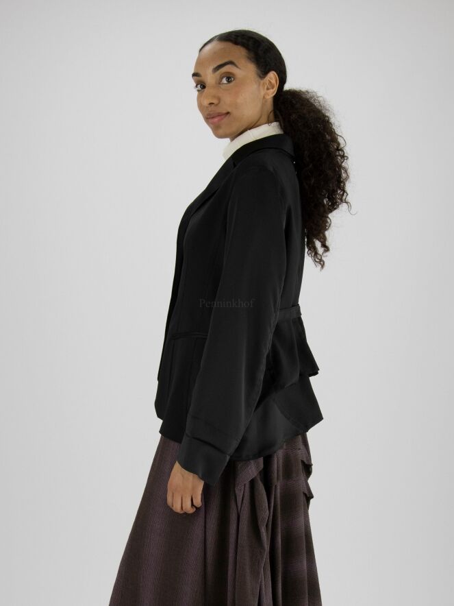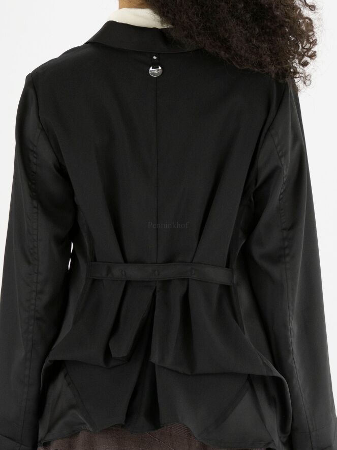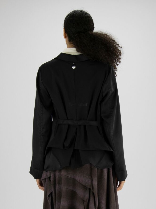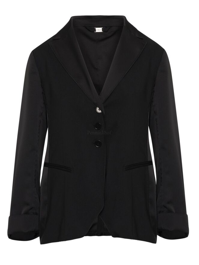 A blazer from High in the color black. The blazer has a 3-button closure and the sleeves are in a matte satin fabric. This blazer can be hand washed.