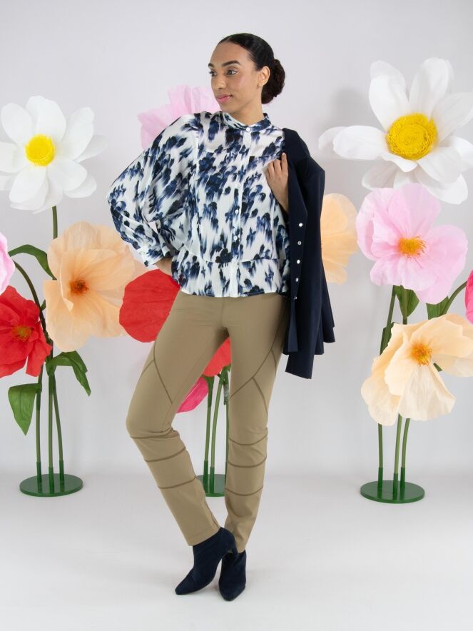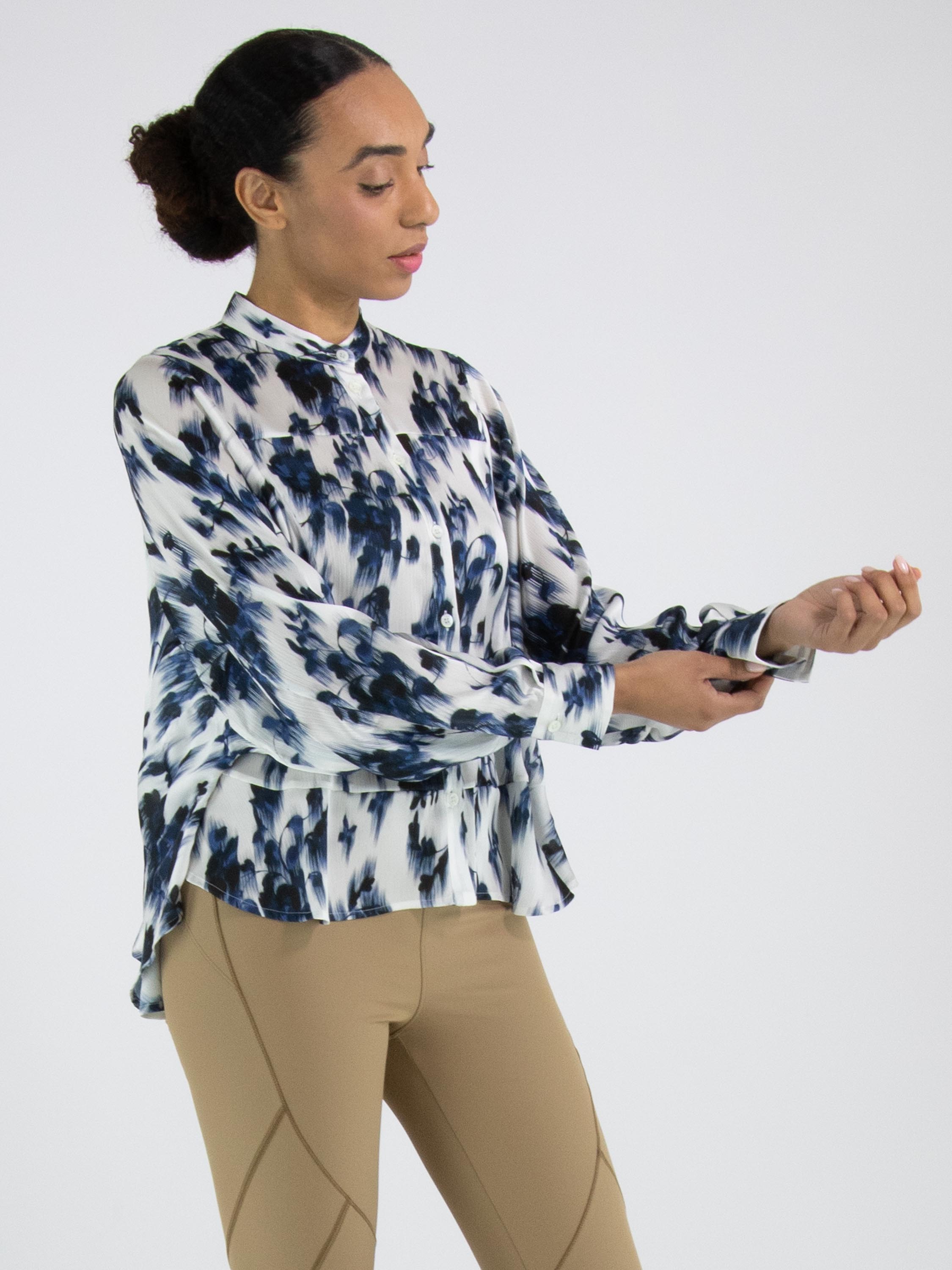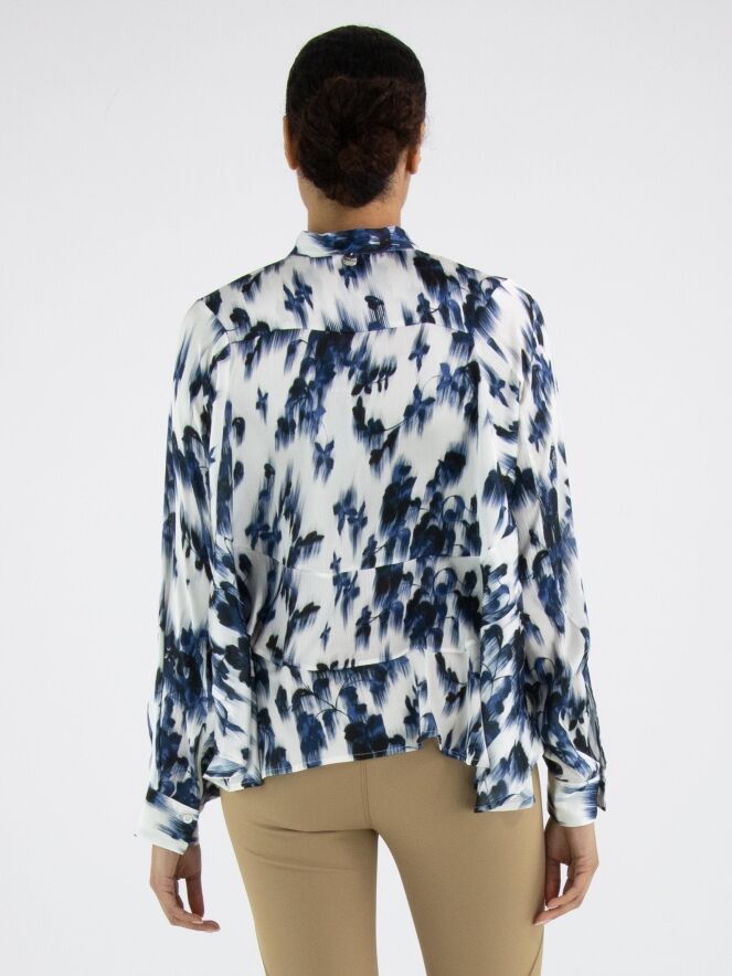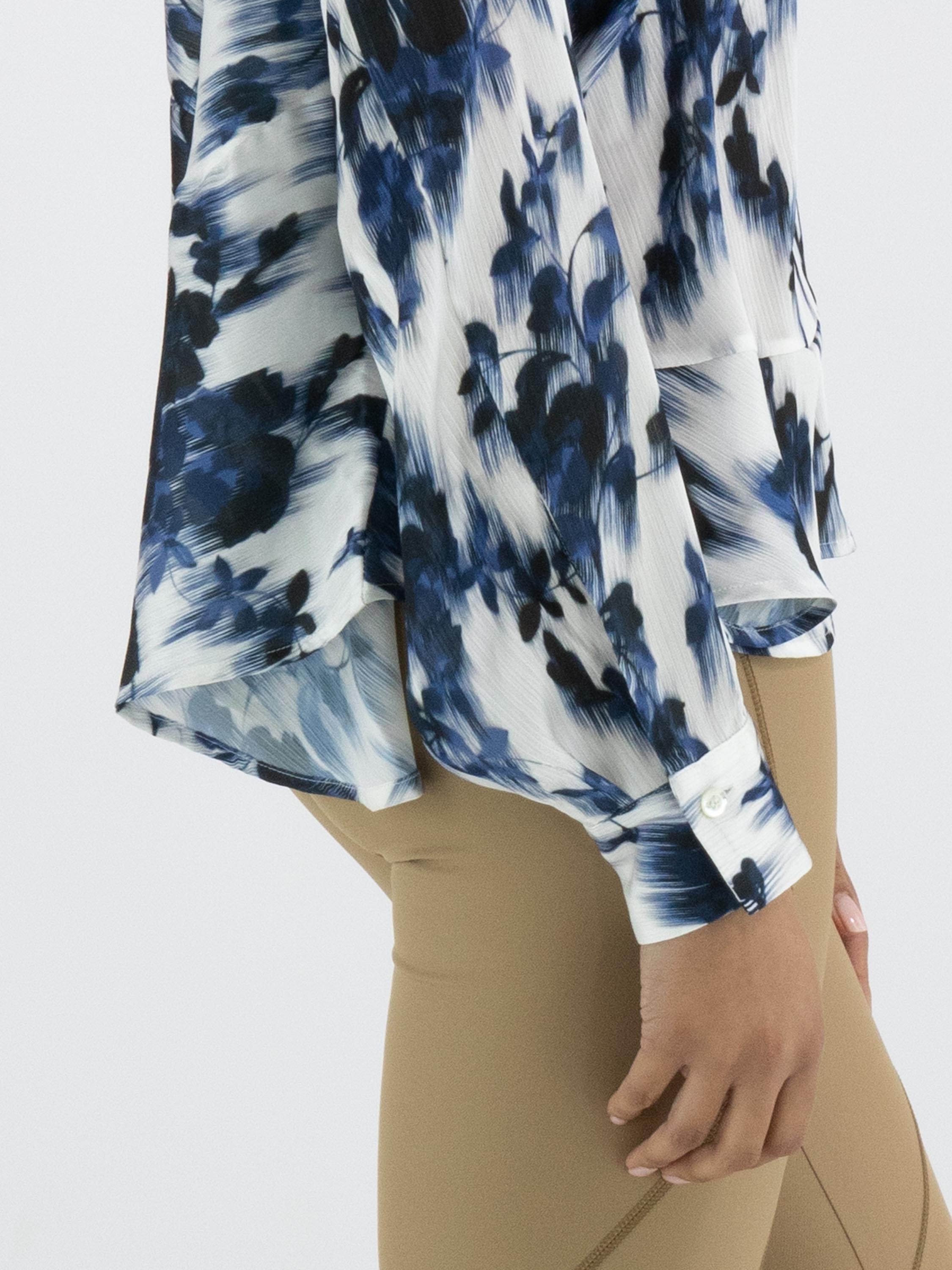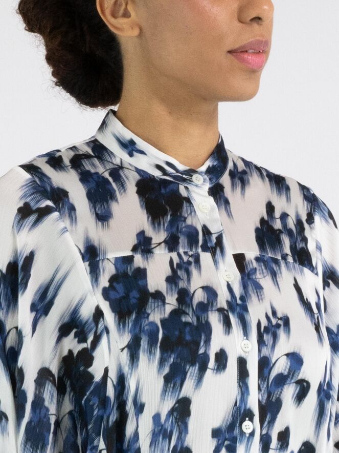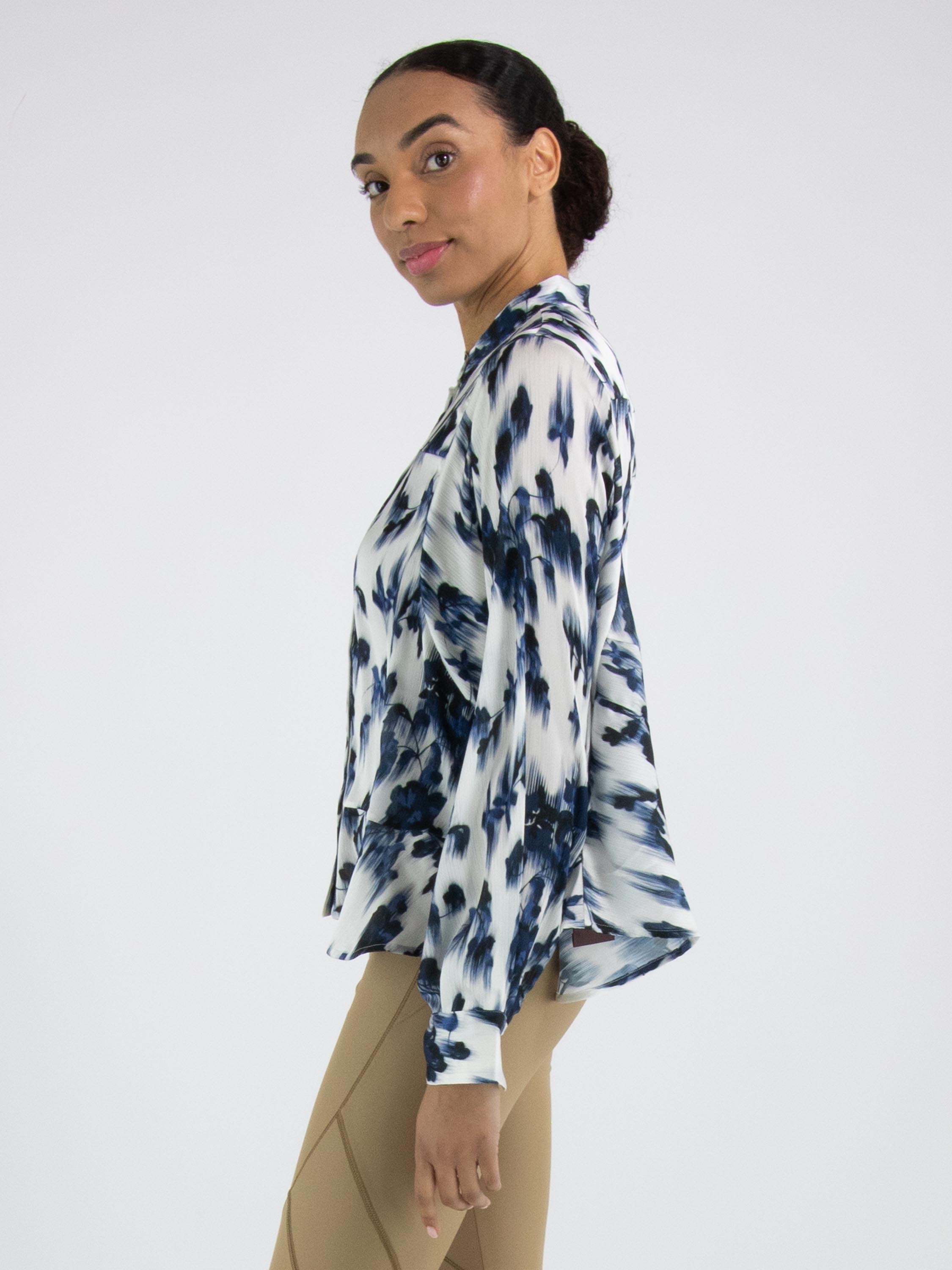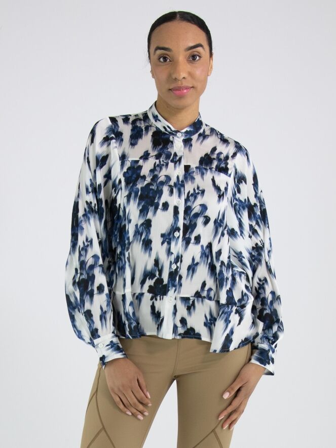 A lightly sheer blouse from High with a brushed floral print in various shades of blue and white. The blouse features batwing sleeves and has a seam above the bust. The hem is finished with a softly wavy edge. This blouse can be hand-washed.