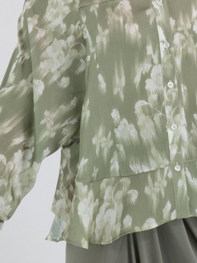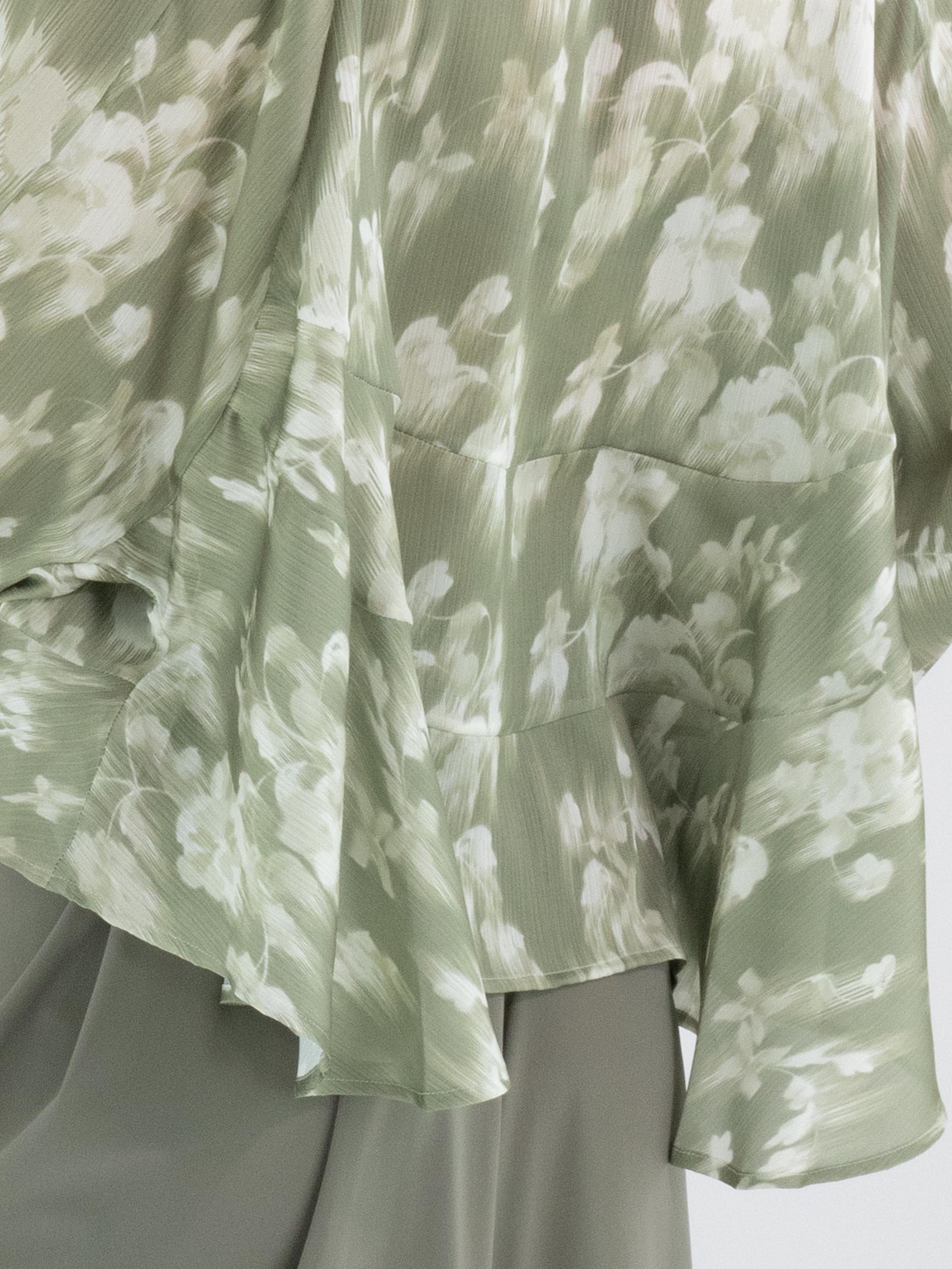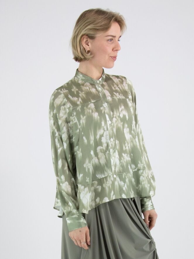 A lightly sheer blouse from High with a brushed floral print in various shades of olive green and white. The blouse features batwing sleeves and a seam positioned above the bust. The hem has a softly wavy finish. This blouse can be hand-washed.