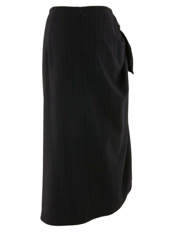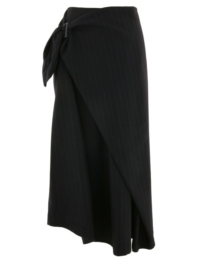 A false wrap skirt by Heide Ost in a pinstripe with the colors black and red. At the waist is a decorative buckle with which the skirt can be adjusted. This skirt can be washed by hand.
