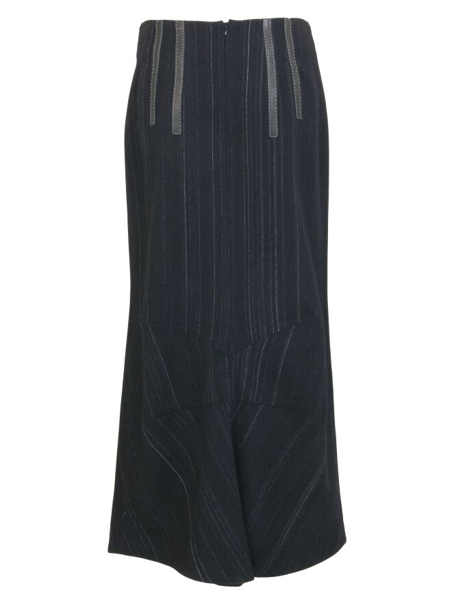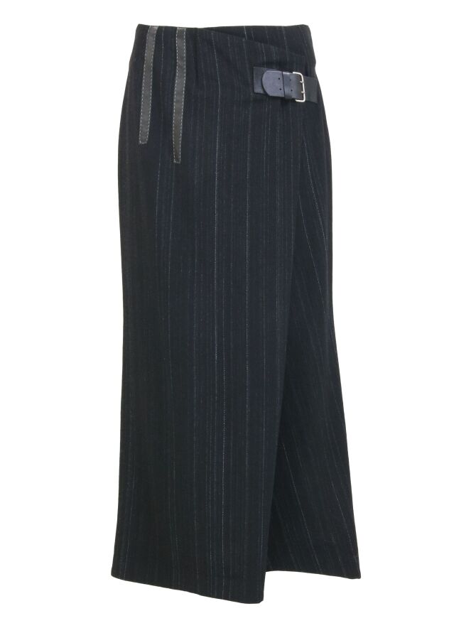 Une jupe longue par ischiko dans une fine rayure aux couleurs noir et blanc. Sur le devant est une fausse enveloppe avec une large boucle. De la taille sont 2 passepoils en simili cuir. Cette jupe ne doit pas être lavée.