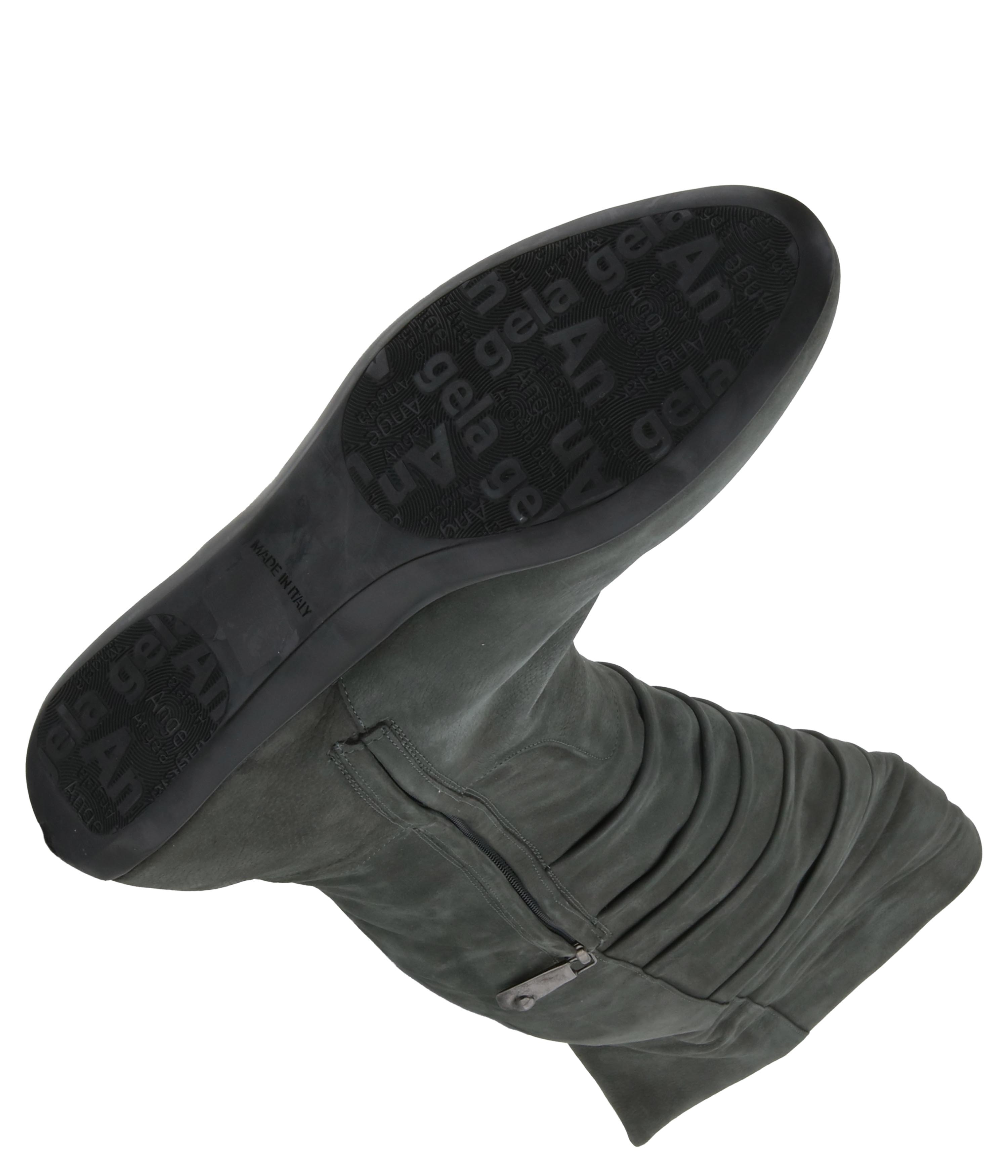 A bucket boot in a gray color from the Ital Trend brand. The boot is pleated at the front of the shaft and a zipper is deployed on the inside of the boot from the foot to mid-knee. 10 cm below the top of the shaft is a nickel buckle. The height of the shaft is 55 cm and the shaft width is 42 cm.