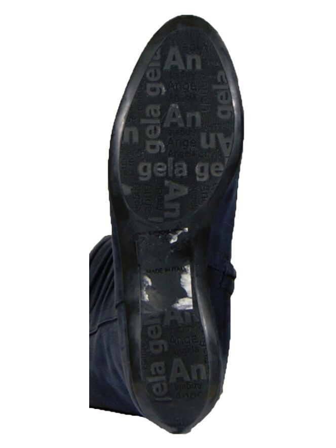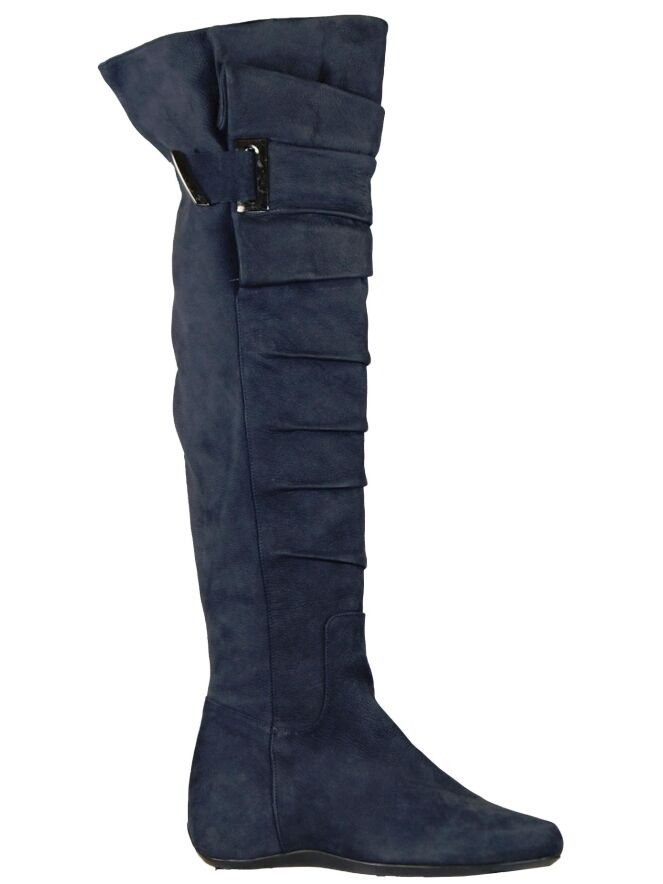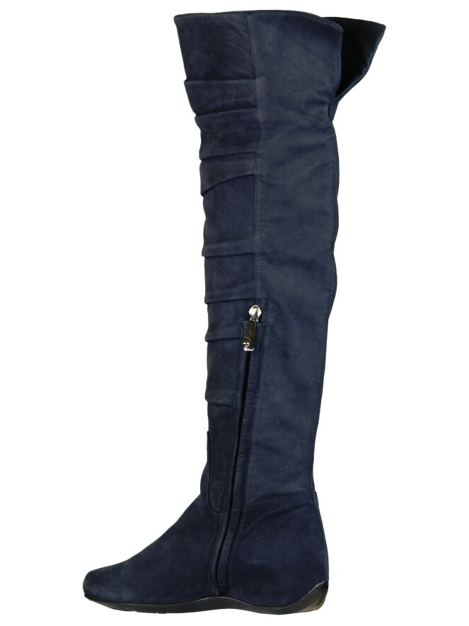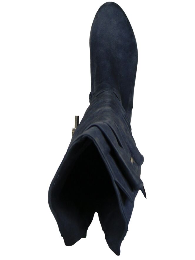 A tube boot in navy bleu color by the brand Ital Trend. The boot is pleated at the front of the shaft and on the inner side of the boot from the foot is used to a zipper halfway through the knee. 10 cm below the top of the shaft is a nickel buckle. The height of the shaft is 55 cm and the shaft width is 42 cm.