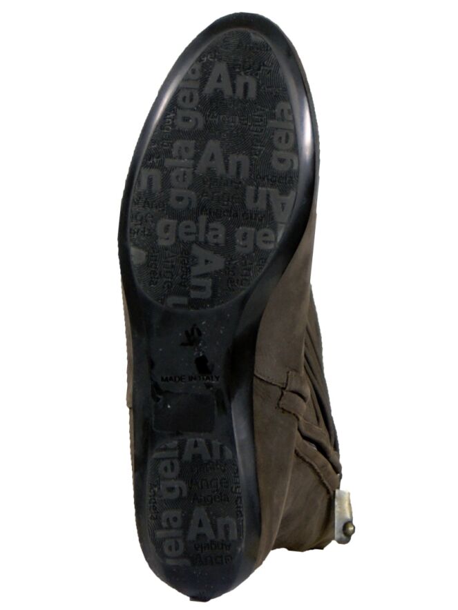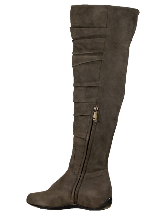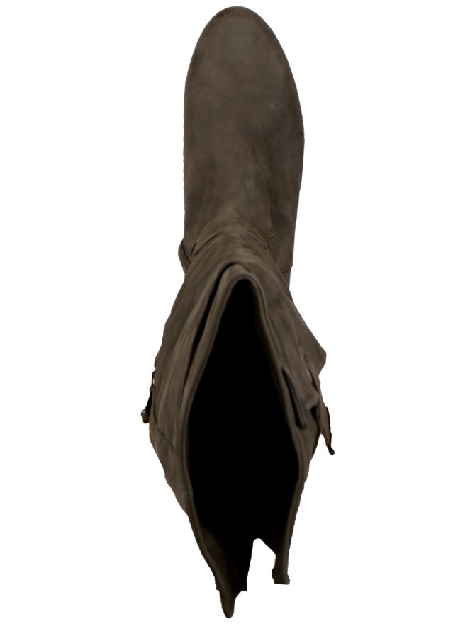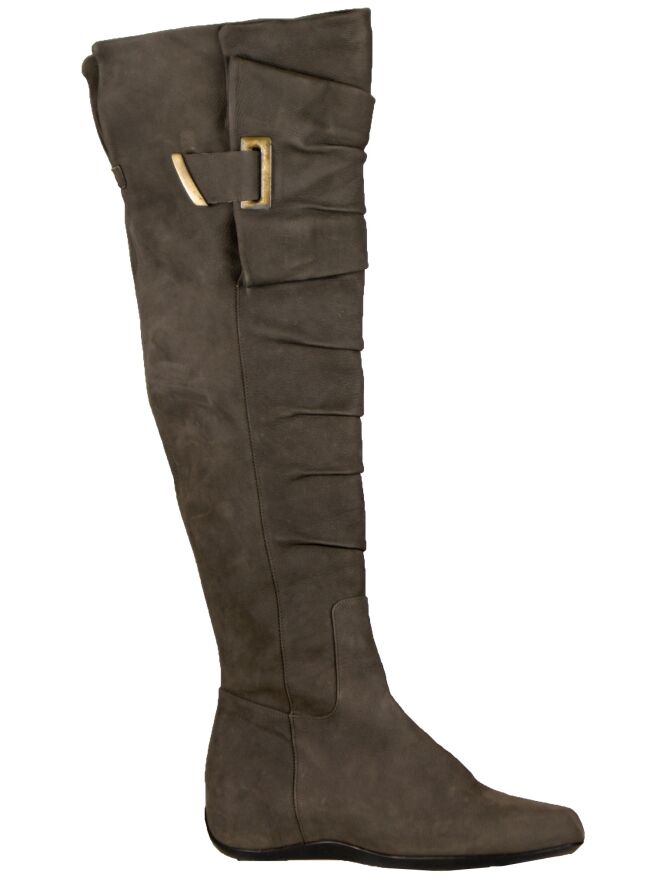 A tube boot in taupe color by the brand Ital Trend. The boot is pleated at the front of the shaft and on the inner side of the boot from the foot is used to a zipper halfway through the knee. 10 cm below the top of the shaft is a nickel buckle. The height of the shaft is 55 cm and the shaft width is 42 cm.