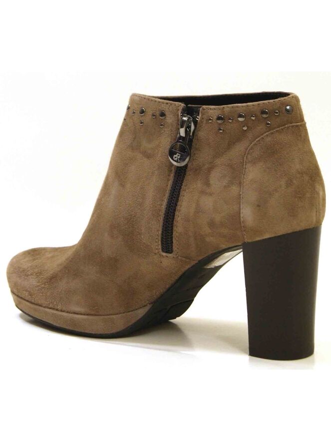 An ankle boot by John Gray in the color taupe. There are decorative studs around the edge of the shaft. The heel is in the color mocha brown. the inside is lined with leather.