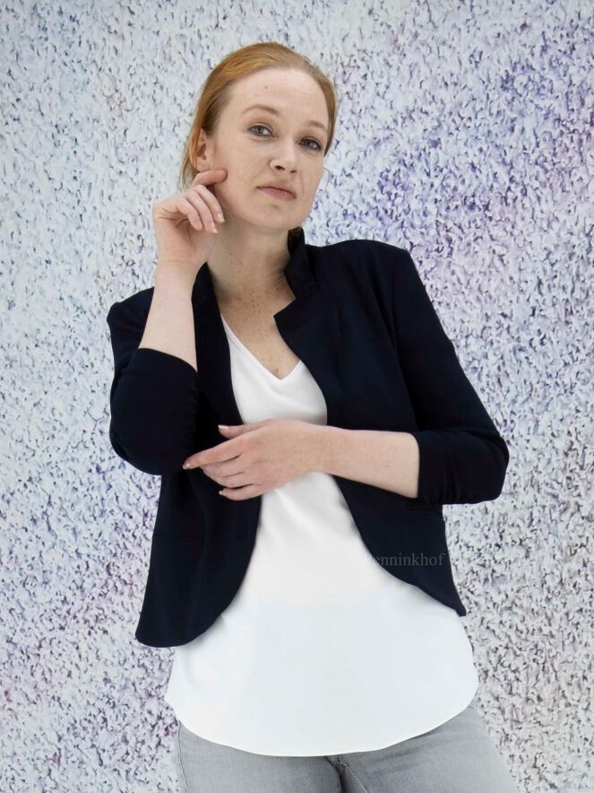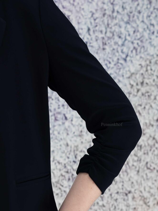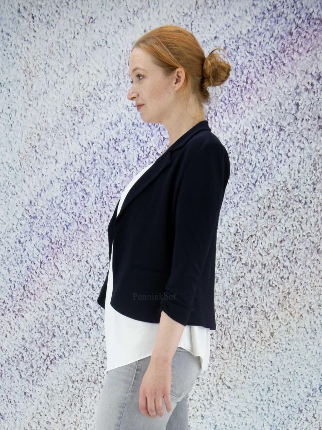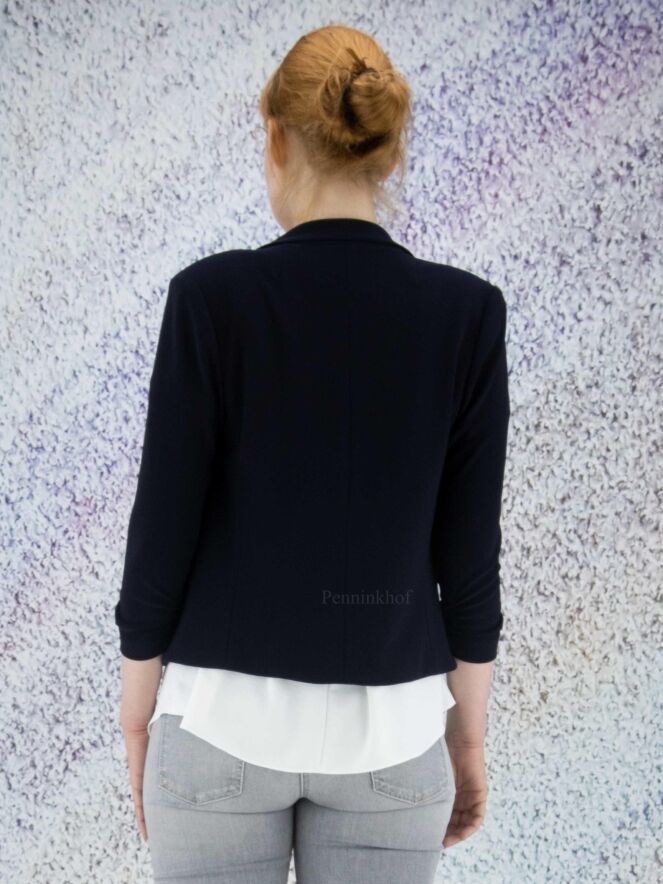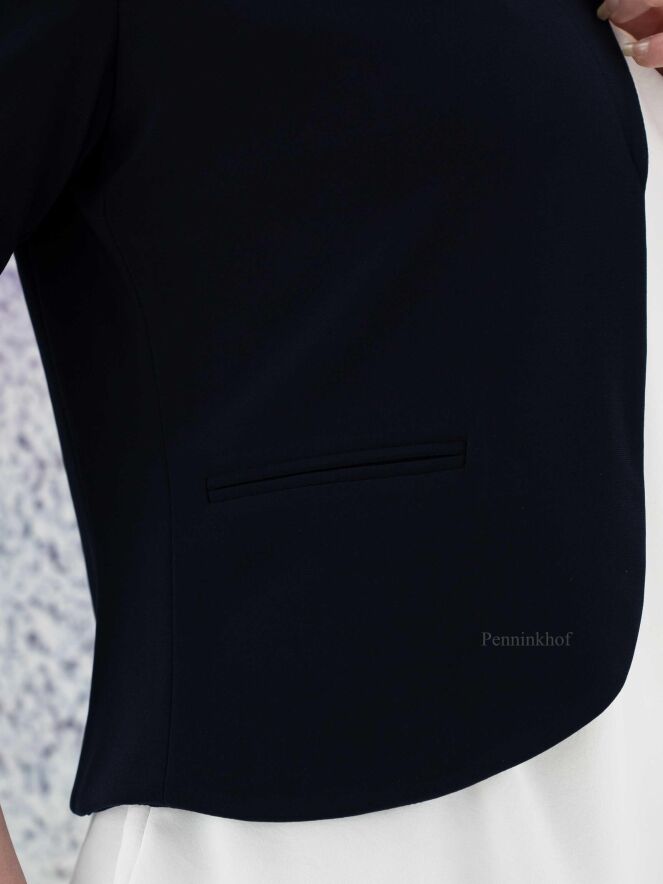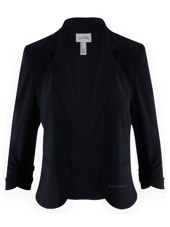 A short blazer from Joseph Ribkoff in a navy blue color. The blazer has a half-long sleeve with fine pleats on the stitching seam at the end. The blazer has no closure and can be washed by hand.