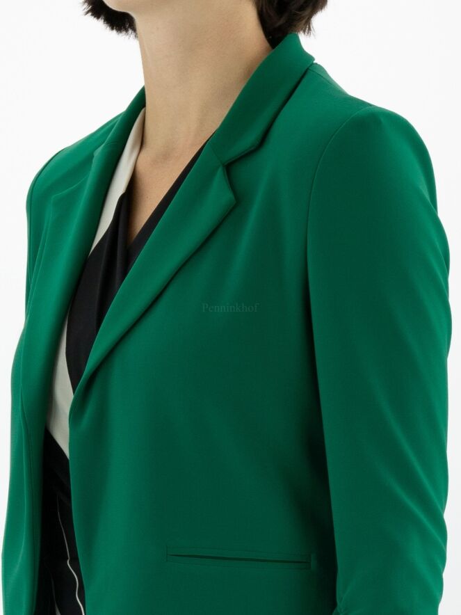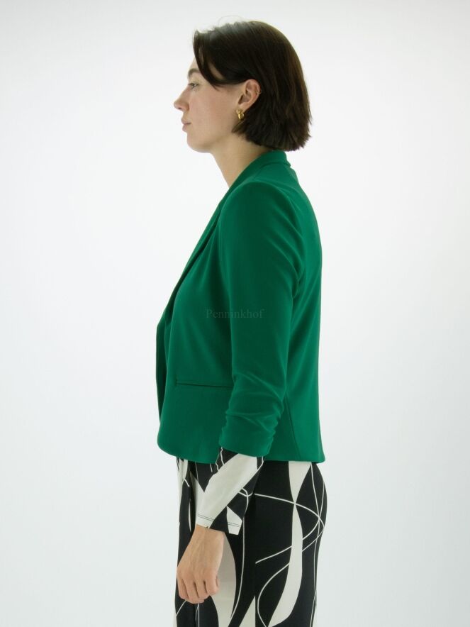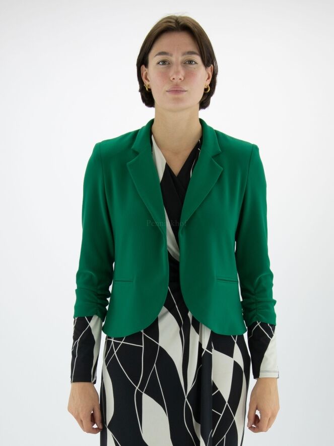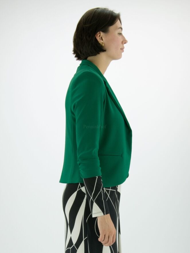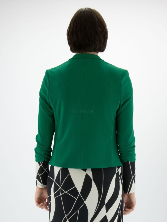 A short blazer from Joseph Ribkoff in black. The blazer has a mid-length sleeve with fine pleats at the end on the stitching seam. The blazer has no fastening and may be hand washed.
