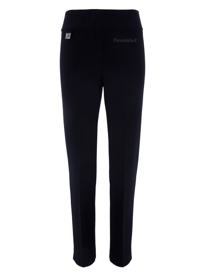 Pants by Joseph Ribkoff in the color navy blue. | at the waist is a wide elastic band. There is a pleat in the middle of the legs. At the bottom of the legs are 2 small splits. these pants can be hand washed.