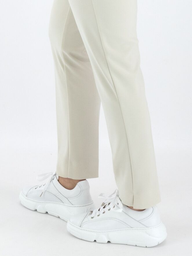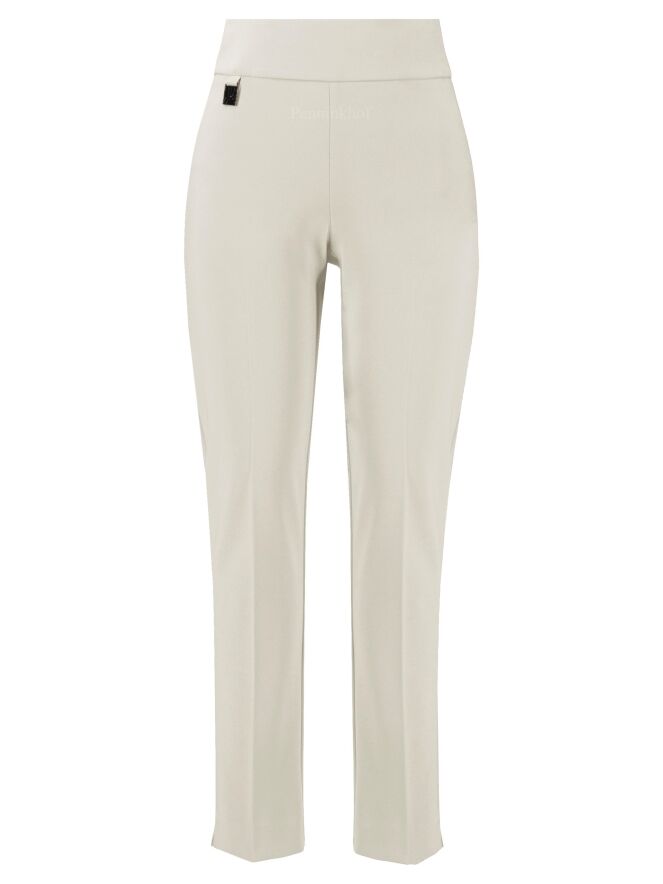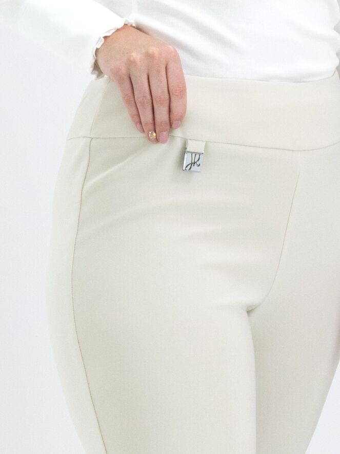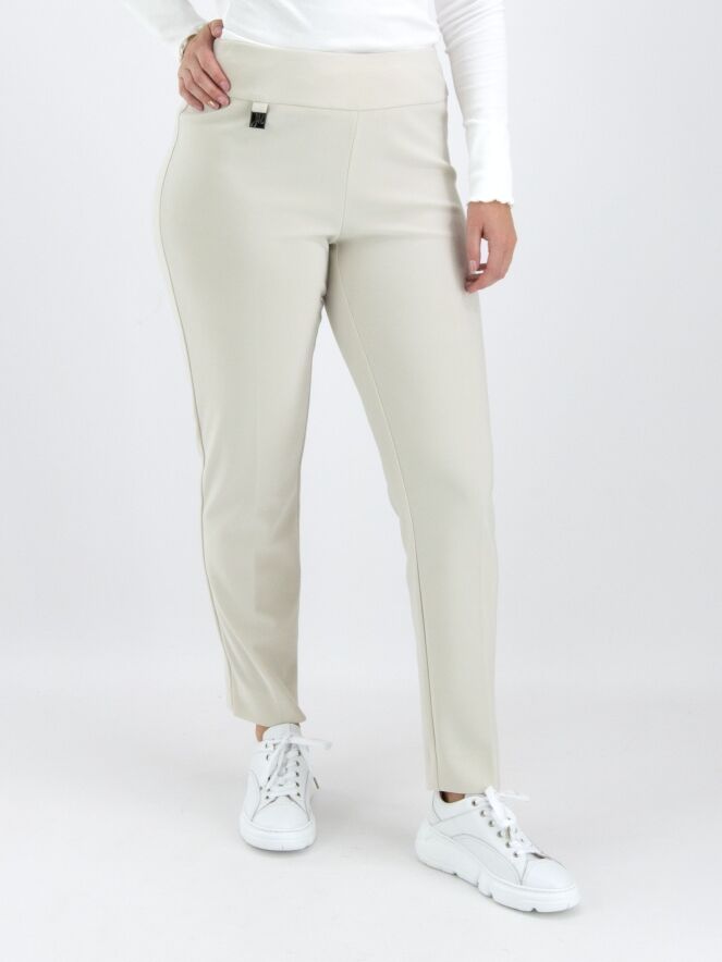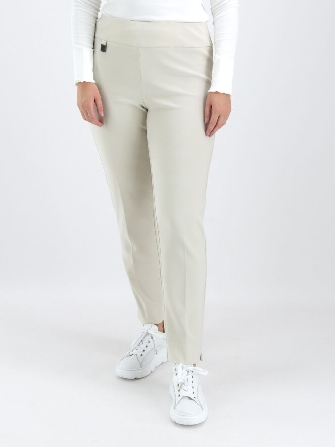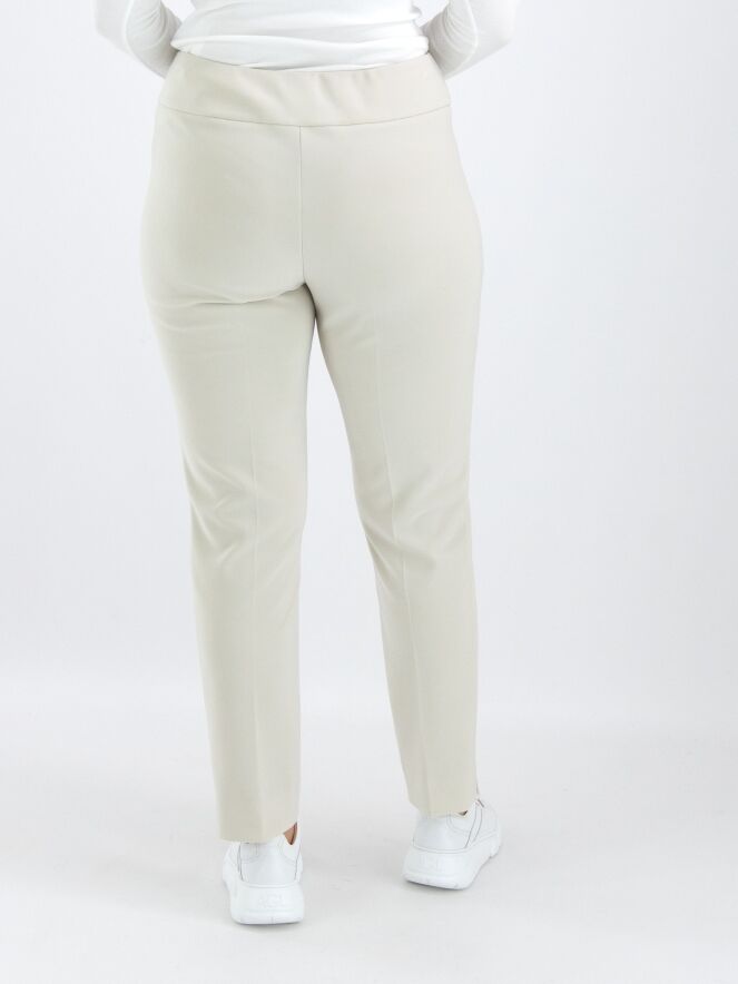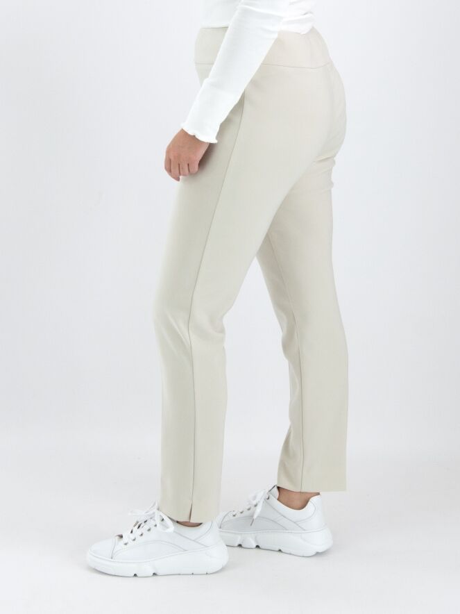 A luxurious basic pair of trousers by Joseph Ribkoff in beige. The waist features a wide elastic band. There is a sharply pressed crease down the center of the legs. At the bottom, there is a small slit on the outer side of the legs. These trousers can be hand washed.