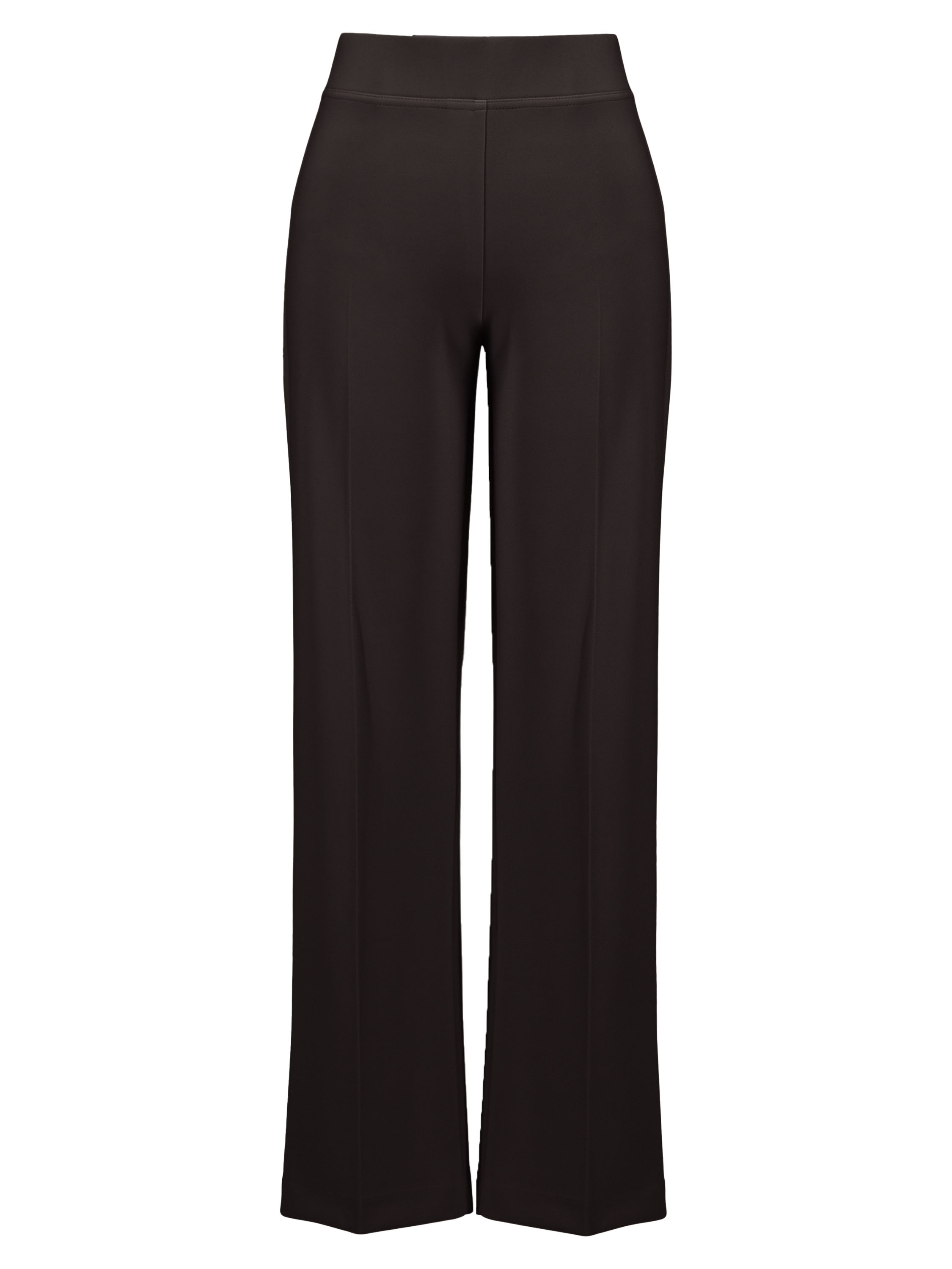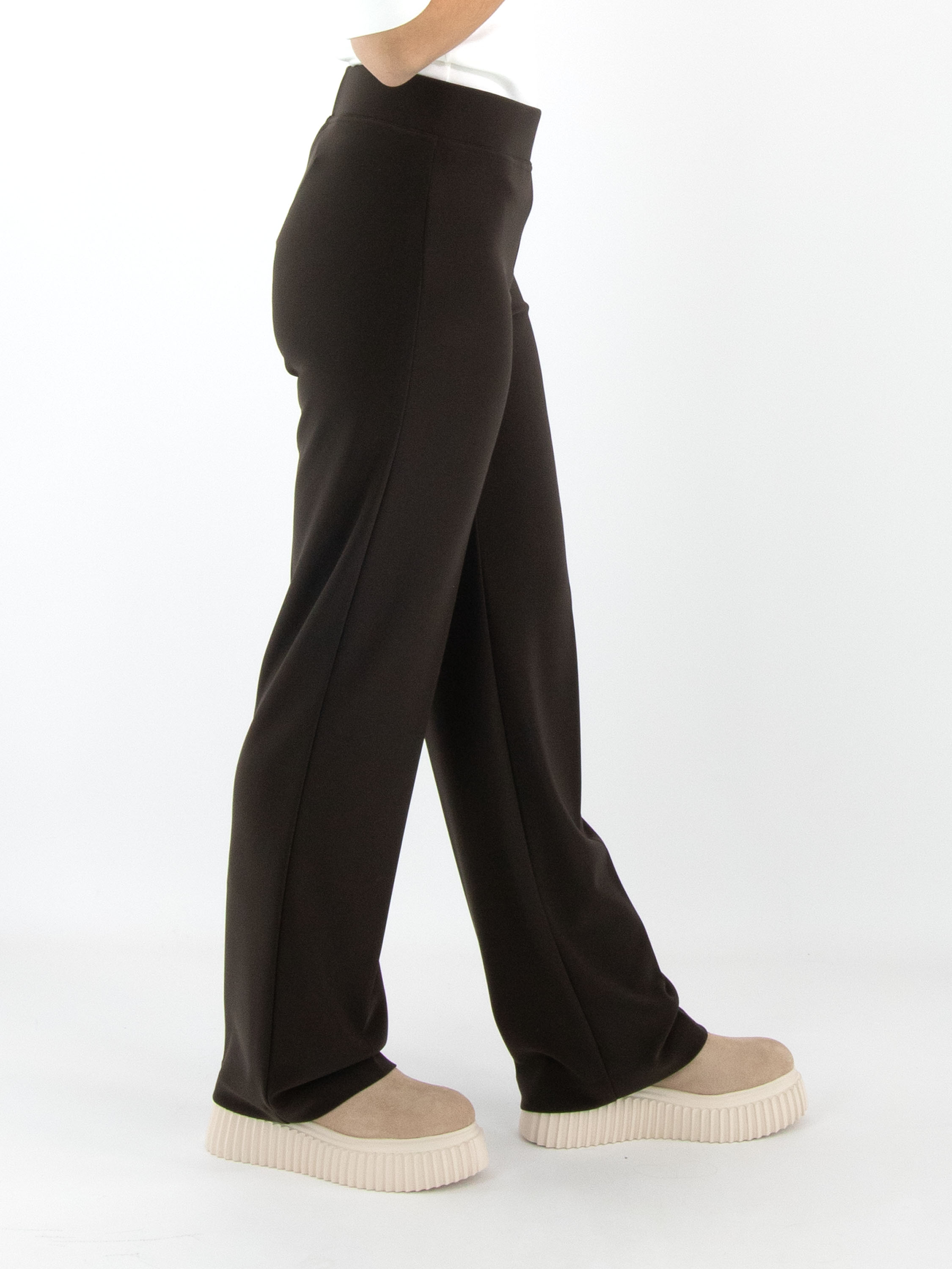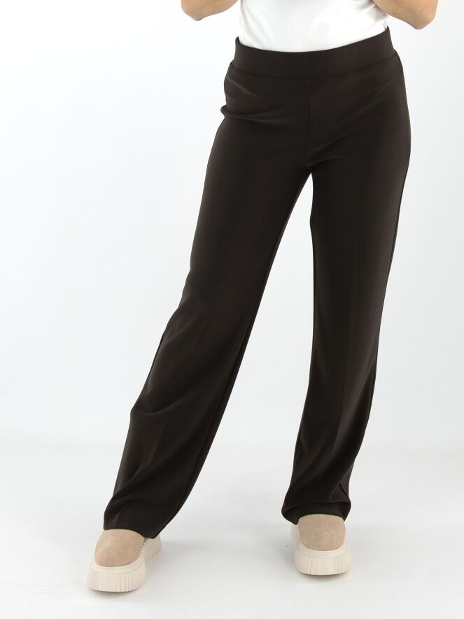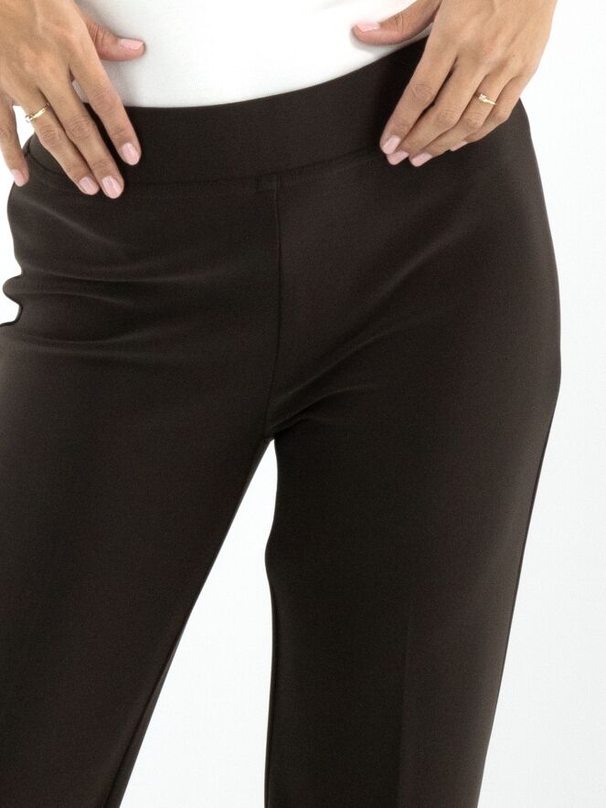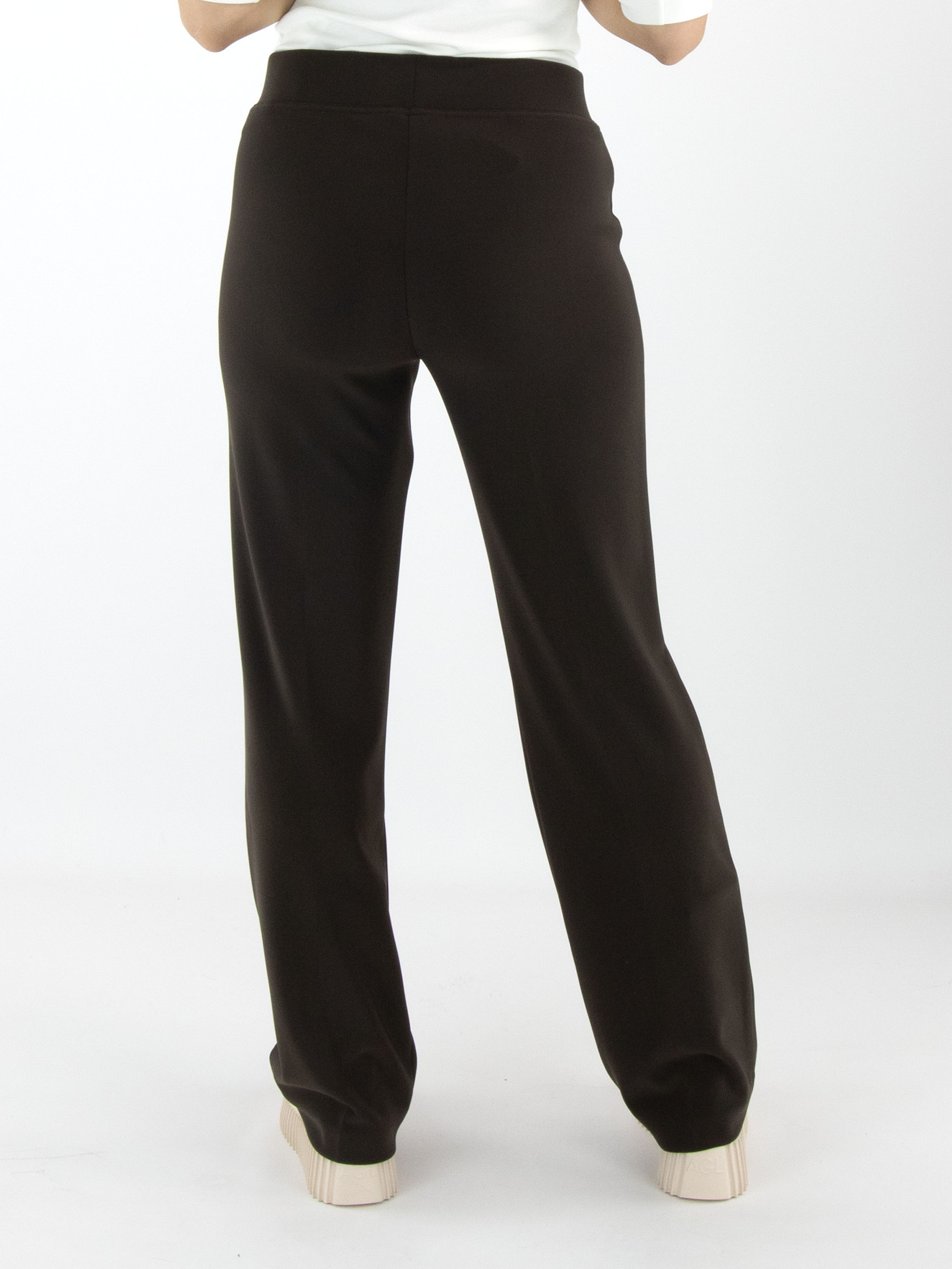 A straight-cut trouser by Joseph Ribkoff in mocha brown. The waistband features a wide elastic band. A pressed crease runs down the centre of each leg. These trousers can be hand-washed.