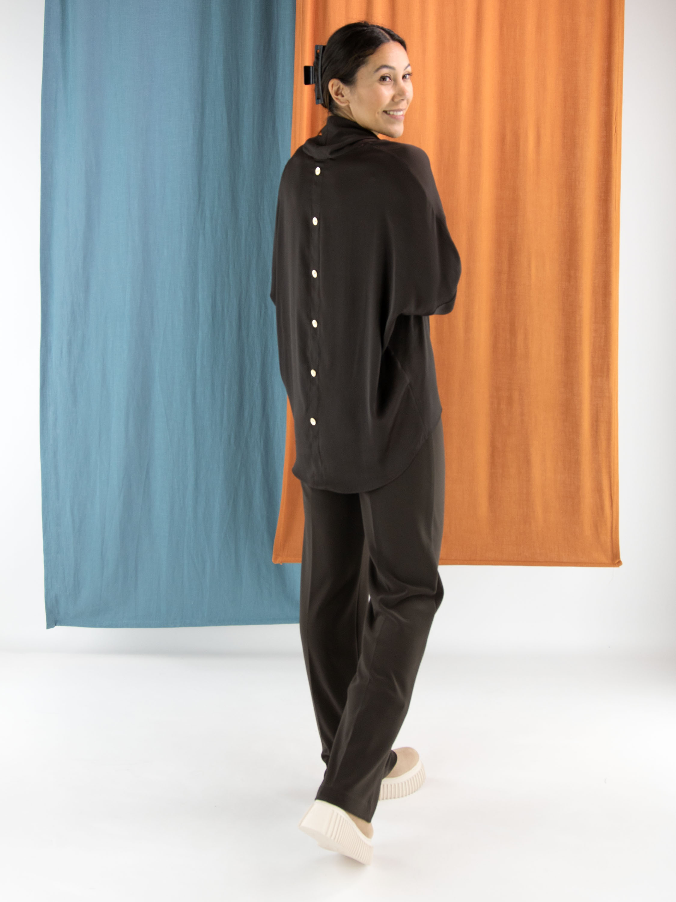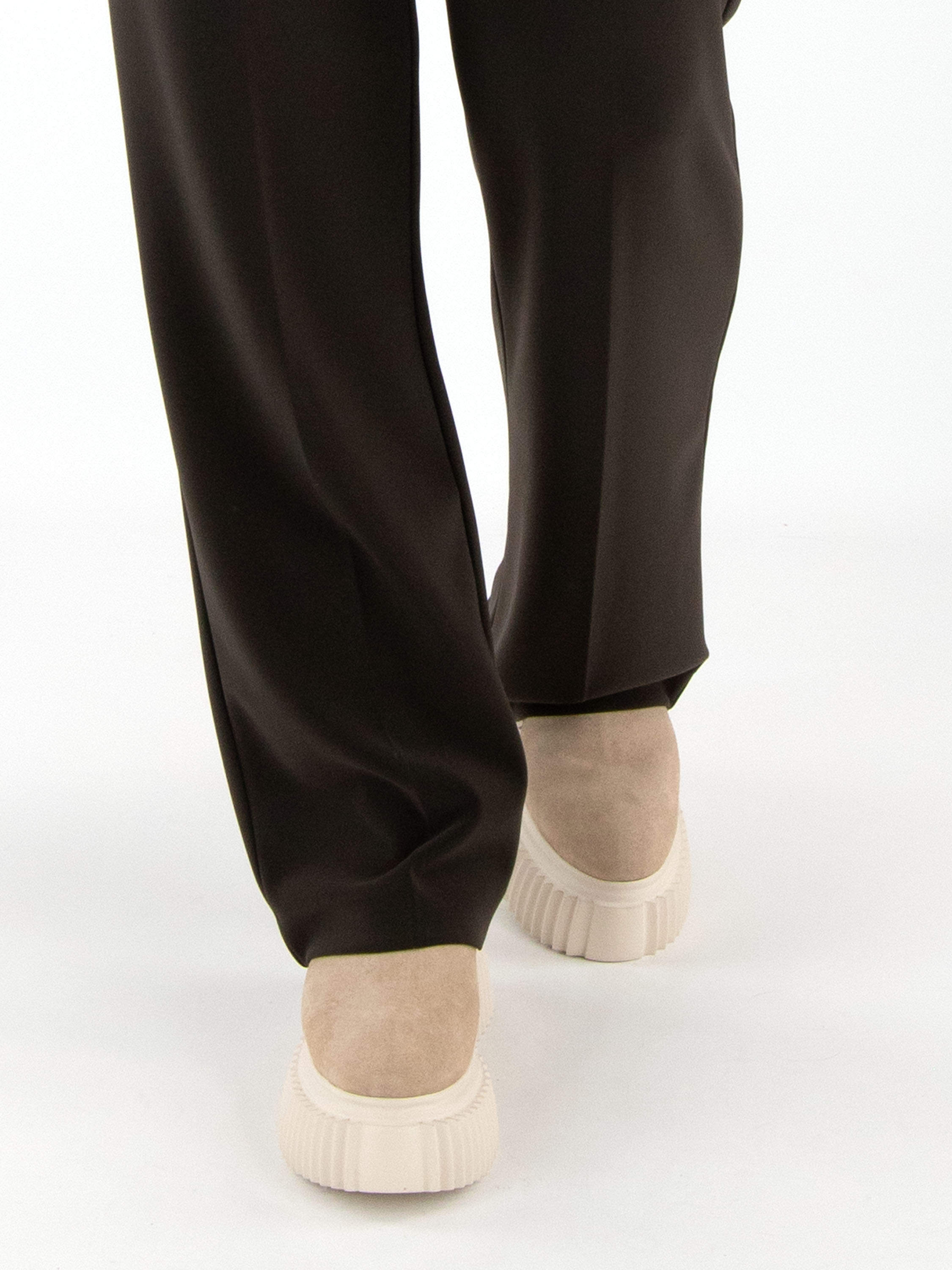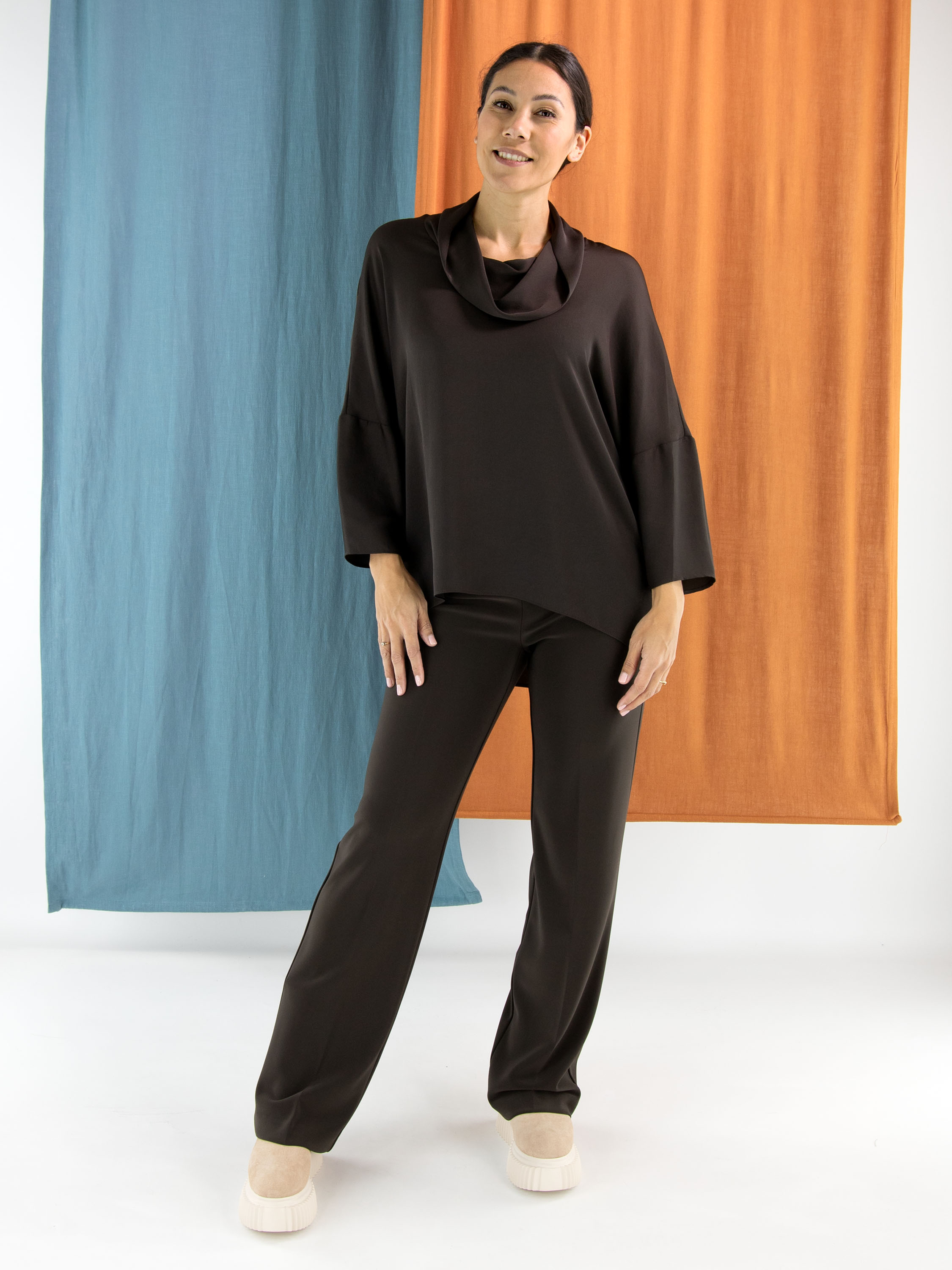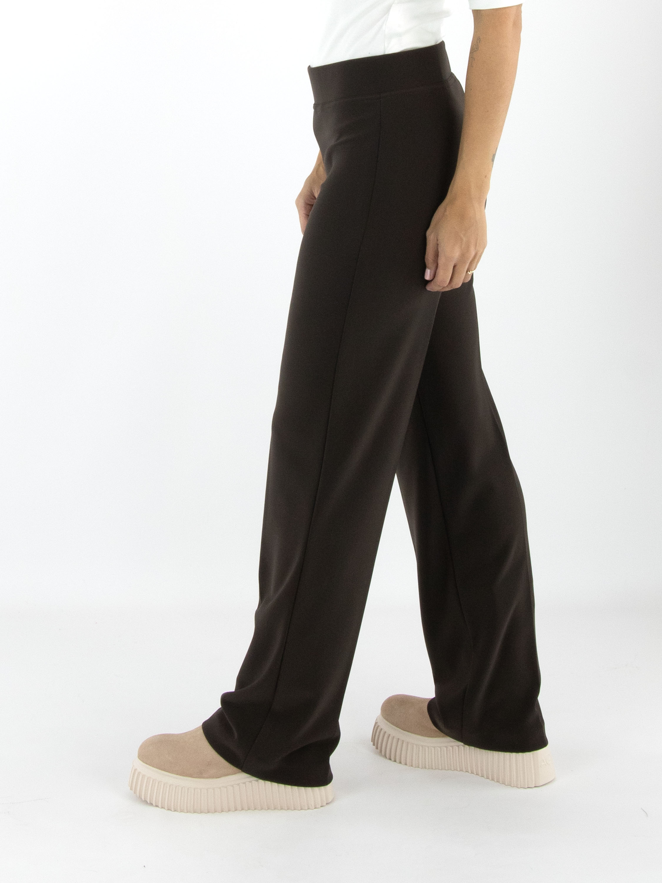 A straight-cut trouser by Joseph Ribkoff in mocha brown. The waistband features a wide elastic band. A pressed crease runs down the centre of each leg. These trousers can be hand-washed.