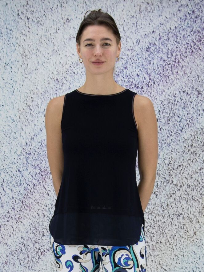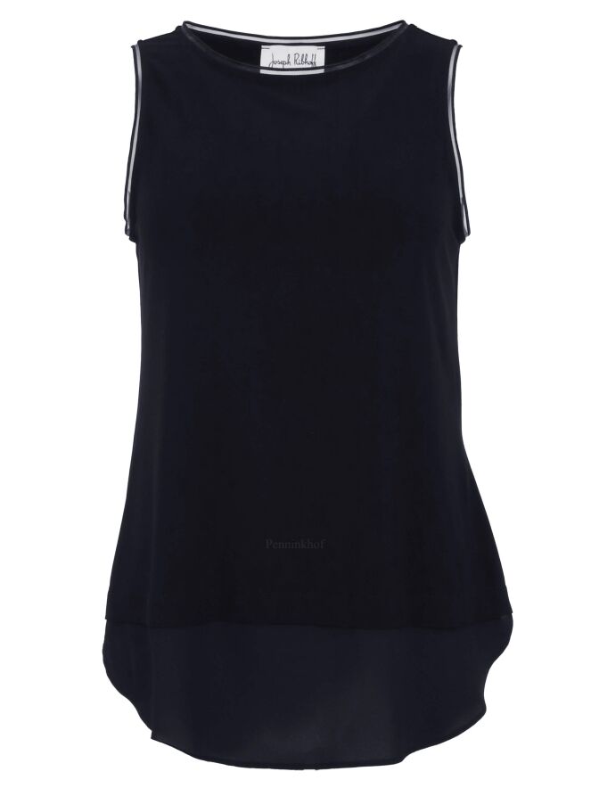 A top by Joseph Ribkoff in the color navy blue. There is a transparent trim along the edge of the sleeve inset. At the bottom of the top is a wide transparent band. This top can be washed by hand.