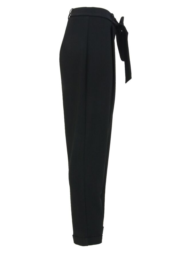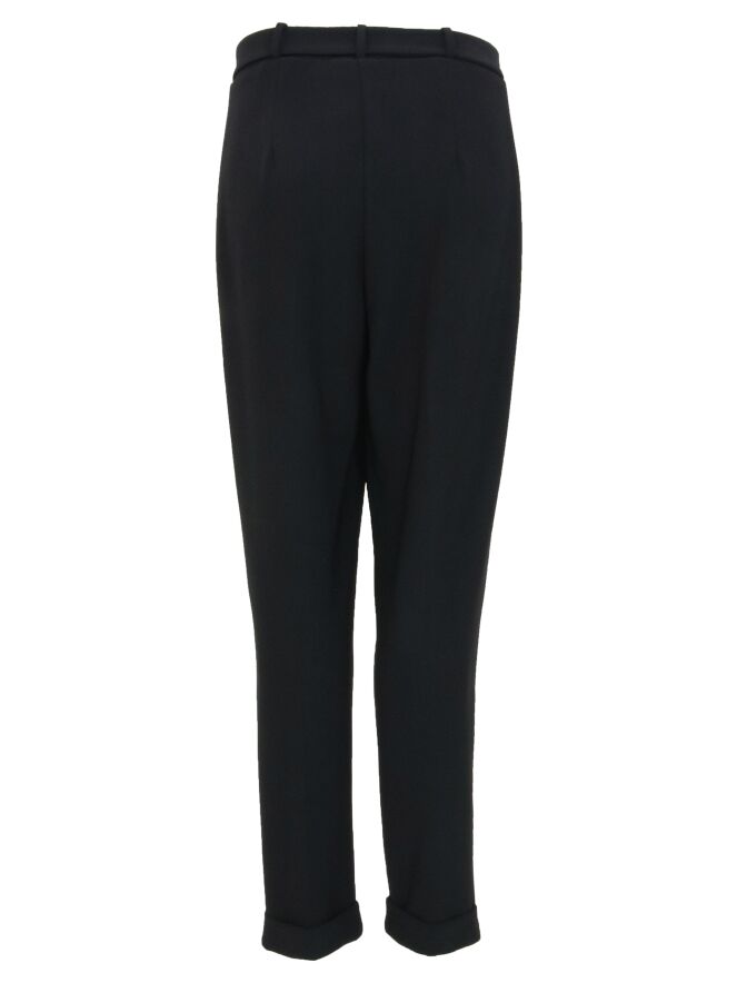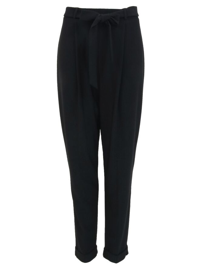 A pair of pants by Joseph Ribkoff in the color black. The pants have a belt in the same fabric as the pants. At the bottom of the pipes is a short cover. These pants can be washed by hand.