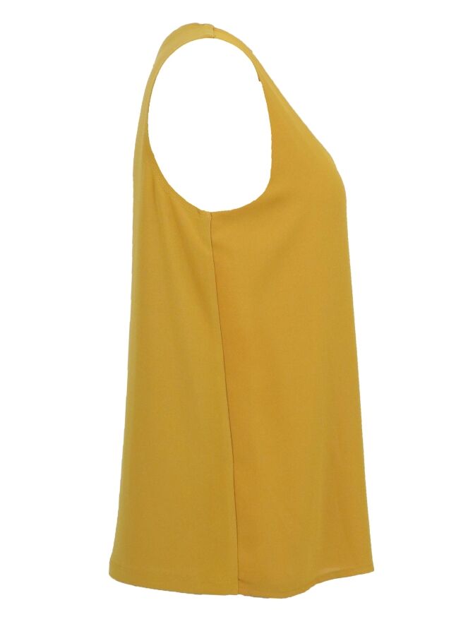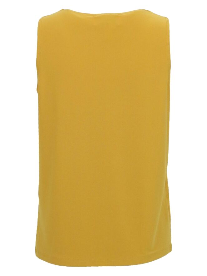A top by Joseph Ribkoff in the color ocher yellow. The top has a deep round neck and the front has a double fabric. This top can be washed by hand.