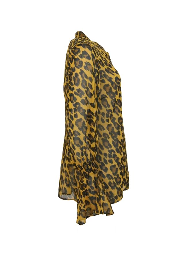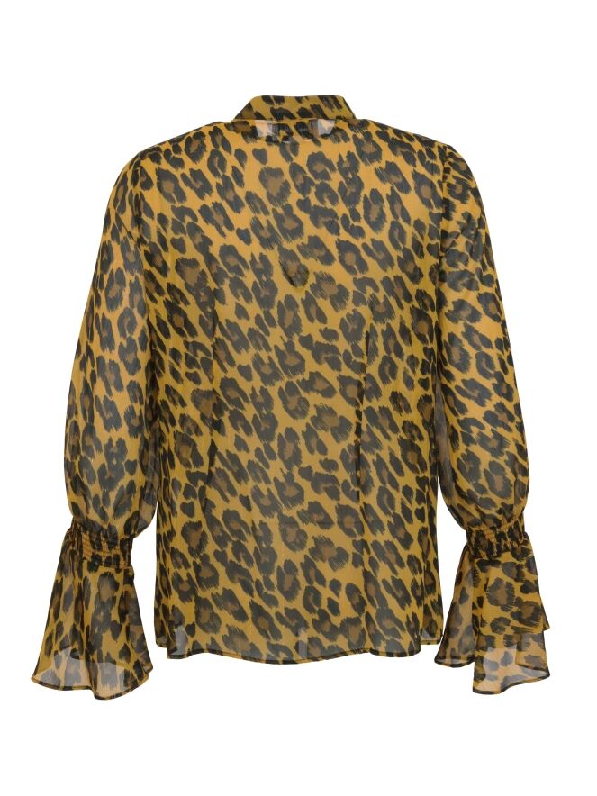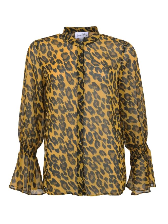 A blouse from Joseph Ribkoff in a leopard print with the colors ocher yellow and black. A copper-colored metal wire is woven through the fabric. At the bottom of the sleeves is a wide smocked and elastic ribbon. This blouse can be washed by hand.