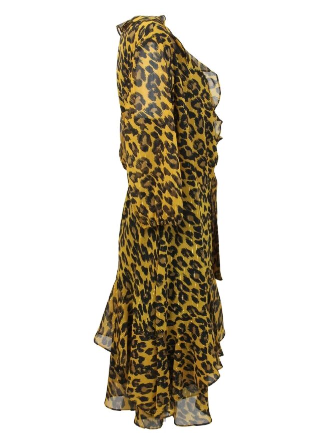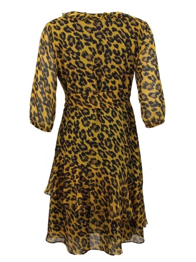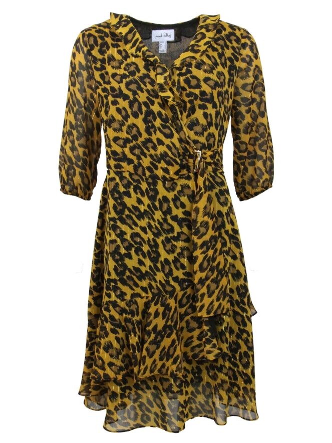A wrap dress by Joseph Ribkoff in a leopard print with the colors ocher yellow and black. Along the V - Hals is a folange. The edge of the short sleeves has an elastic trim. The belt that goes from the wrap to the left side has a rectangular gold colored buckle. The dress is lined and can be washed by hand.