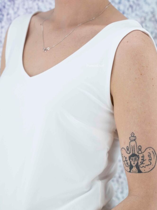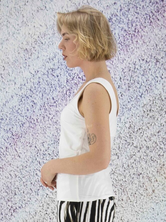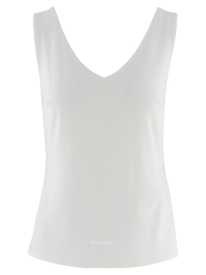 A basic top by Joseph Ribkoff in the color white. The top has a V-Neck at the front and back. The shoulder straps are 5 cm wide. This top can be hand washed.