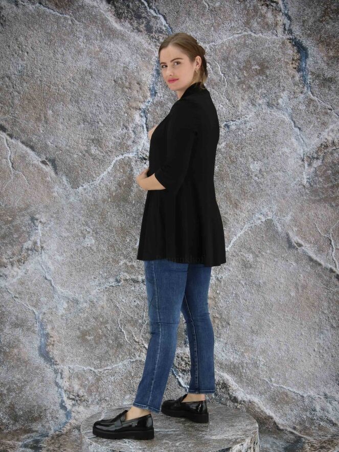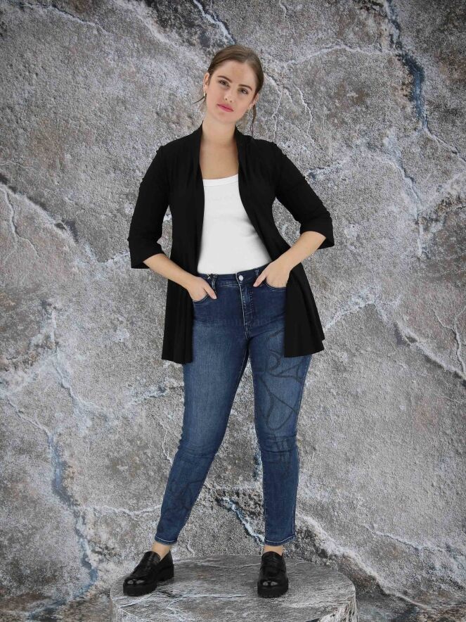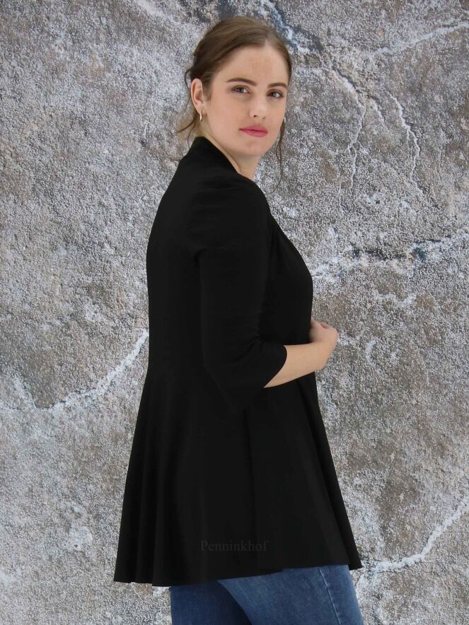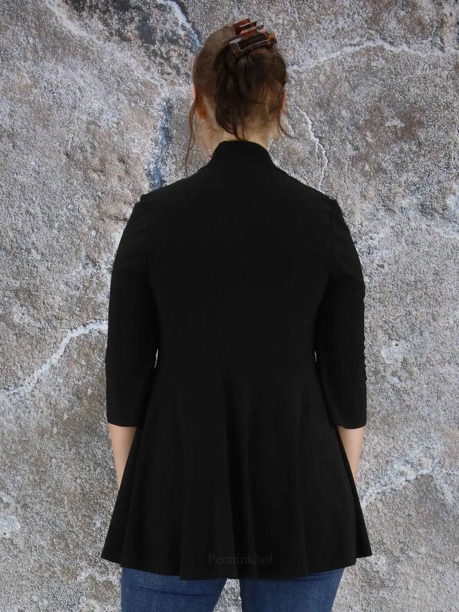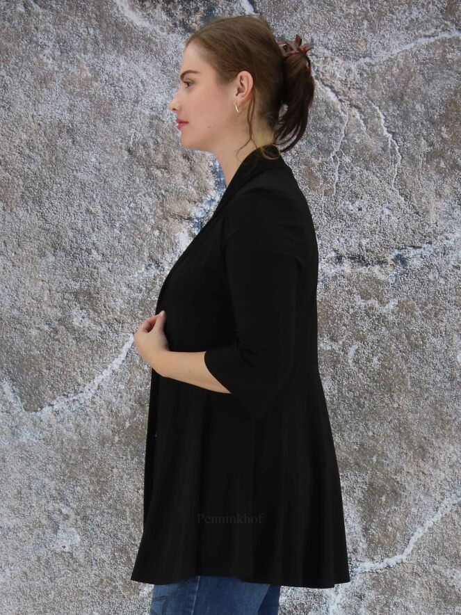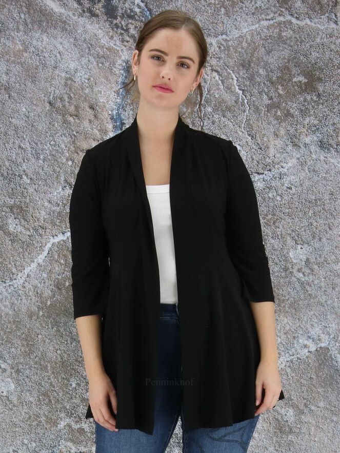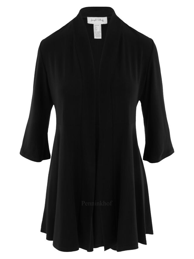 A cardigan from Joseph Ribkoff in the color black. In the waist at the back is a waist seam. The cardigan has a shawl collar, half-length sleeves and no closure. This vest can be washed by hand.