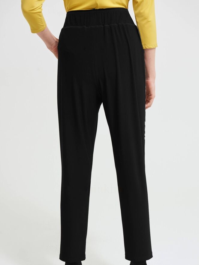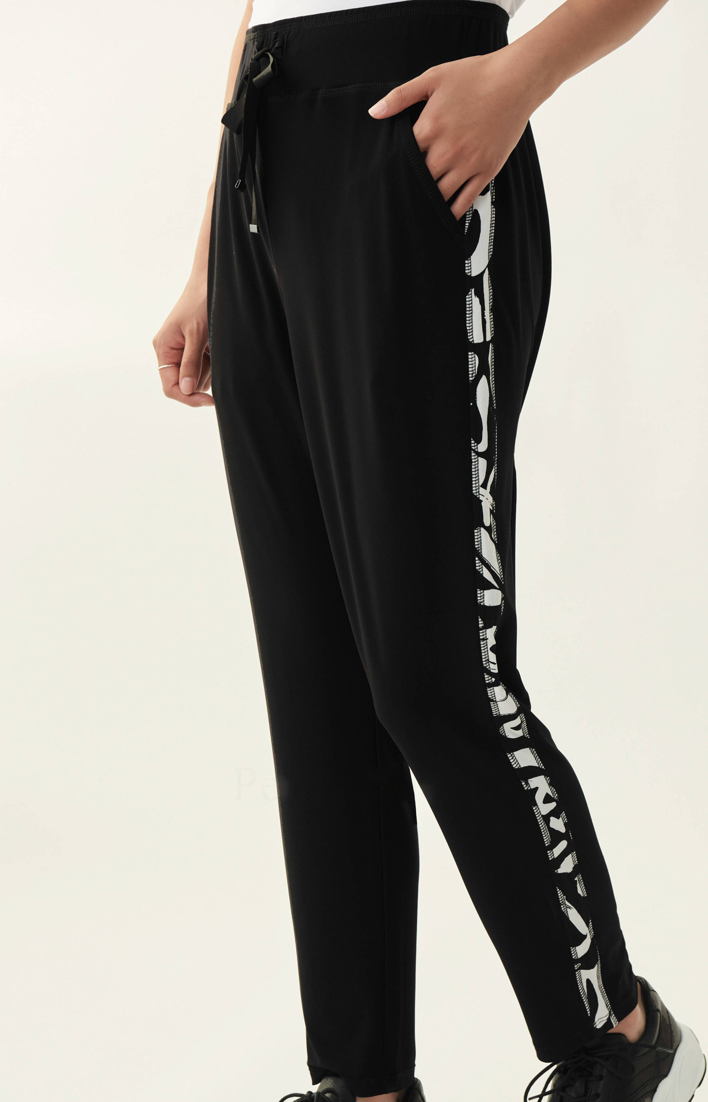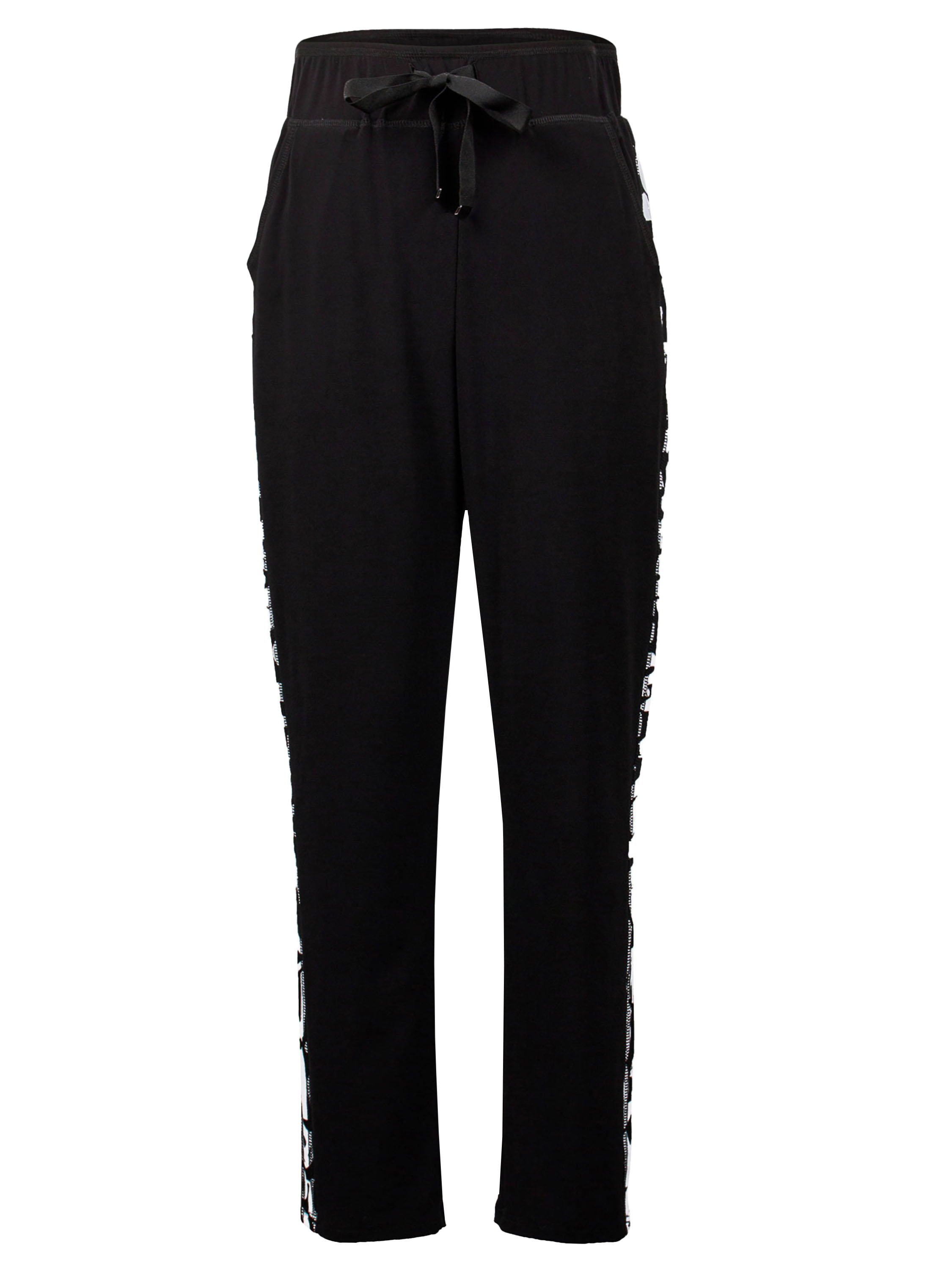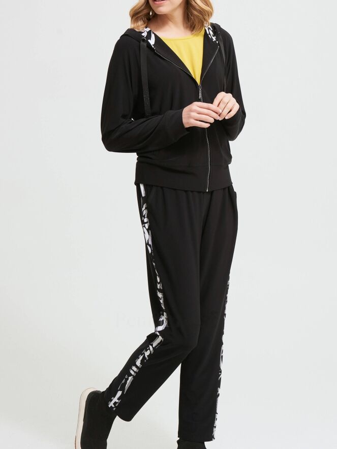 Jogging pants from Joseph Ribkoff in the color black. At the waist is a wide elastic band with a drawstring in a tunnel. On the sides of the legs is a trim with a graphic print in the colors black and white. These jogging pants can be washed by hand.